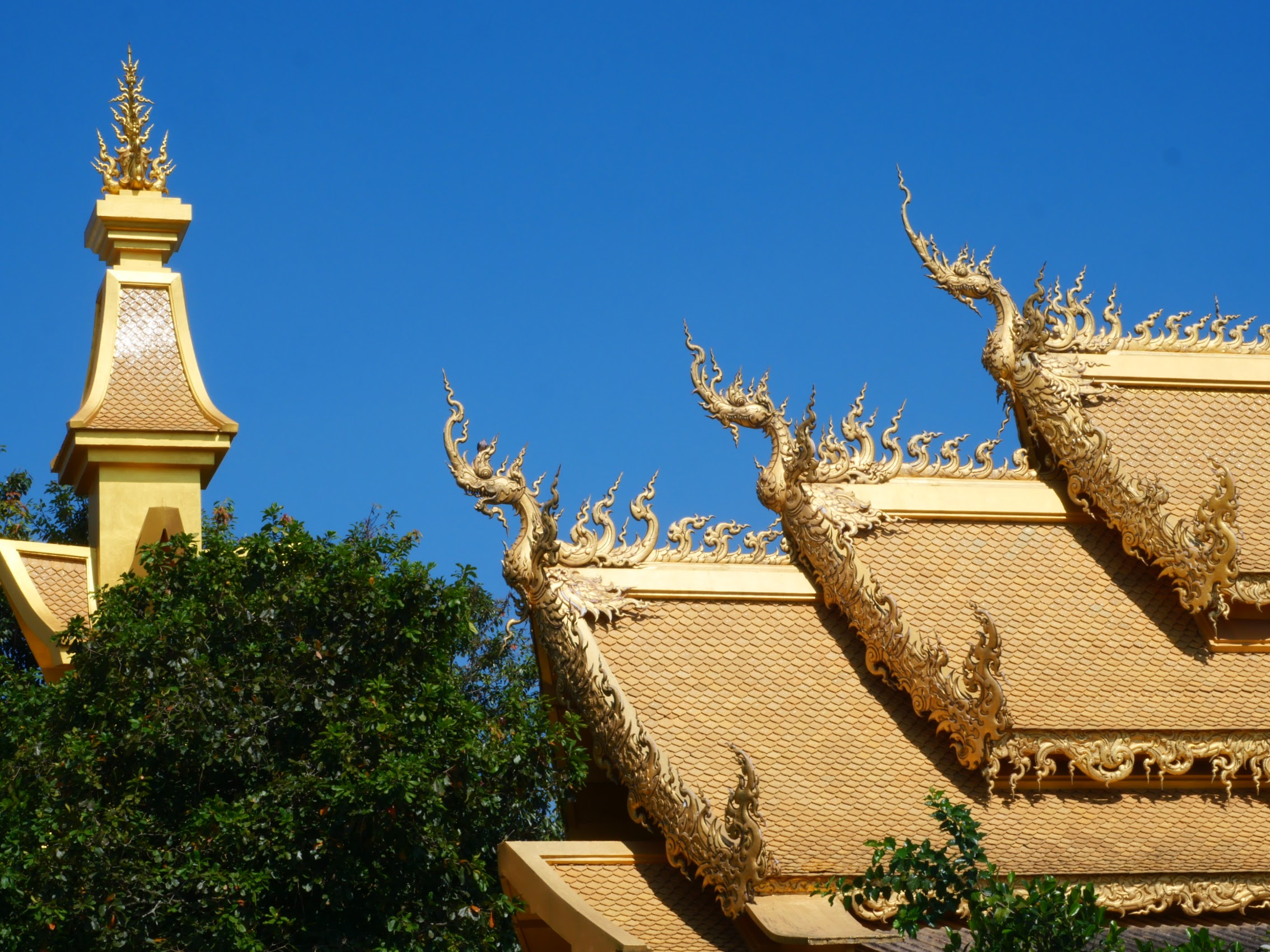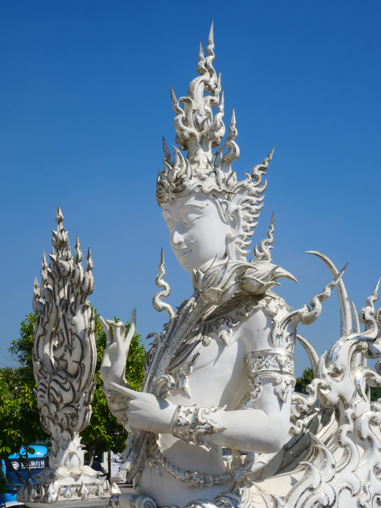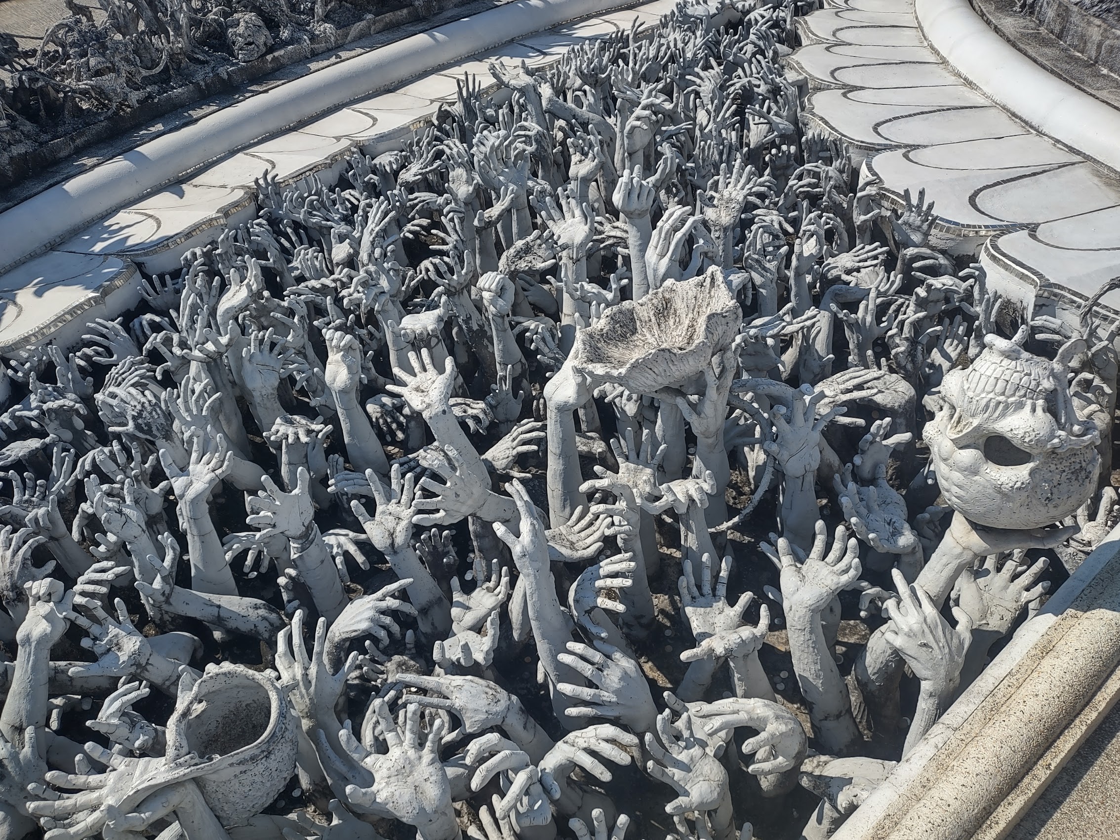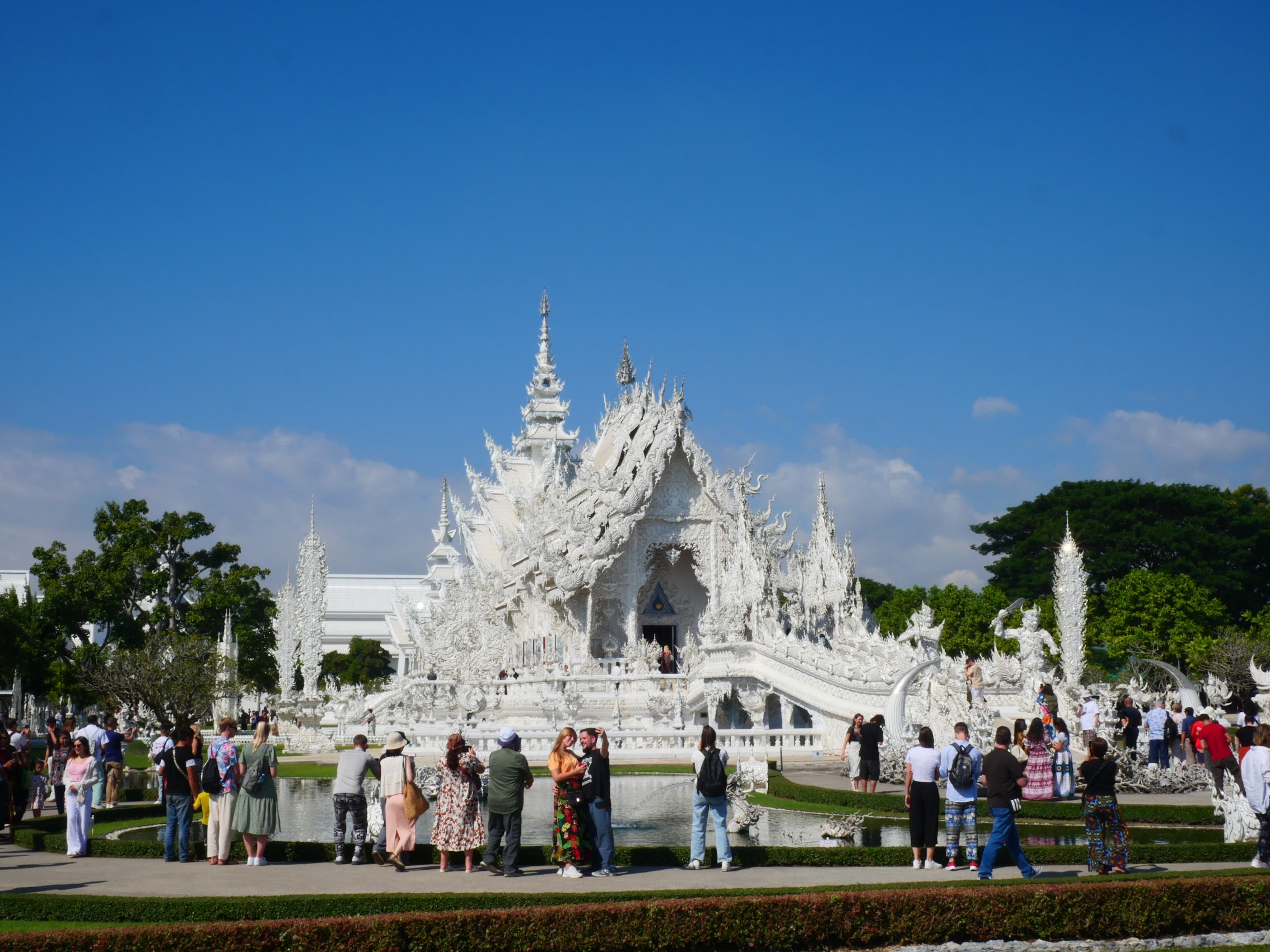 Our first stop was to Wat Rong Khun (commonly known as the White Temple) with a rather interesting and unique recent history. It seems that by the 1990s the original Wat Rong Khun had fallen into a state of extreme disrepair to the point that it was to be demolished. A local artist, Chalermchai Kositpipat proposed to rebuild the temple and fund the entire project with his own money (about $30M USD to date) and was somehow allowed to do so. The result is truly unique and a huge tourist attraction but also a bit controversial (at least for some).