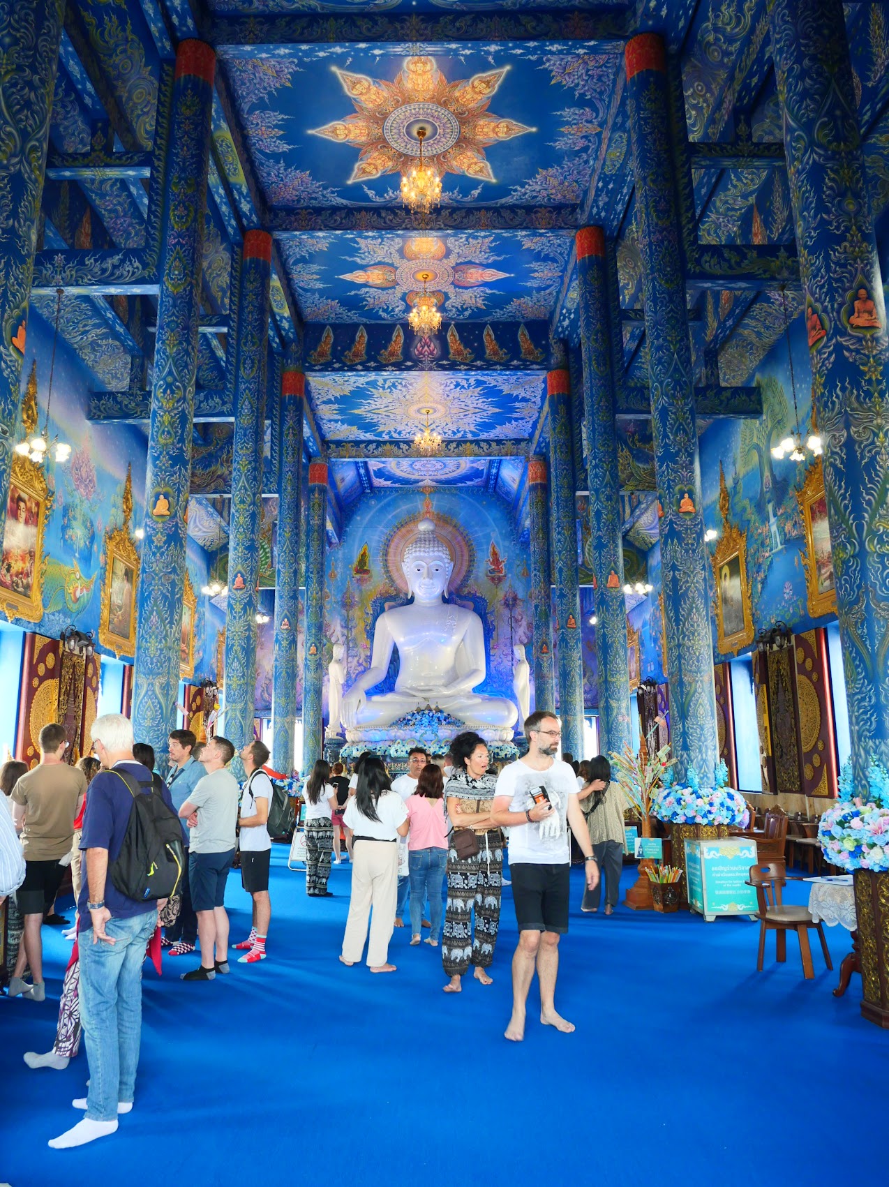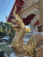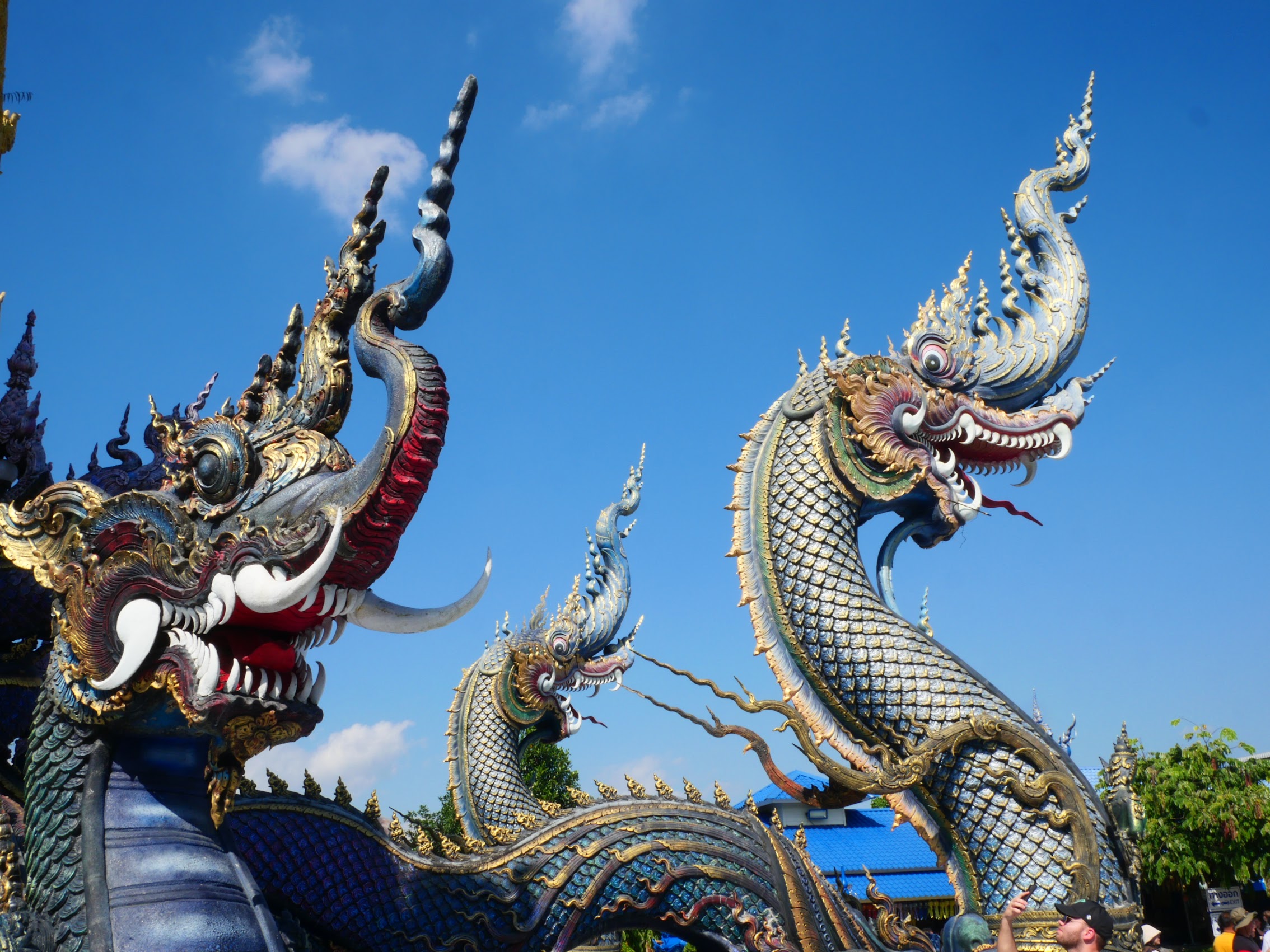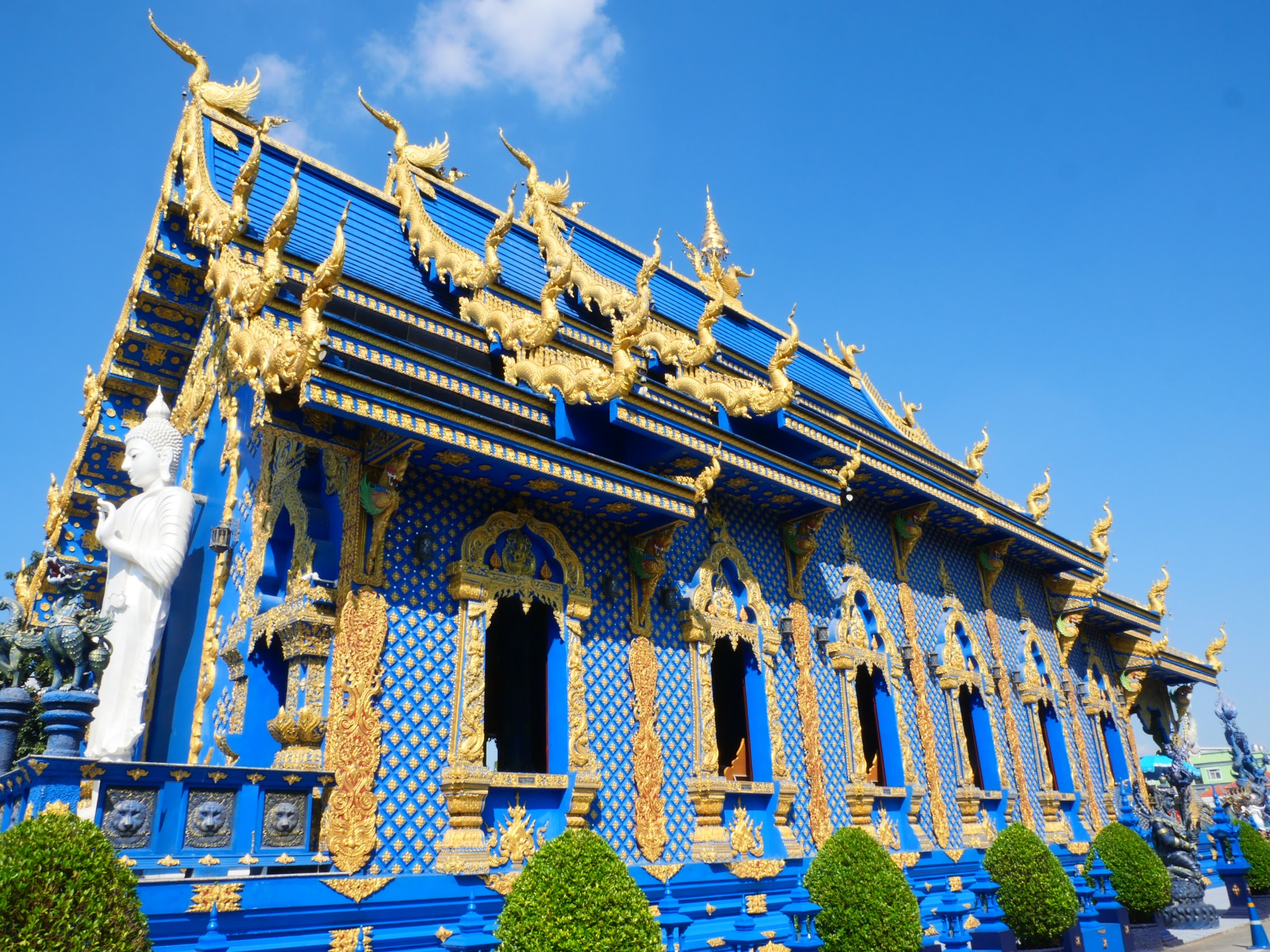 Our second stop was to the Wat Rong Suea Ten (Blue Temple), another contemporary temple which was designed by Putha Kabkaew, a student of Chalermchai Kositpipat. Like the White Temple, the Blue Temple replaced an older abandoned temple and represents a more contemporary design which incorporates many traditional features but with a much more colorful (mostly blue) and ornate treatment.