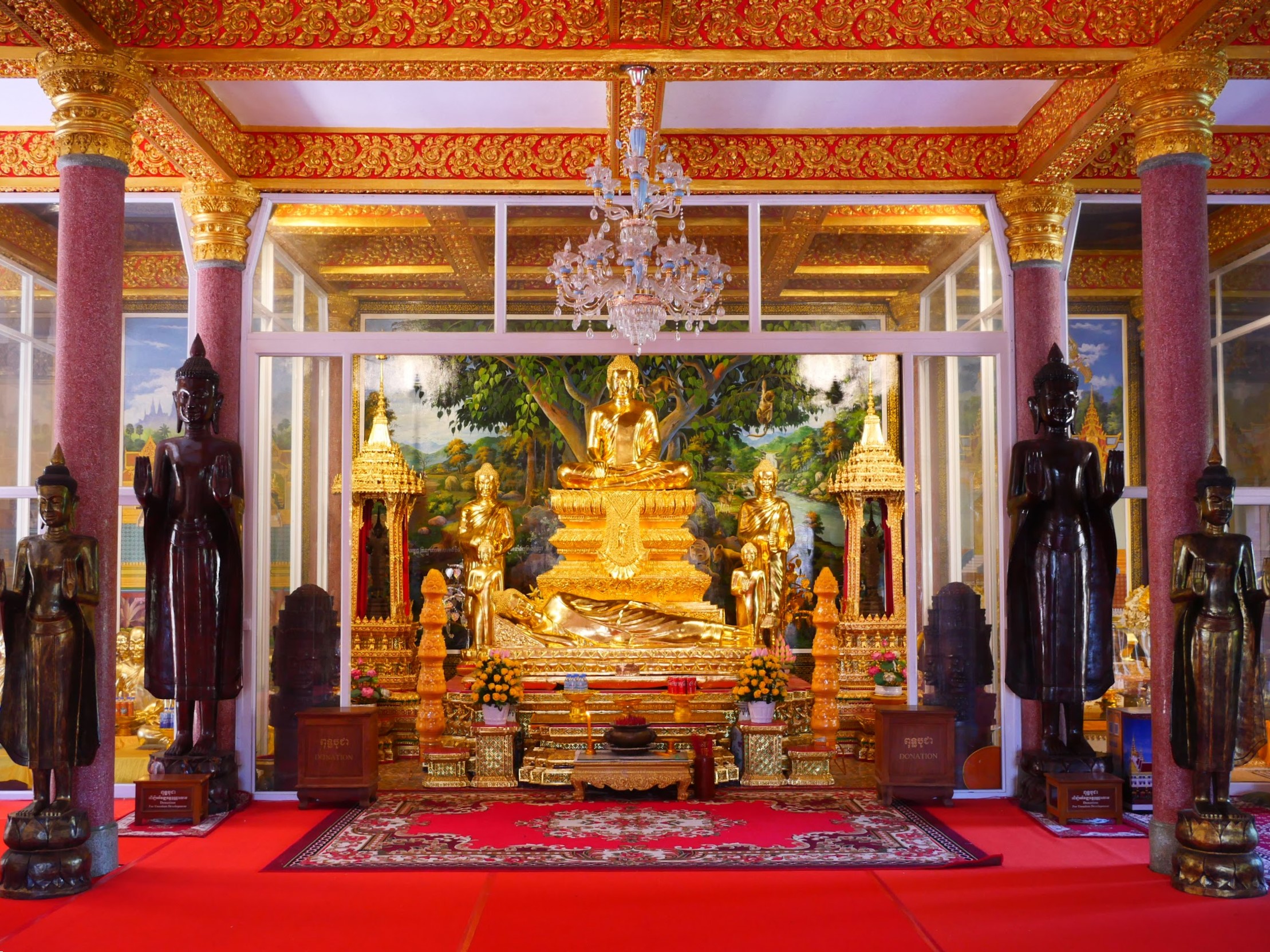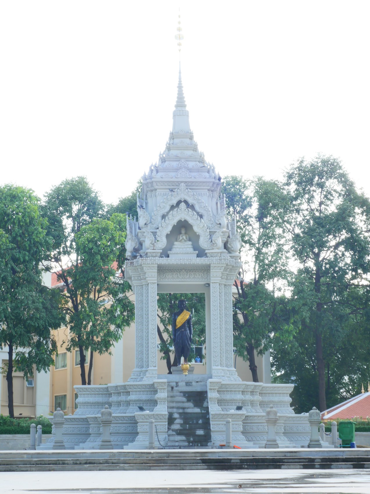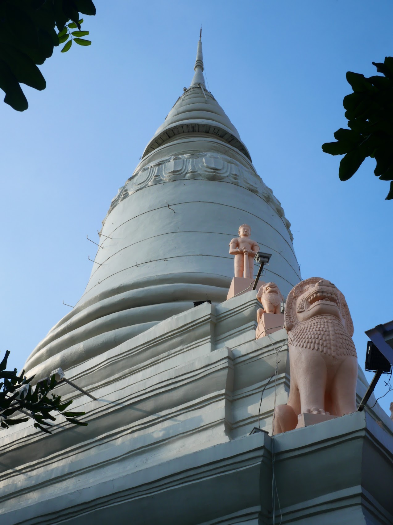 As I say, lots of history, but my favorite bit of Phnom Penh’s history is the story of its founding in 1372. According to legend, Daun Penh (“Daun” means “Grandmother” or “Old Lady” but, likely out of respect, she is most often referred to as “Lady” Penh), a wealthy woman living on the outskirts of a village in the vicinity of what is now Phnom Penh, one day came upon a Koki tree washed up on the banks of the Tonle Sap. Apparently, she intended to use the tree for fire wood, but when she examined it she discovered that it was hollow and found four Buddha statues of either brass, bronze, or marble (stories vary) as well as a statue of the Hindu god Vishnu holding a staff, snail, chain, lotus blossom, or some combination of these inside it (or maybe it was a fifth Buddha statue?). (Hey, it was 750 years ago, who remembers?)