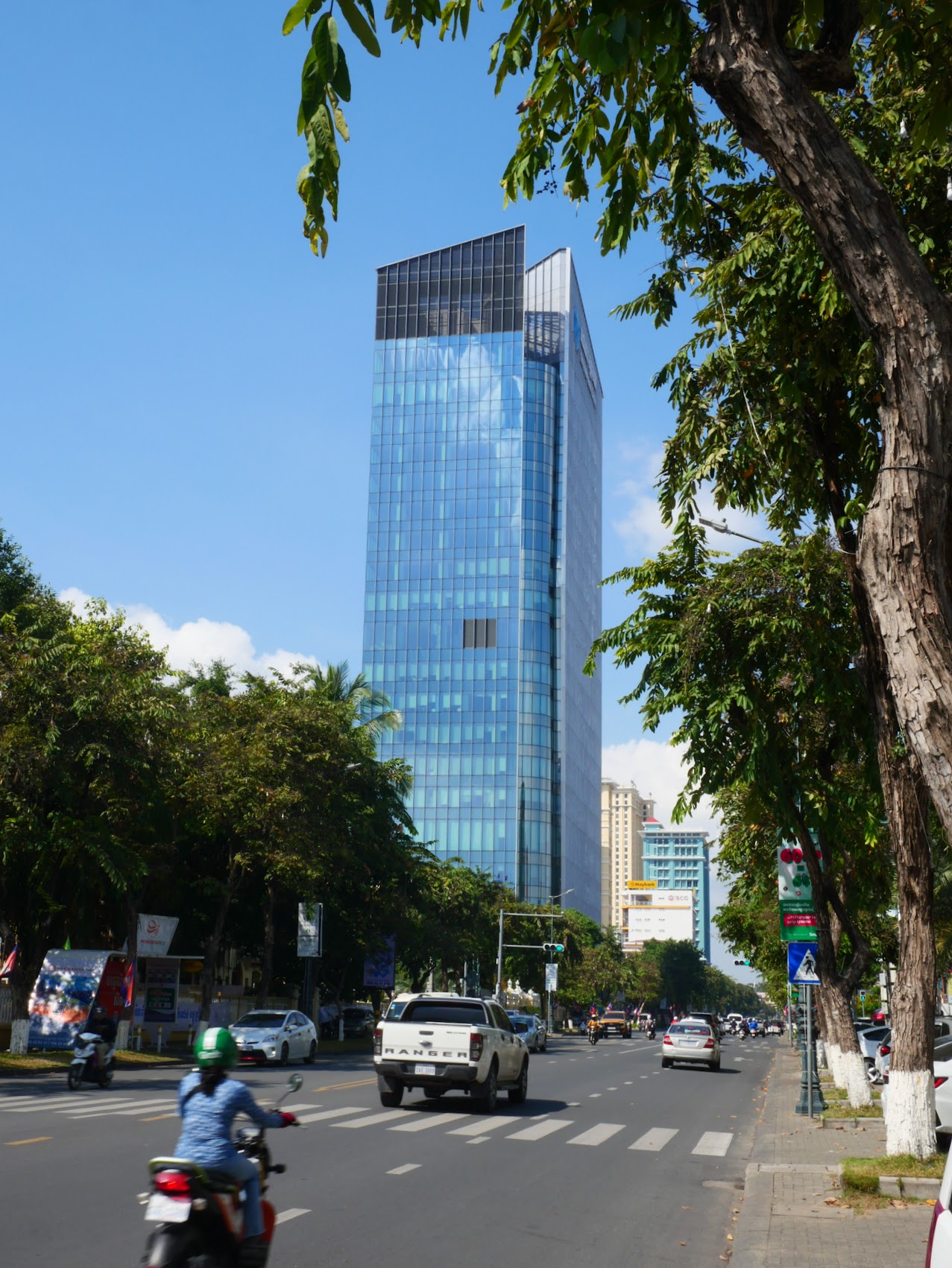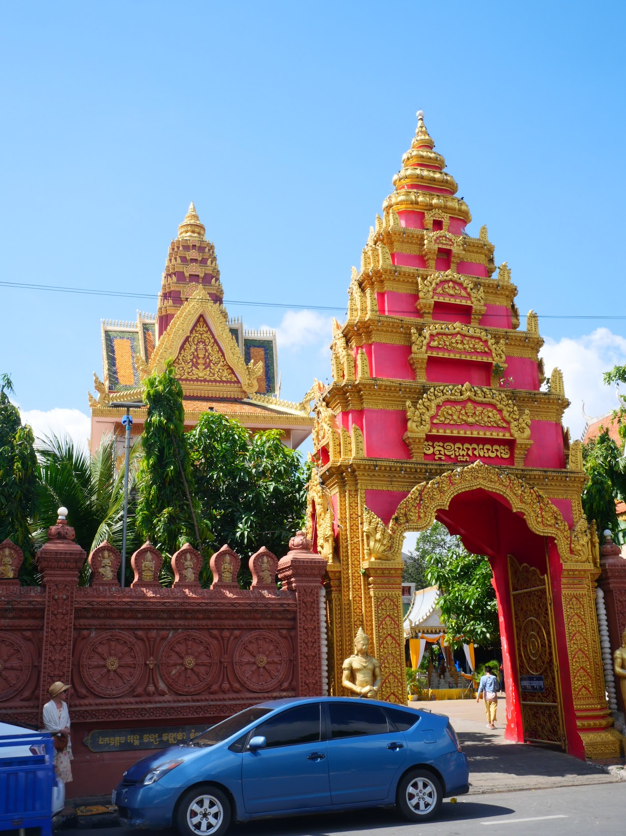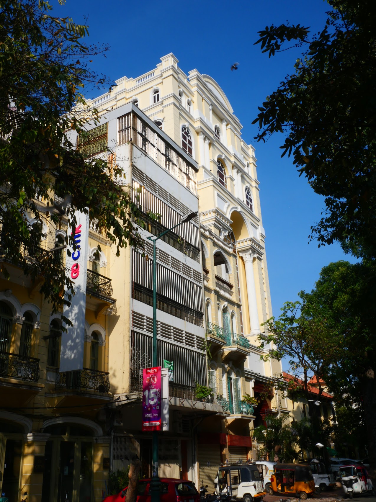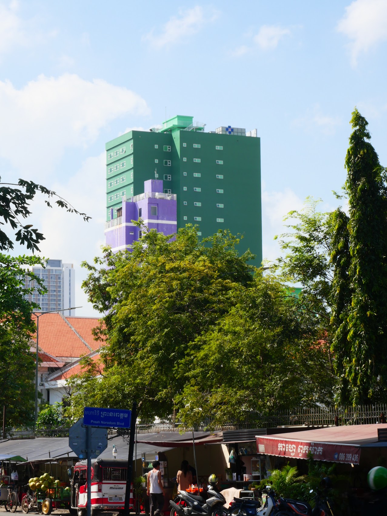 From the monument, we proceeded north on Preah Norodom, one of the Phnom Penh’s major boulevards which runs from the Independence Monument to the Wat Phnom Pagoga on the northern edge of the city center. Along the way we saw an interesting variety of buildings, new and old, large and small, beautiful and otherwise. We even saw a nine-story elementary school (one grade per floor?). For me there was something very appealing about this mélange of architecture.