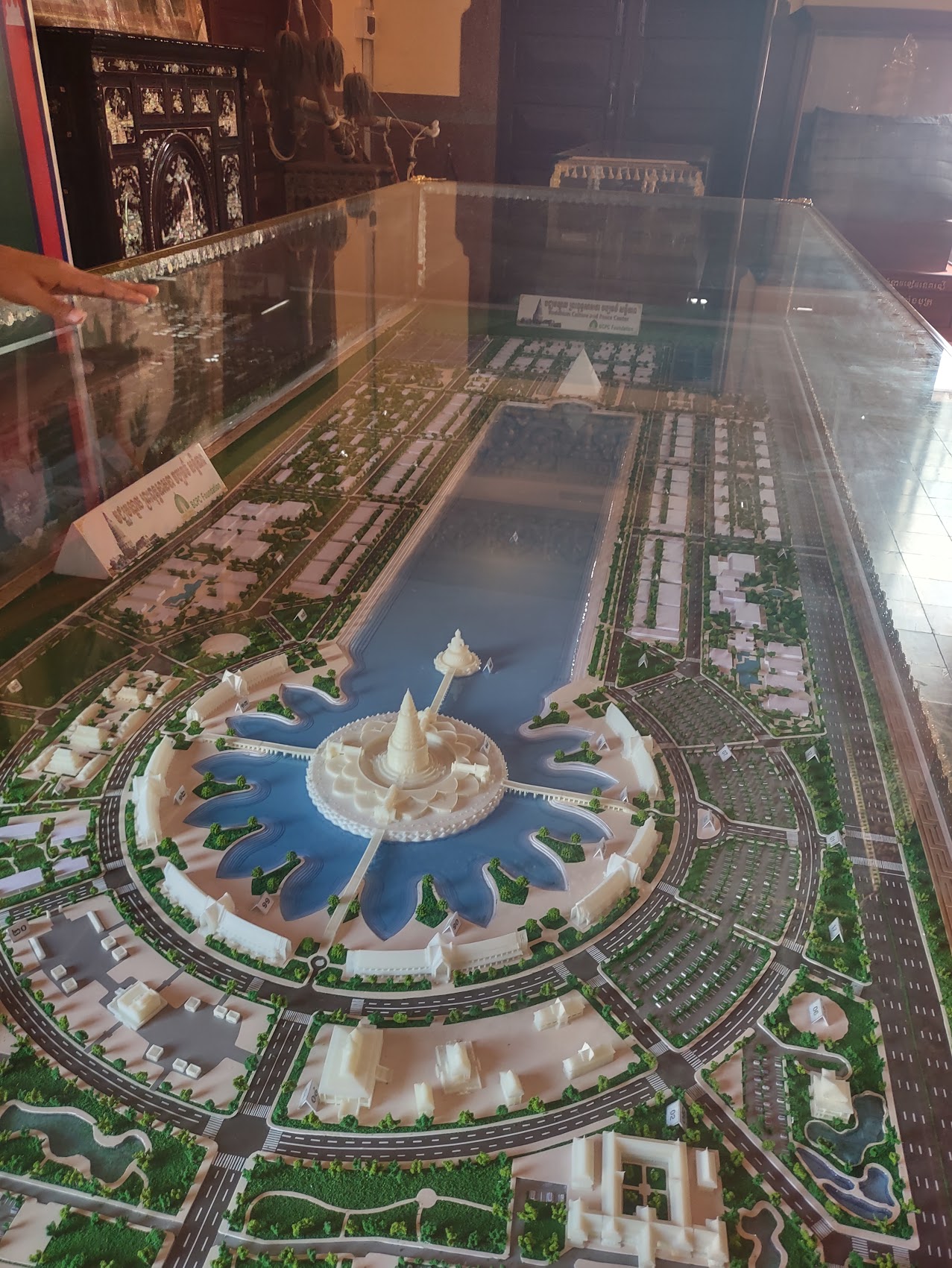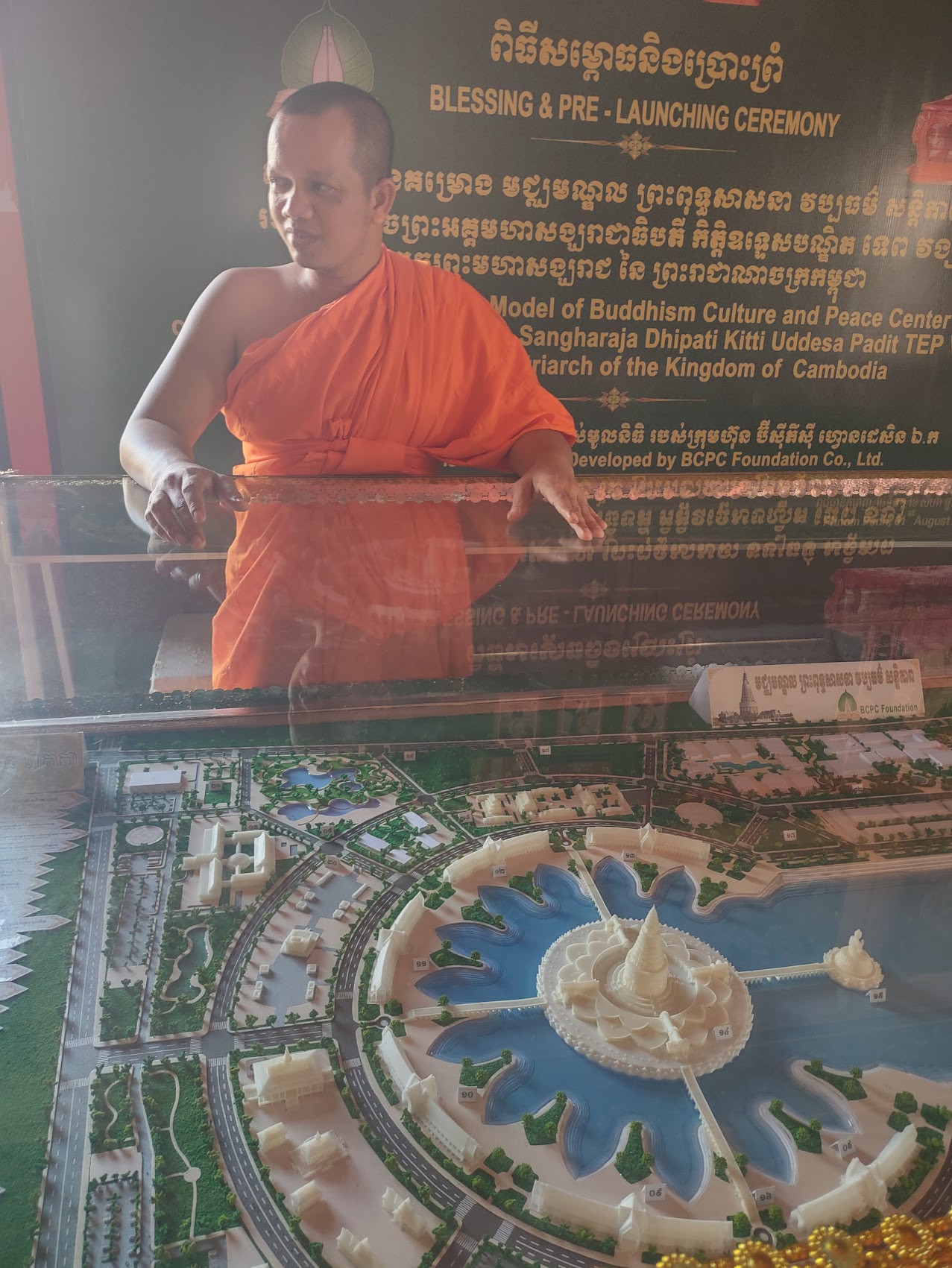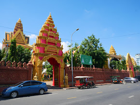 On our first full day in Phnom Penh, we had a self-guided walking tour planned, about a five-mile loop, which hit some of the key places we had identified to visit in downtown Phnom Penh and which we hoped would provide a nice cross-section of the city. From our place, we proceeded south to our first planned stop, the Royal Palace. Along the way we made an unscheduled stop at the Wat Ounalom Monastary which had a beautiful temple and where a young monk showed us drawings and model for an enormous mega-temple complex which it appeared would rival the Wat Phra Dhammakaya which we had visited in Ayutthaya. (I am quite curious to see if they are able to raise the necessary funds to actually build the place.)