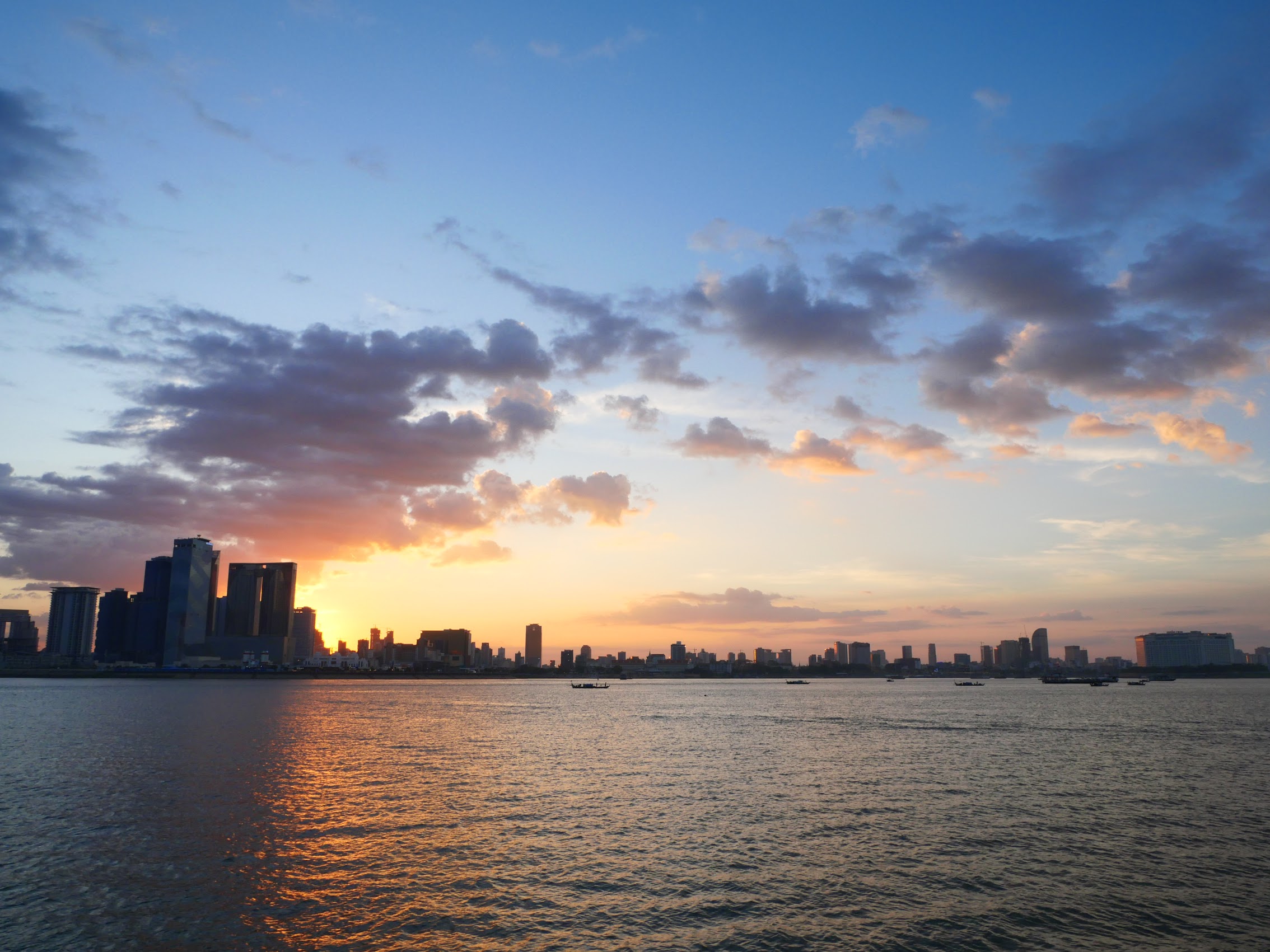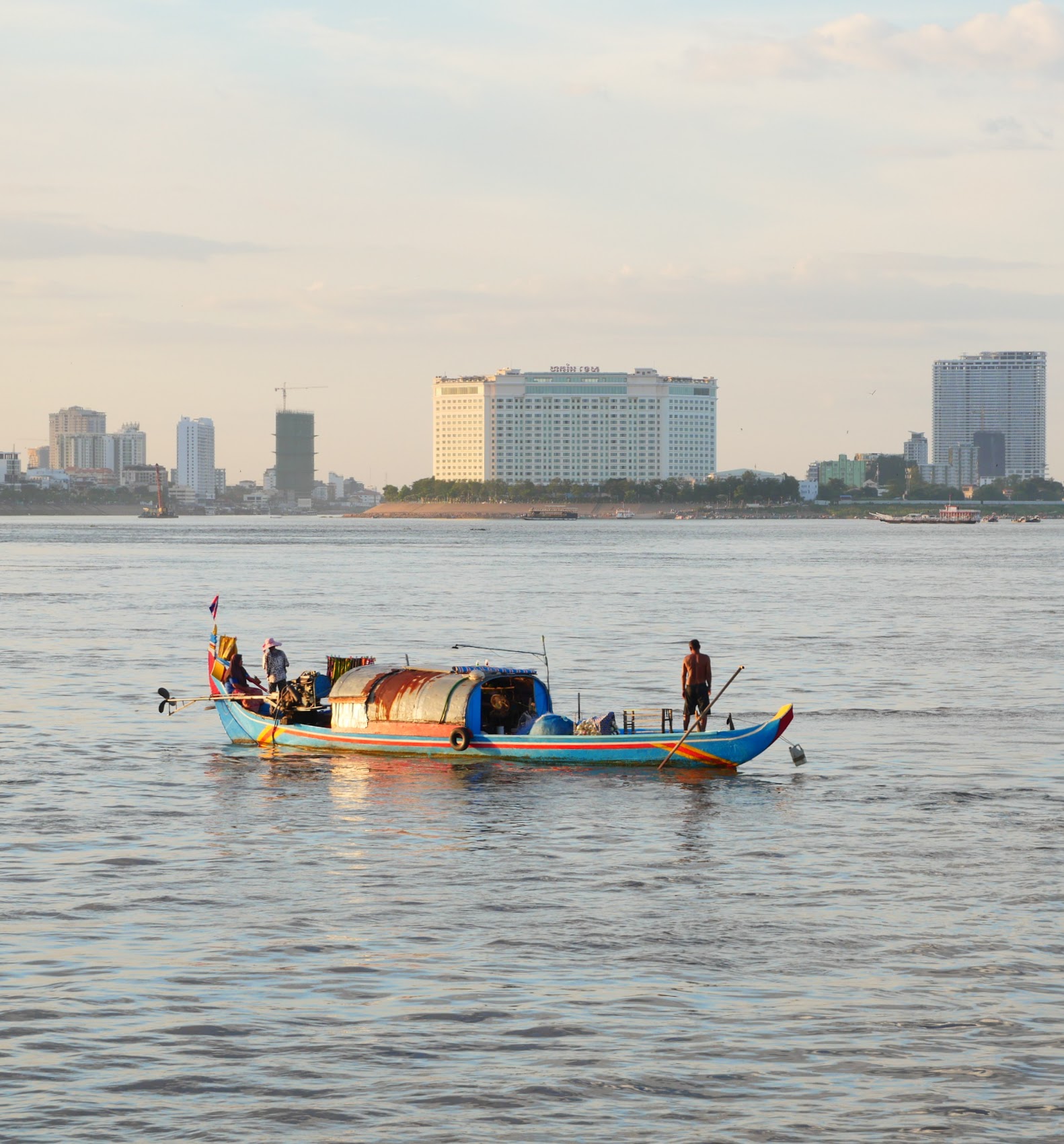 We cruised down the Tonle Sap river past Silk Island and then back up the Mekong. Along the way we saw some other river traffic which included some local fishing boars as well as other river cruise boats (all pretty crowded compared to ours). We also saw some ramshackle villages on the far bank of the Mekong which stood in sharp contrast to the city of Phnom Penh which was actually quite interesting and beautiful to see from a distance, particularly once the sun began to set behind it.