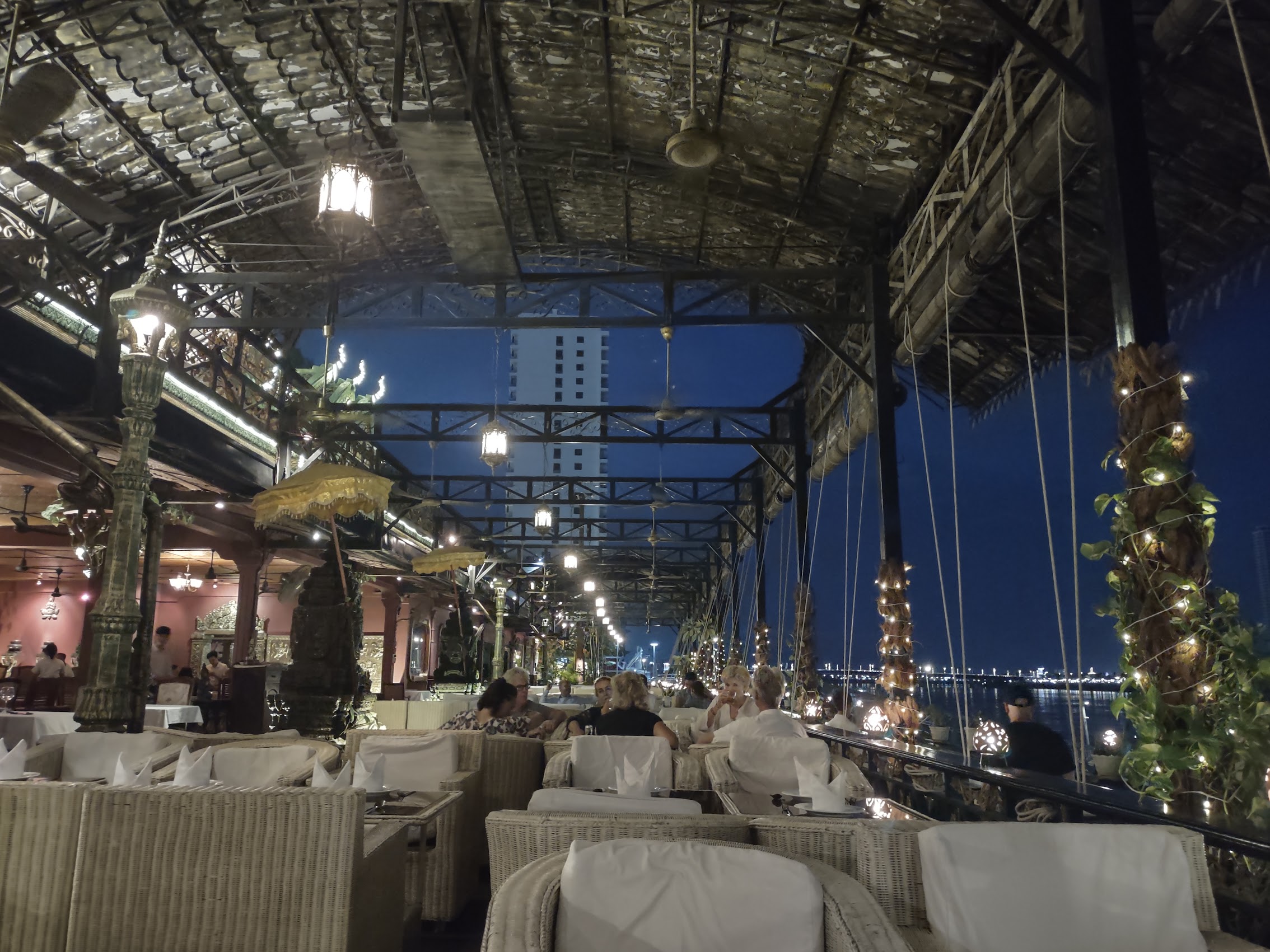 We stopped for drinks at a timeless hotel restaurant called The River Bistro with a large open-air seating area and a multi-cultural clientele which appeared to include quite a few western tourists and ex-pats (there seemed to be one of these on every corner along Preah Sisowath Quay). The place had a very post-colonial vibe to it and it was easy to imagine that it was much like this fifty years ago before all the bad things started happening.