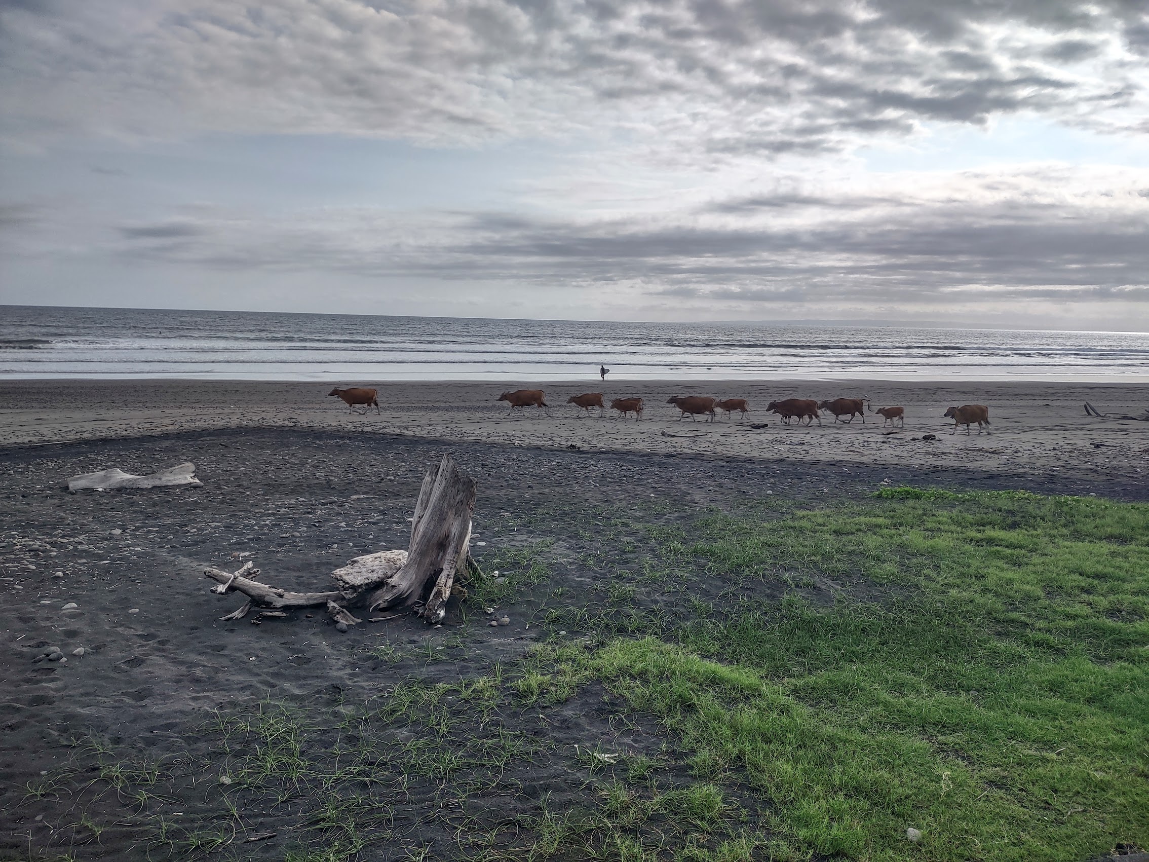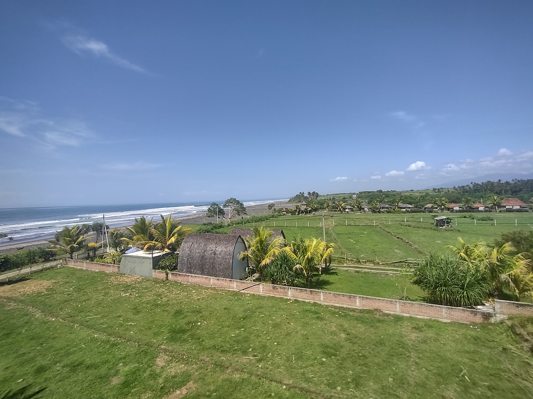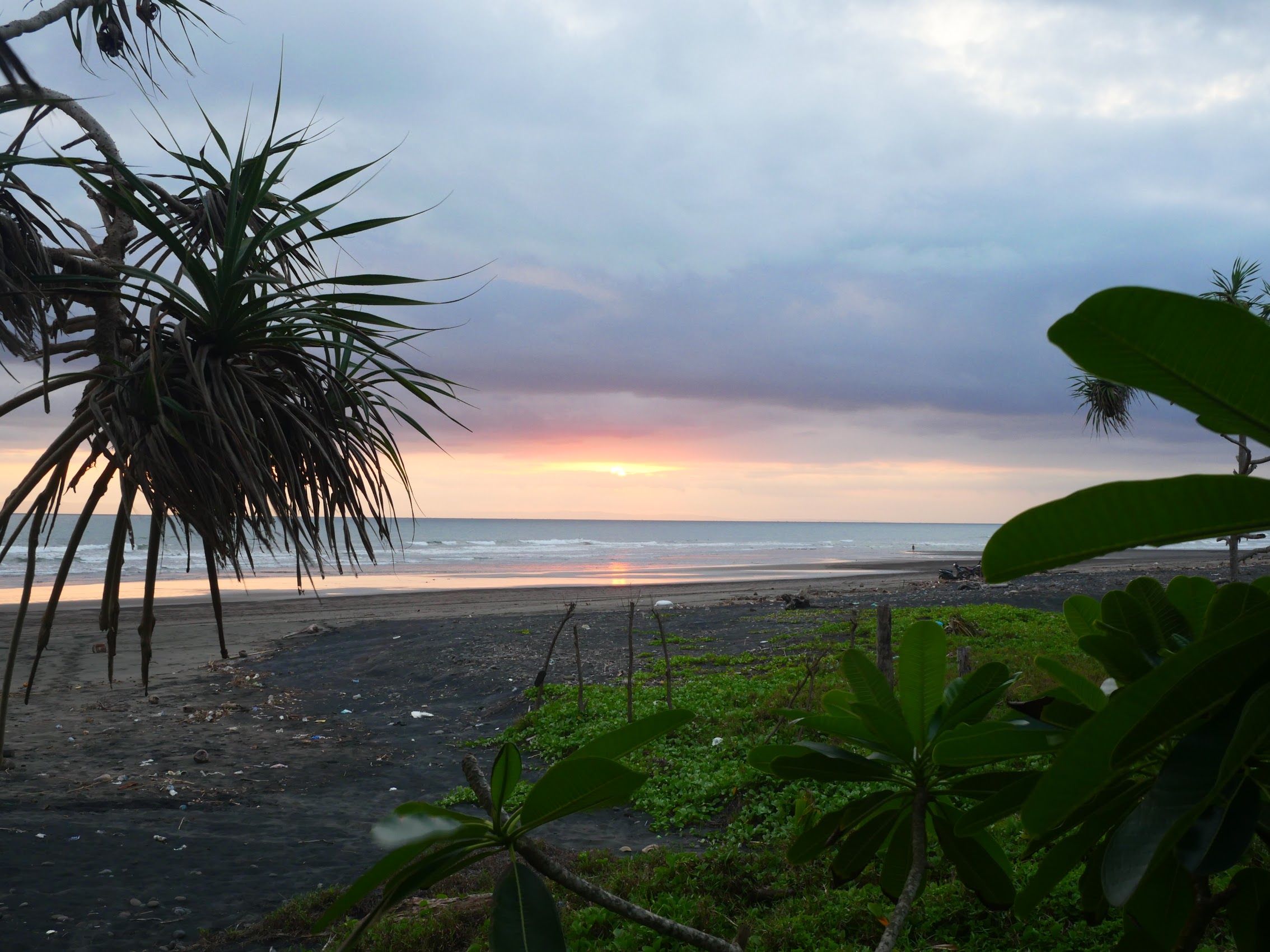 Our first stay in Bali was at a place called Sunsets on Sumbul. on Sumbul Beach, just a bit north of Medewi Beach a highly regarded but off-the-beaten-track surf spot famous for its very long left-hand break. Sunsets on Sumbul was located at the end of a narrow beach road with the ocean on one side and rice paddies rising up the hill with the mountains beyond on the other side. There were a few small resorts and restaurants down the beach road in the other direction and the nearby village of Pulukan was a medium length walk up the hill back to the main road.