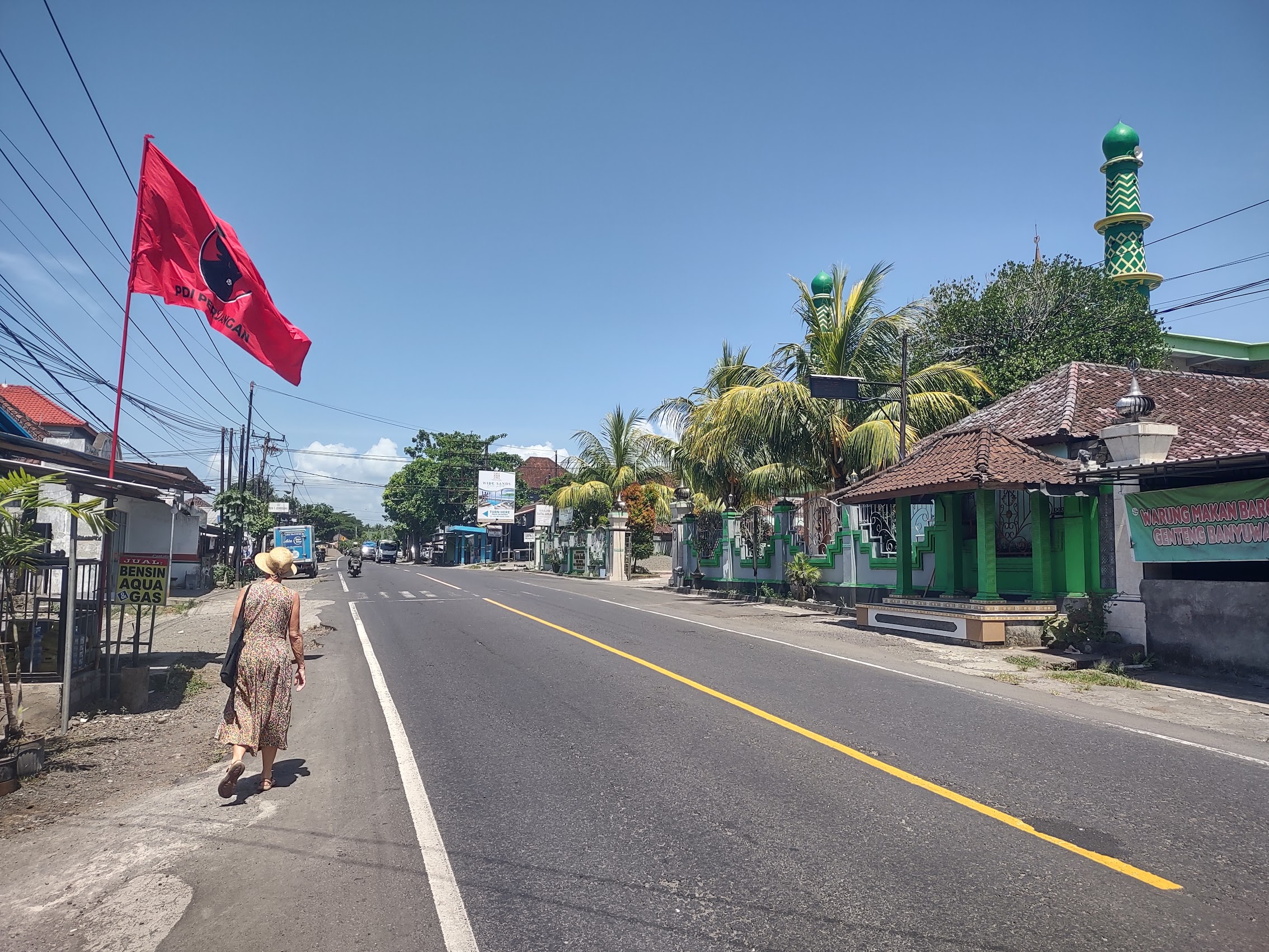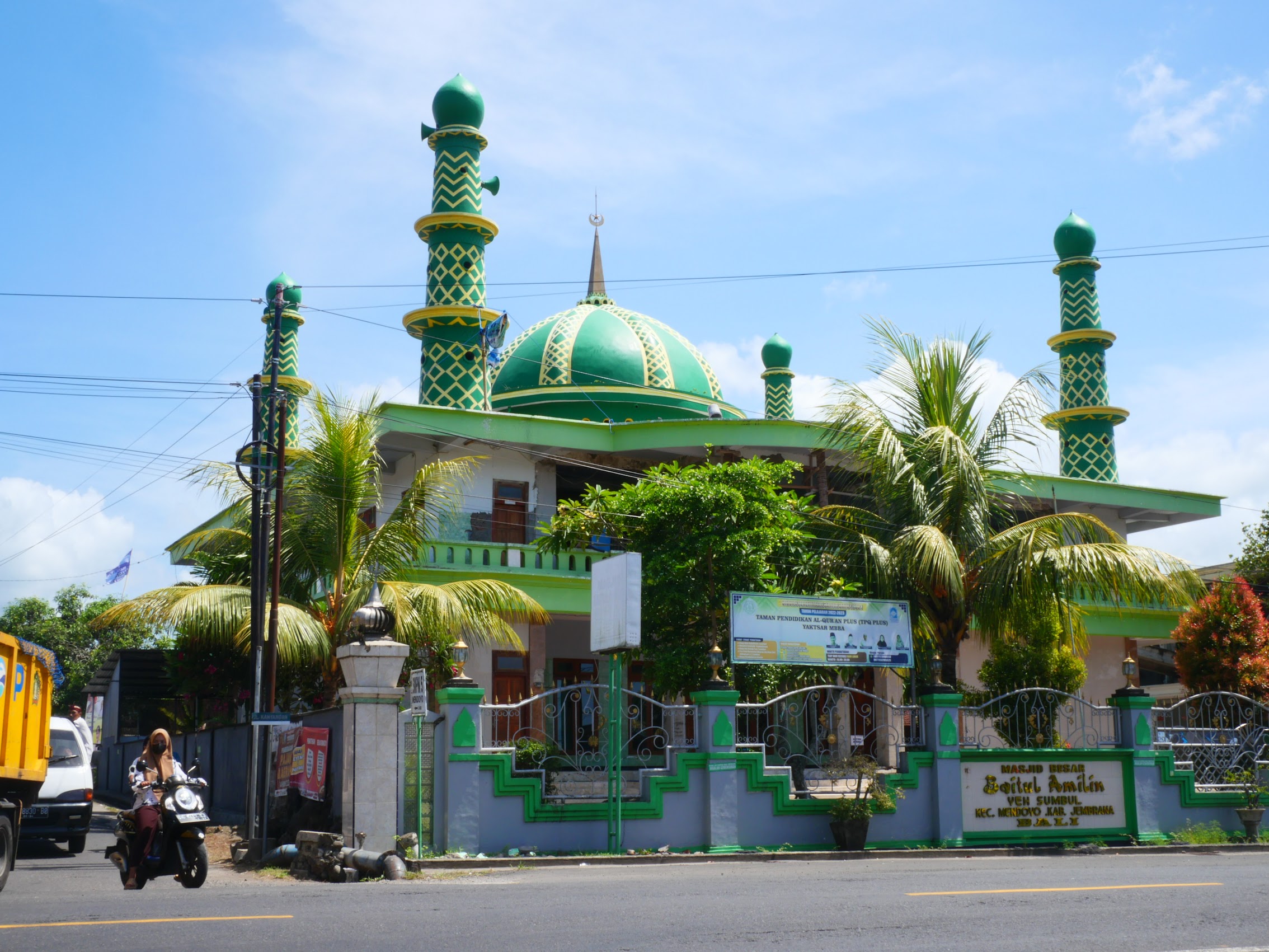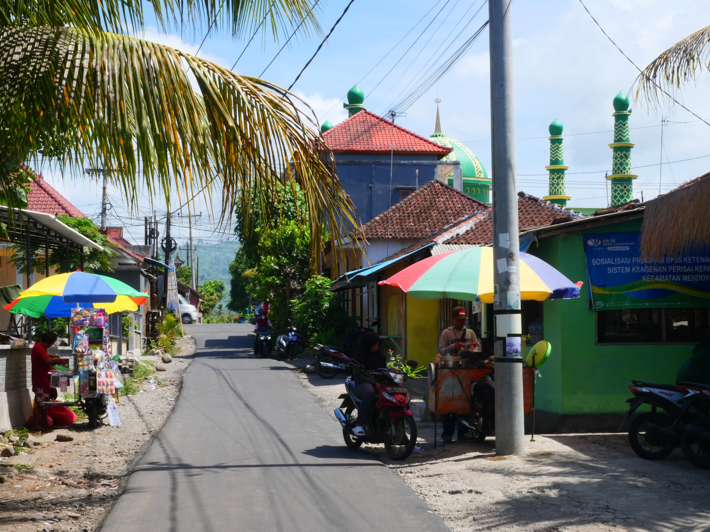Along the way, we saw a lot of temples and many small shrines – a reminder that unlike most of Indonesia, Bali is mostly (about 80%) Buddhist. But we did also see some mosques, including a small but beautiful one in the village of Pulukan near where we were staying (I think I might have gone with a different color than green).