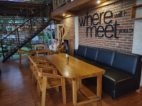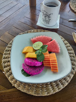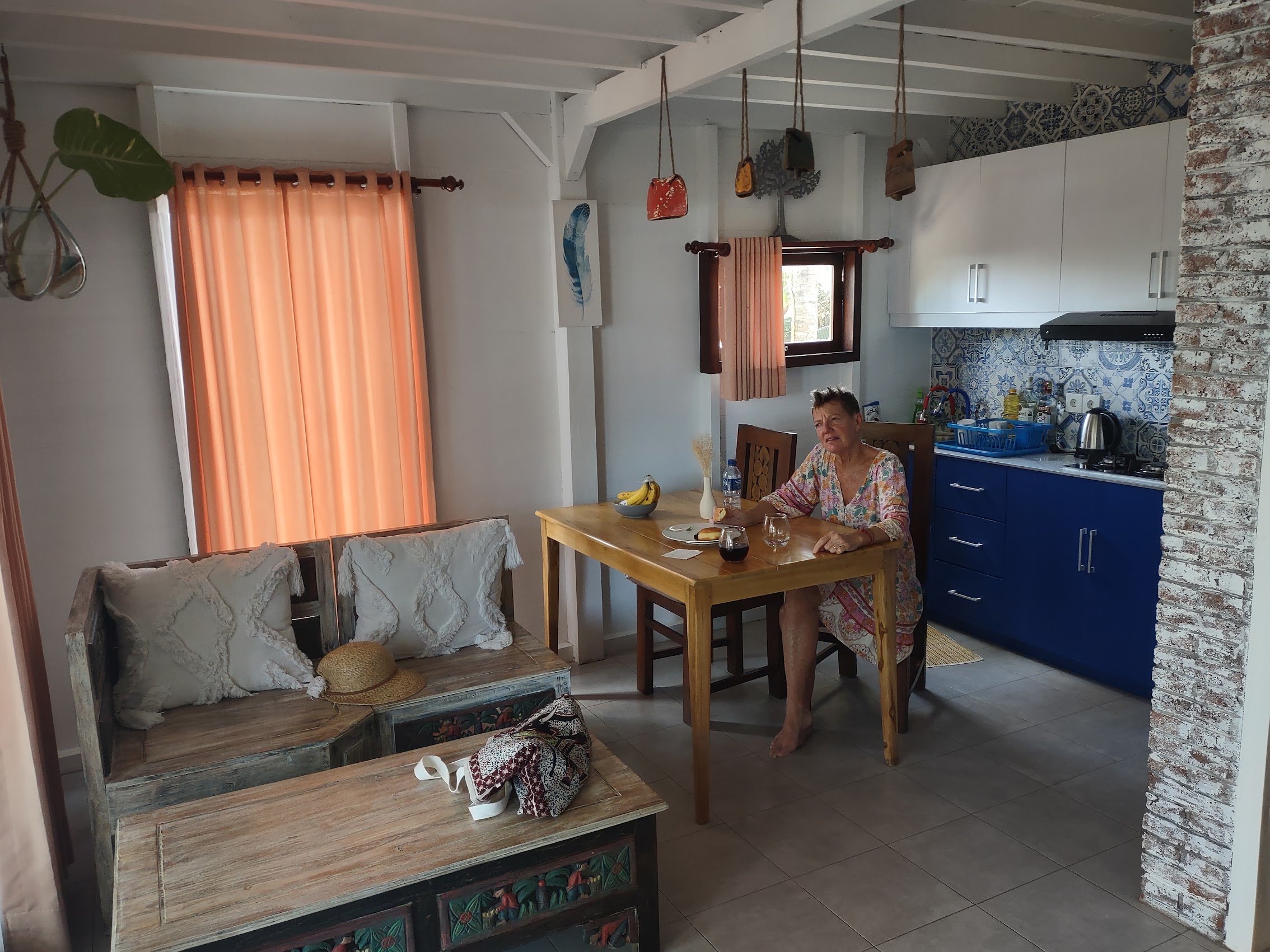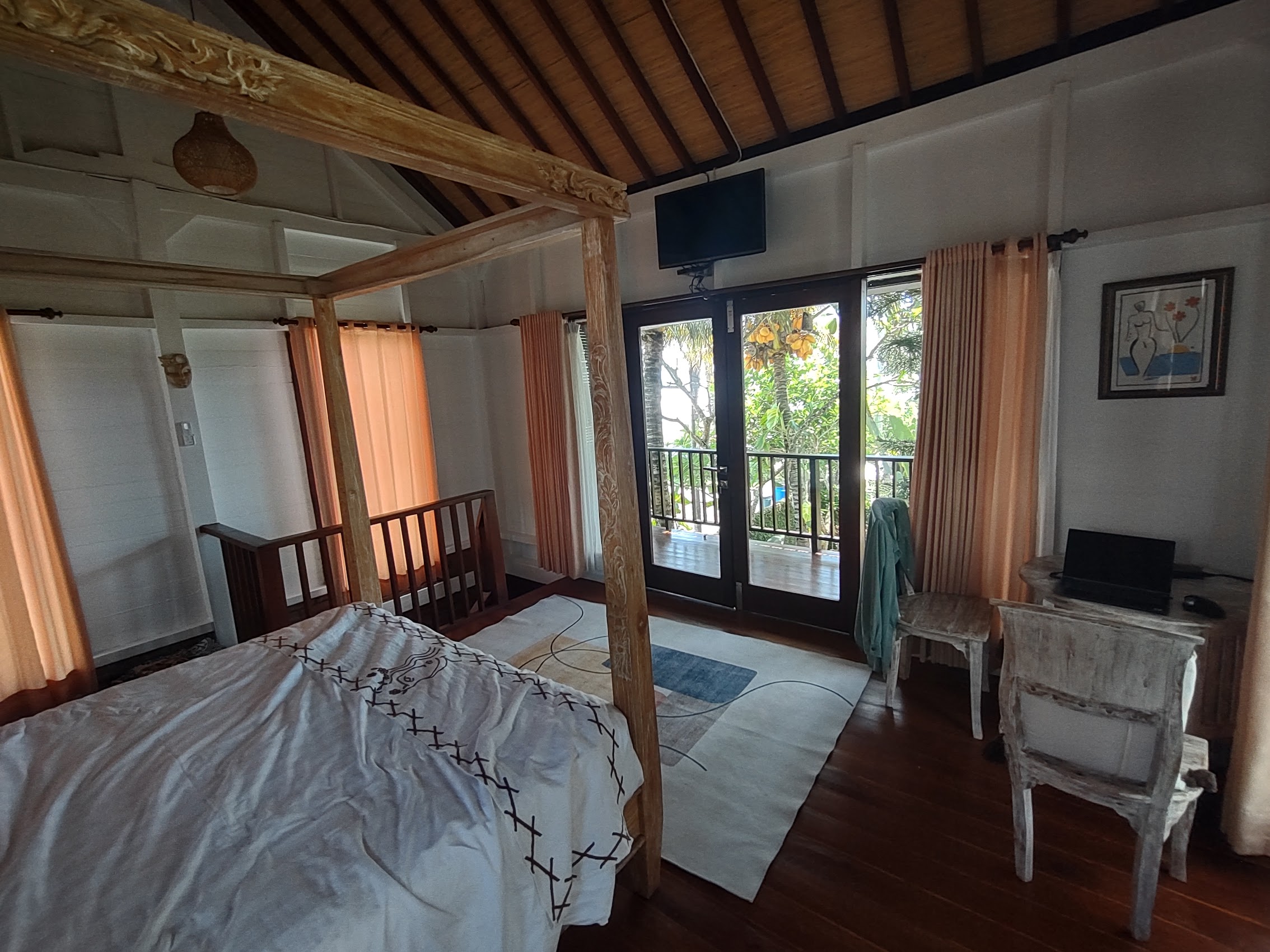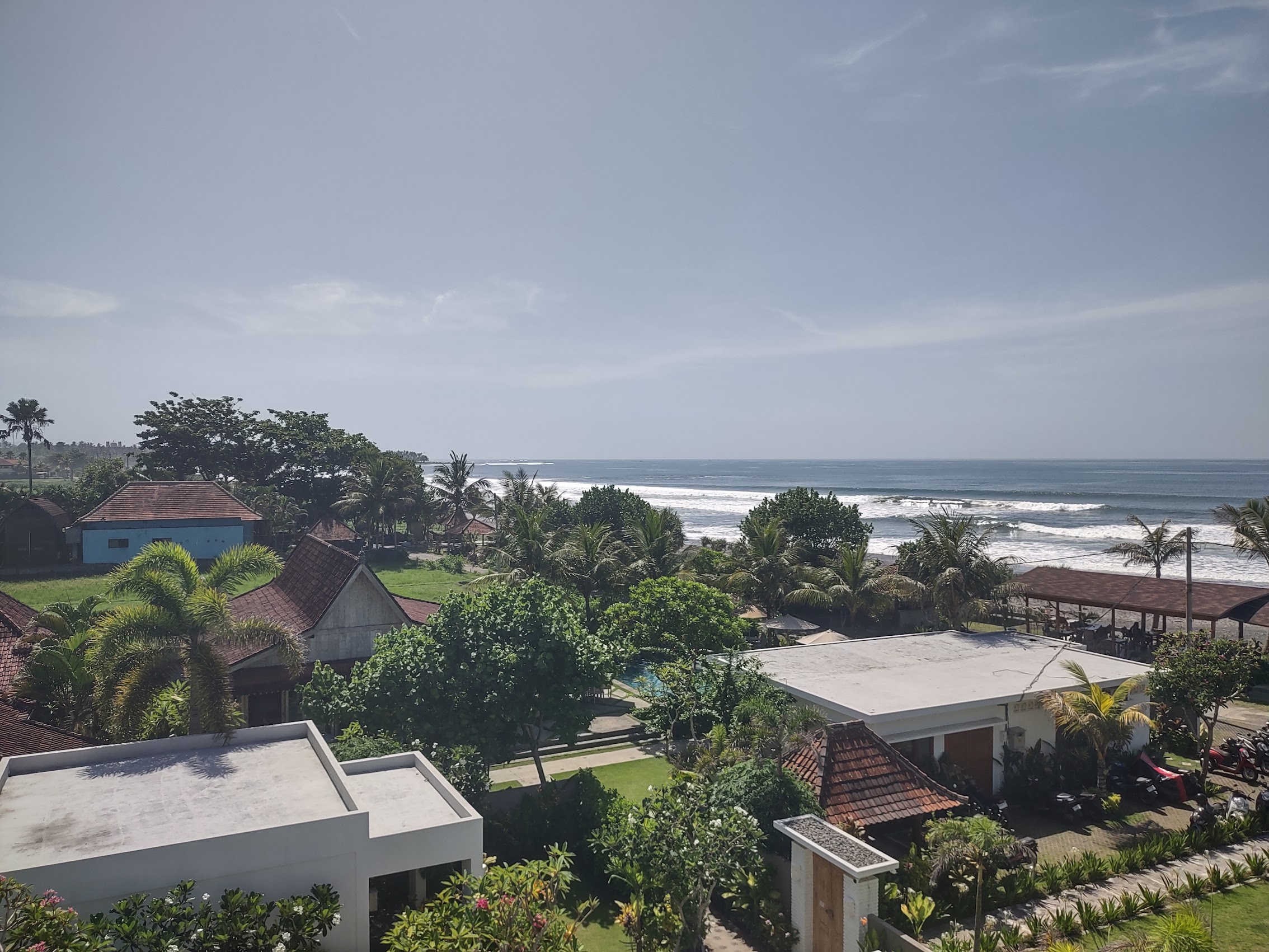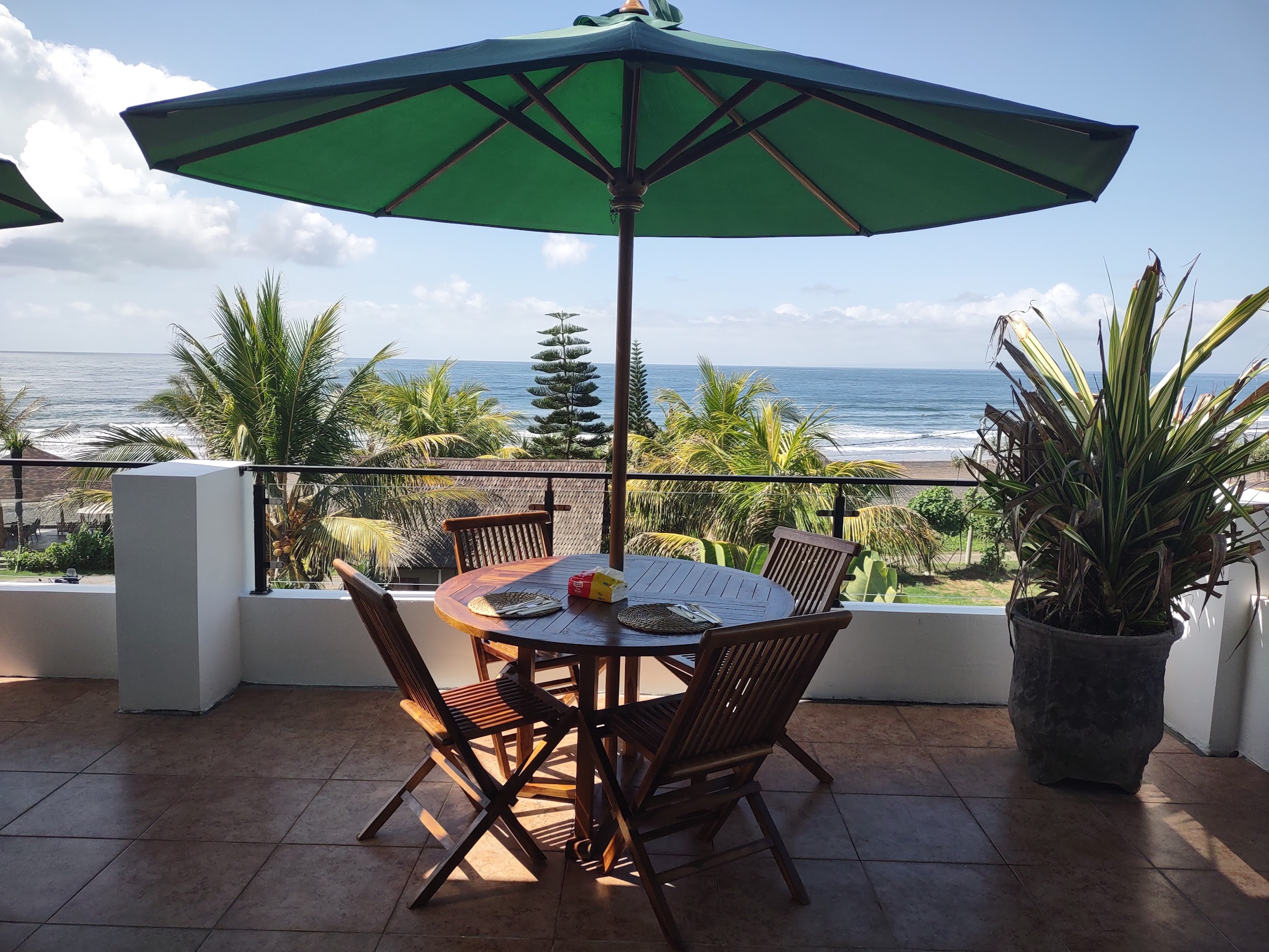 Our place was a nice stand-alone little house with living/dining, kitchen, and bath on first floor and bedroom on the second floor. Our house had a nice covered porch out front, a covered balcony off our bedroom, both of which provided beautiful ocean views as well as views of Java when it was clear, not to mention some beautiful sunsets.