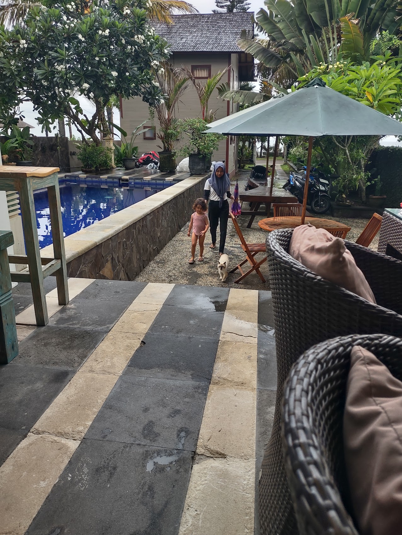 Our host Rafi and her family, who were wonderful hosts, lived in the house behind ours and we enjoyed a great breakfast every morning taking in the views from the third floor of their homestay. One of our small but amusing daily pleasures was watching Rafi’s youngest daughter taking her daily morning walk out to the beach with her nanny and her Siamese cat tagging along.