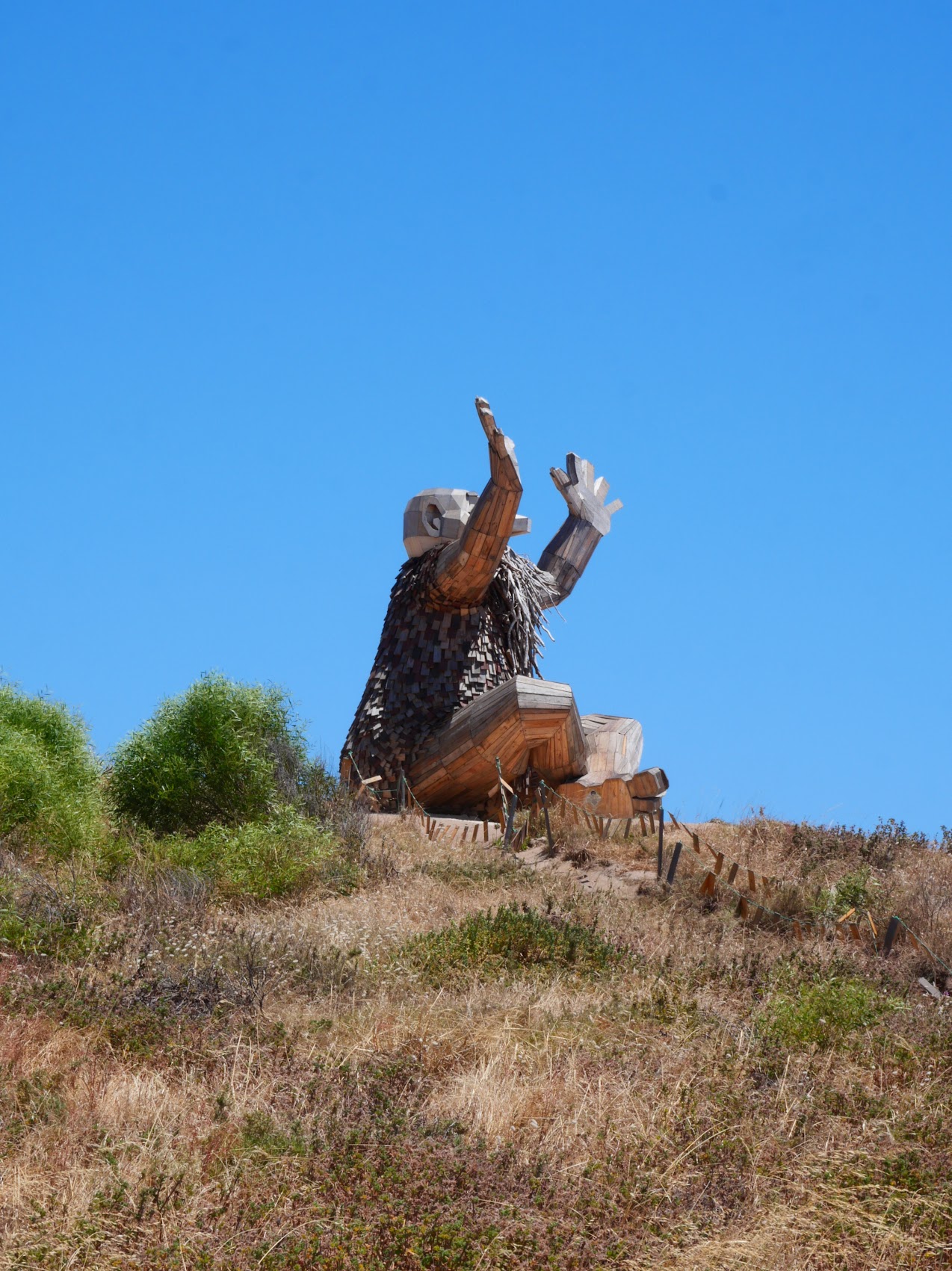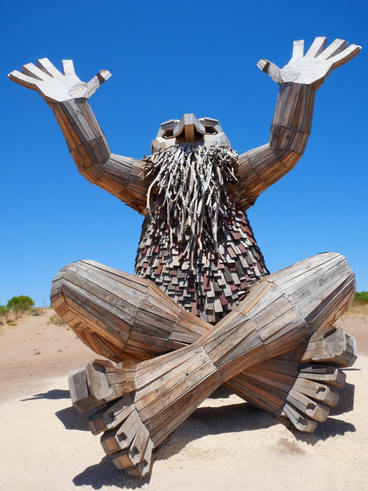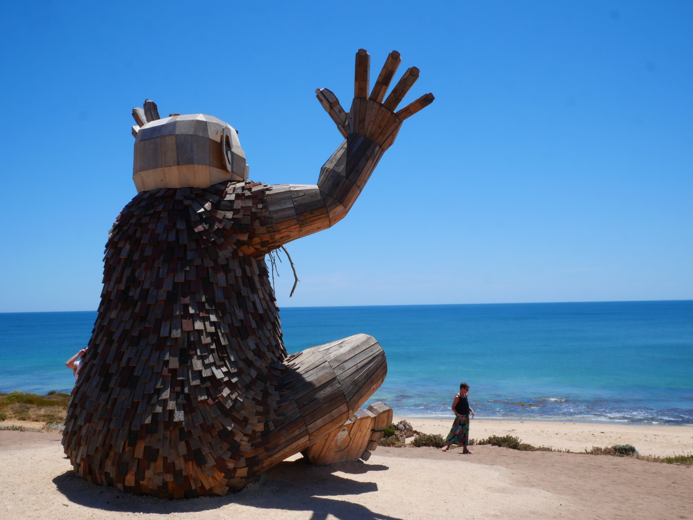We had one planned stop on our way to Gnarabup in Mandurah, a sea-side town about an hour south of Perth which is known for a series of wooden plank sculptures known as “The Giants of Mandurah”. The Giants are the work of Danish sculptor Thomas Dambo whom we suspected (and later confirmed) is also the creator of similar sculptures Colleen had seen on one of her “Sisters of the Travelling Pants” trips to Maine.