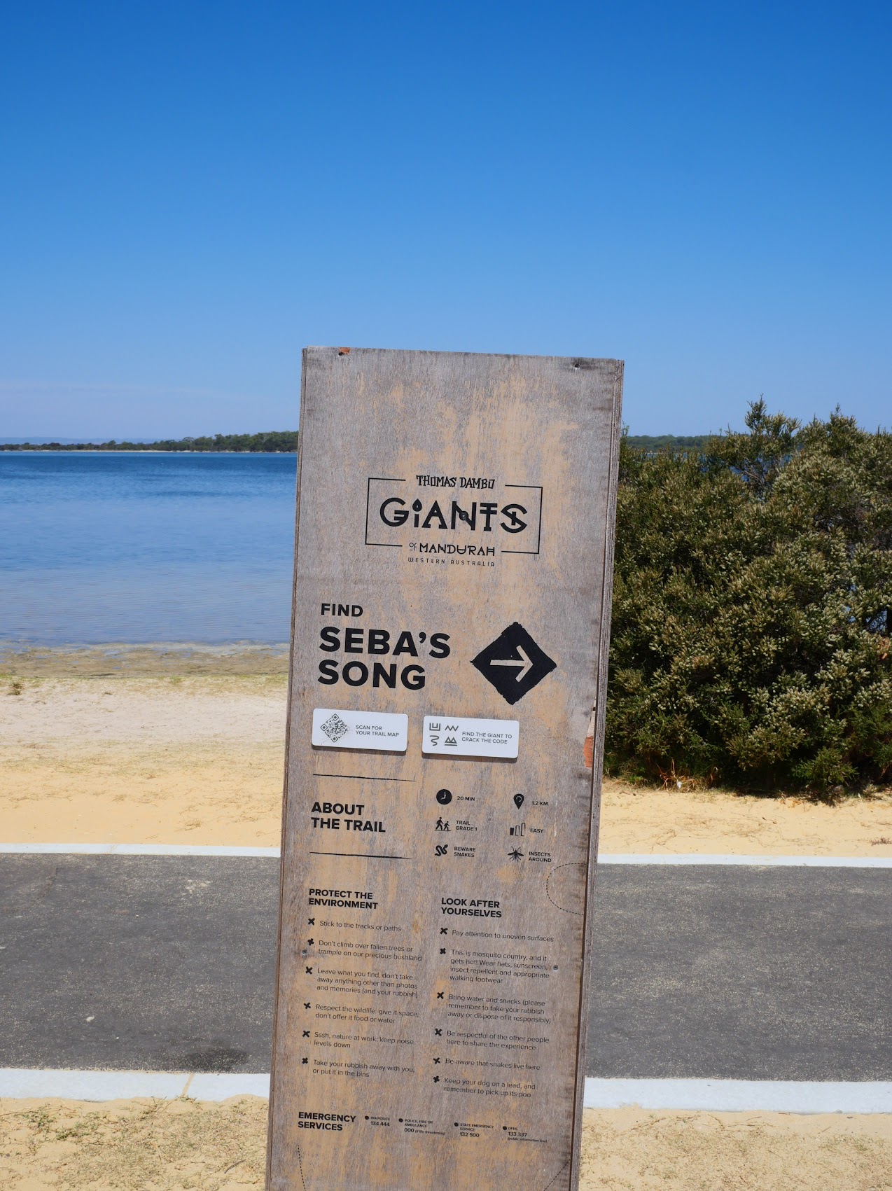The Giants are scattered up and down the coast from Mandurah and they make a bit of a game of finding them. There are five Giants inspired by a poem written by the Artist which is about the cycle of water from the ocean to clouds to rain and back to the ocean. You start at the Giants of Mandurah Information Center where you are provided with a “Traveler’s Companion” with a map and clues as to where each of the five Giants is located and, if you visit all five and collect the clue each one provides, the location of a sixth “secret” Giant is revealed.