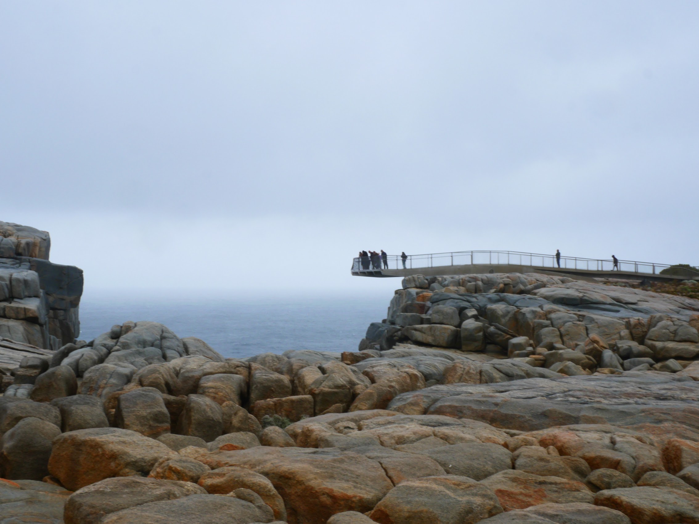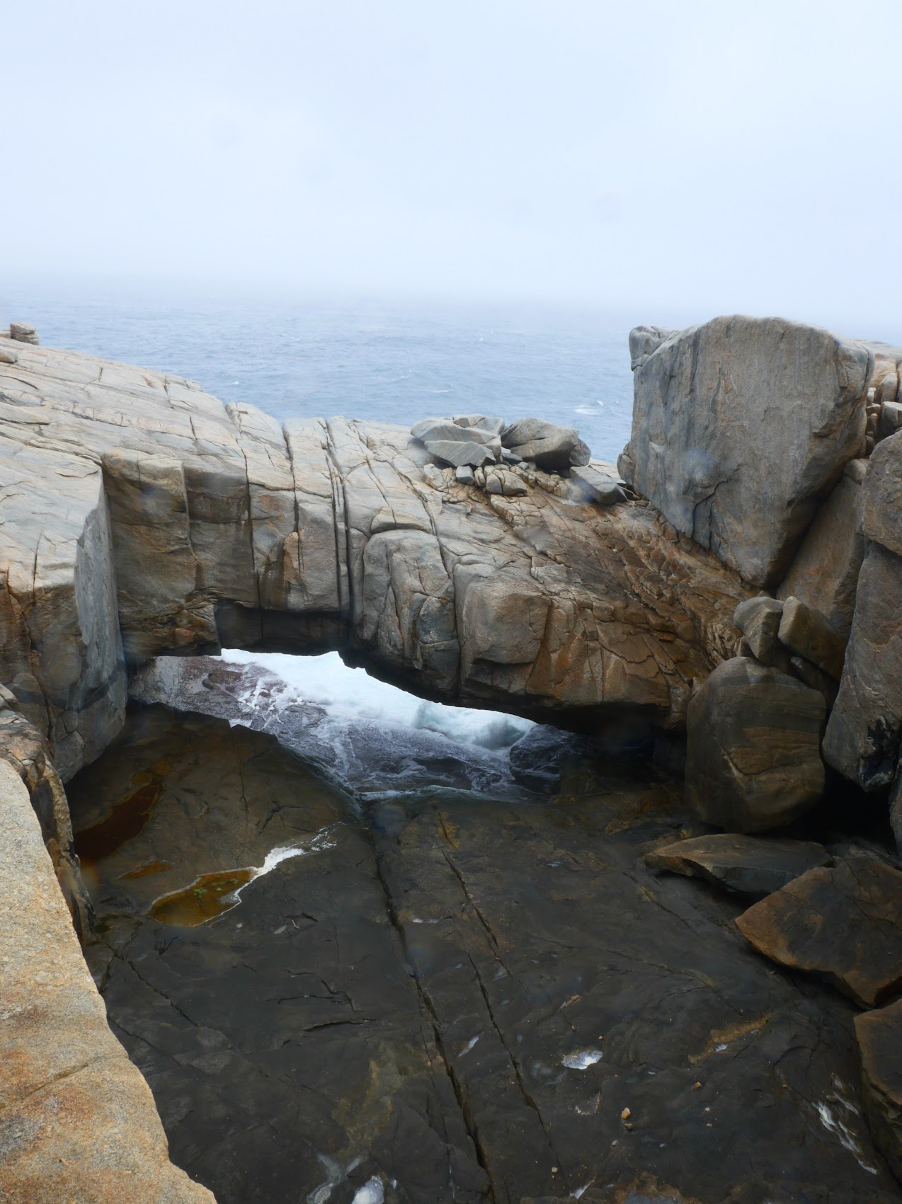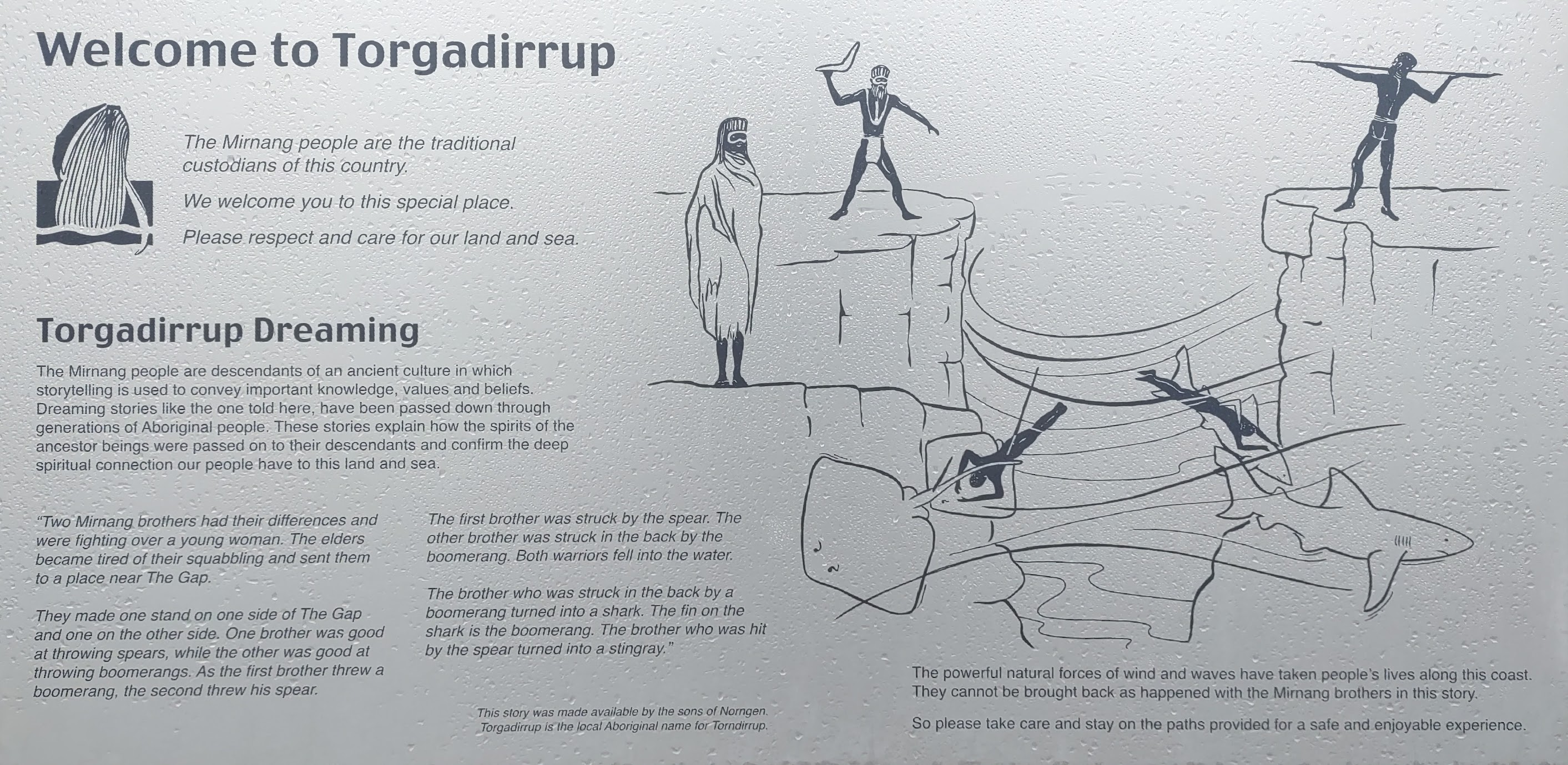 On the way to Bremer Bay we detoured south around the town of Albany through the Torndirrup National Park to the southernmost point in Western Australia, a rocky peninsula stretching into the Southern Ocean. We visited a spot called The Gap which featured scenic overlooks and a rock bridge as well as some interesting interpretive signage regarding both the geological and cultural significance of the place.