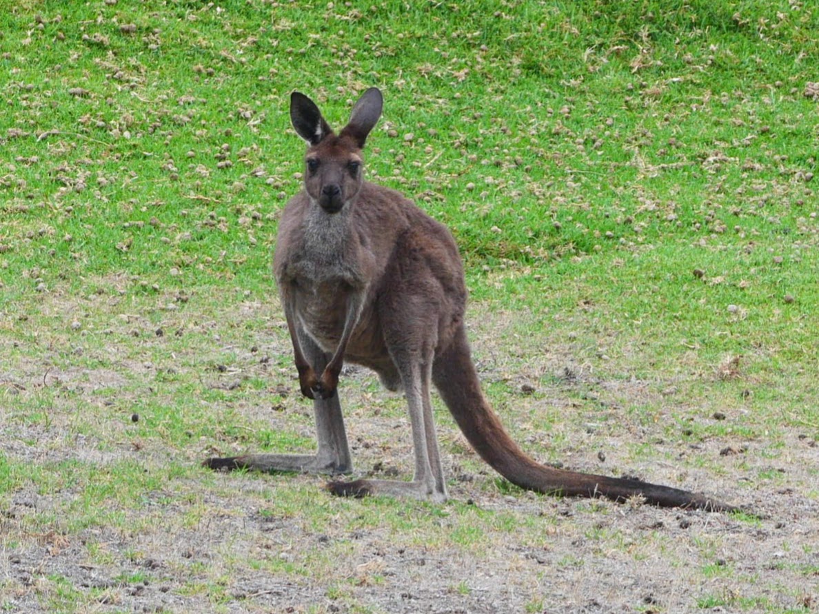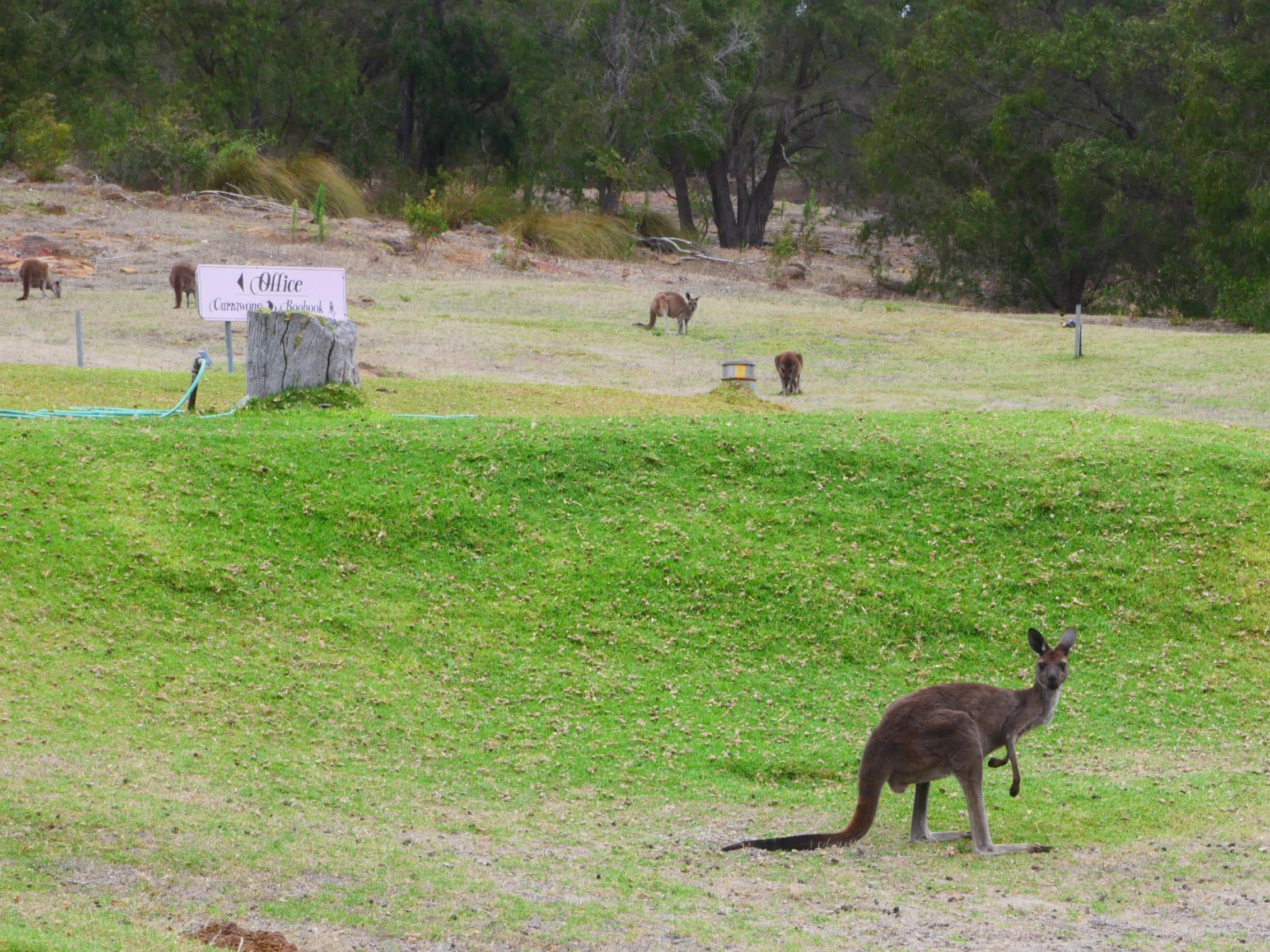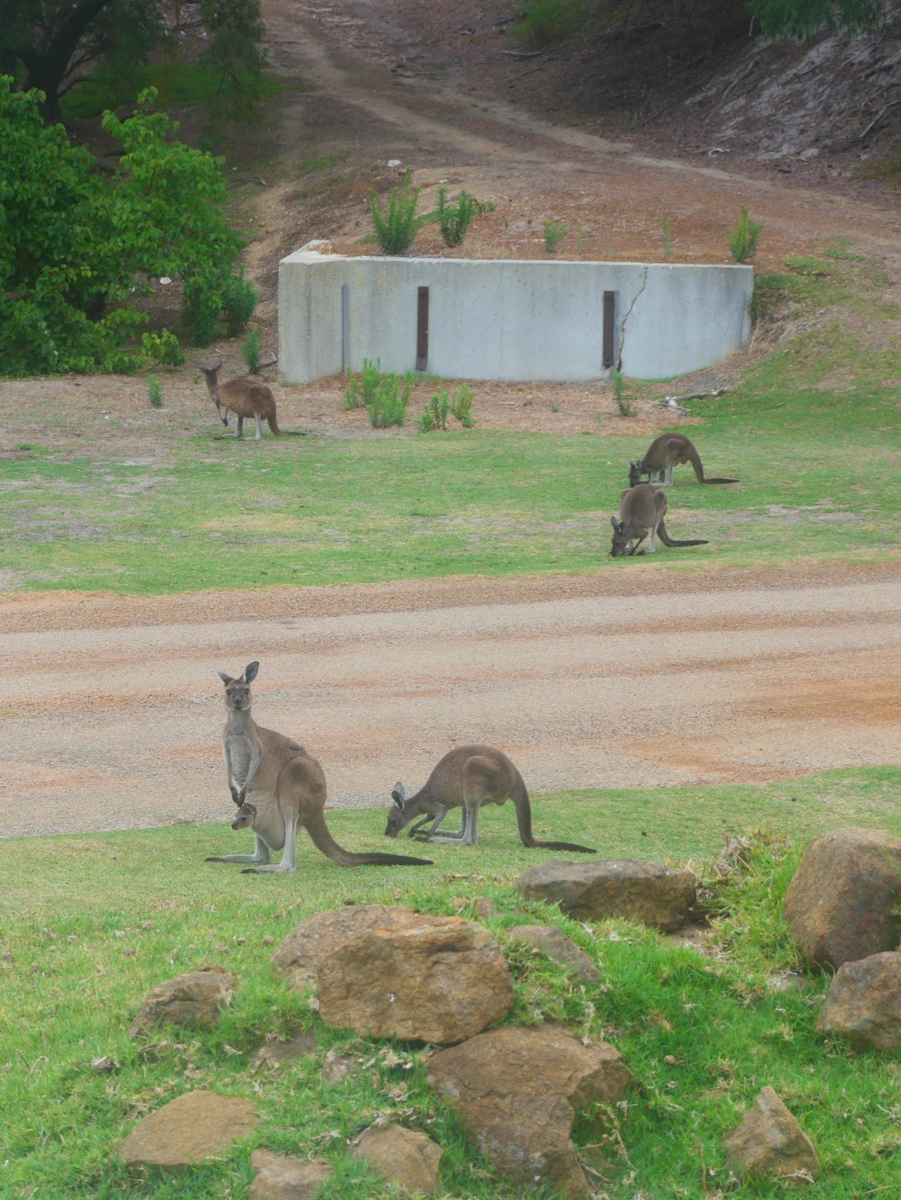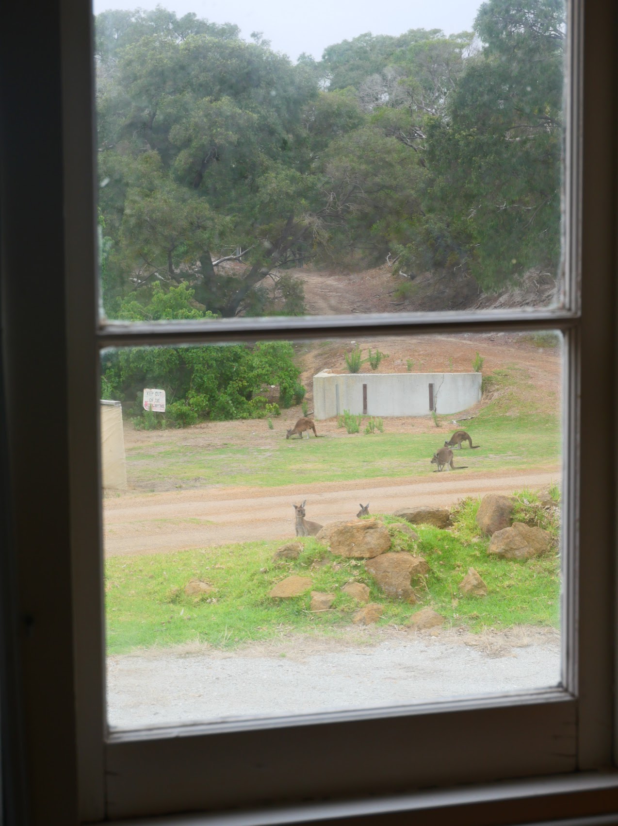 The outhouse aside, the biggest surprise of our place in Bremer Bay was that it came complete with its own kangaroo “mob” (that’s what a herd of kangaroos is called here). Although they made themselves scarce during the day, every morning and evening 15 to 20 kangaroos of varying sizes would emerge from the surrounding bush and wander around the property grazing. It was interesting to see how they balance with their fat tails and that there is usually one watching while the others graze. Welcome to Australia mate!