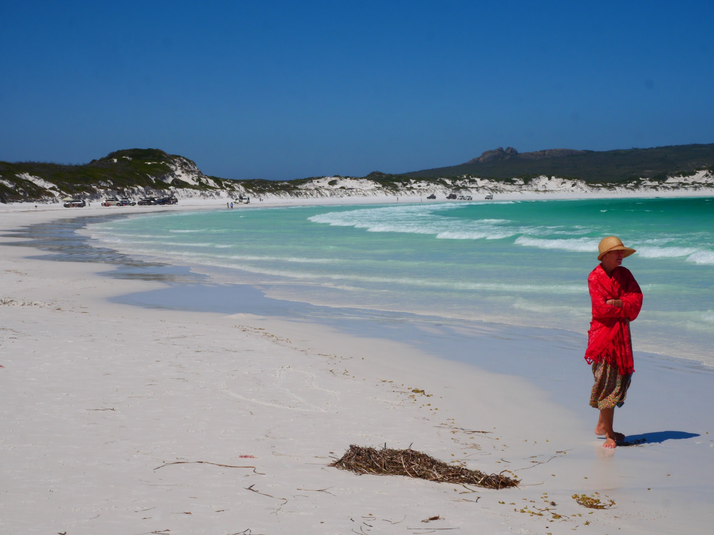 Although the beach was far from deserted – maybe one hundred people and 20 or 30 vehicles – it is so wide and long enough (5 kilometers) that it didn’t seem crowded at all. Although we didn’t see any, Luck Bay Beach is also famous for kangaroos who come out on the beach to sunbath. There was a pretty stiff breeze coming off the Southern Ocean and despite the bright sun (made more intense by the glaring white sand) it was a bit cool, so, rather than sunbath (with the kangaroos?), we were pretty content just walking the length of the beach and soaking it all in.