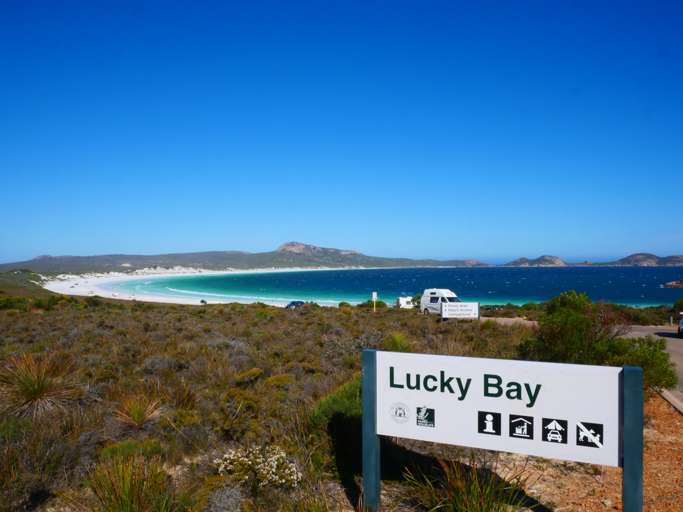 Following a bit of football, we headed out to visit Cape Legrande National Park and what we hoped would prove to be the piece de resistance of Esperance Beaches, Lucky Bay. It was only about a 45 minute drive from our place to Lucky Bay, but only about half that to the entrance of Cape Legrande National Park. From the park entrance we wound our way through low granite hills until a beautiful turquoise bay banded by an incredibly white strip of sand came into view.