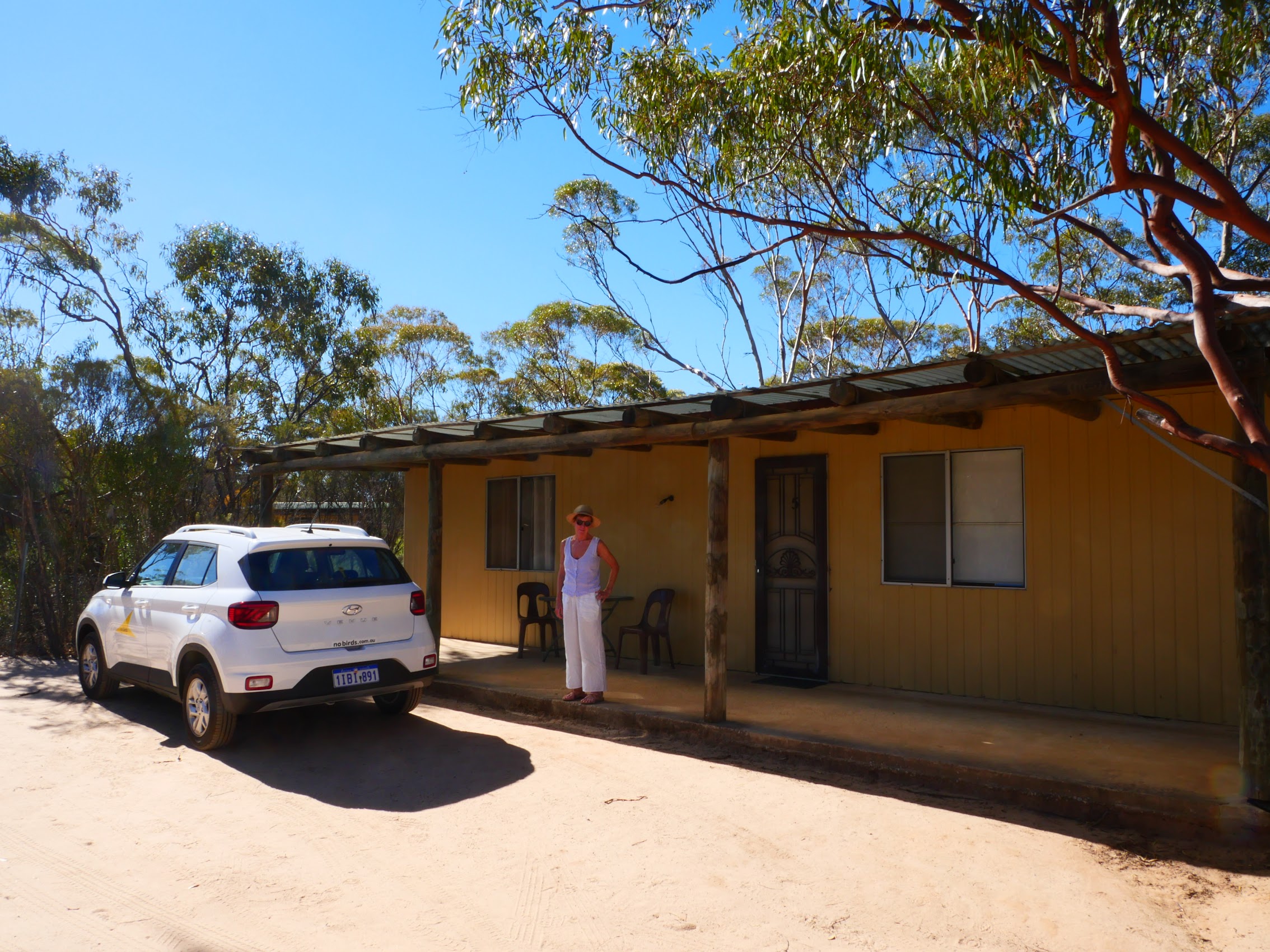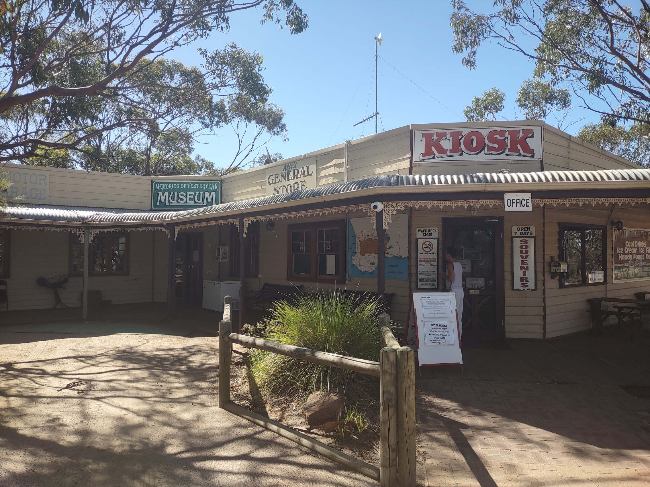 The drive to Hyden involved some backtracking on Highway 1 where we were again subjected to road trains before turning north and heading pretty much into the middle of nowhere. Eventually we saw signs of civilization (sort of) and without much trouble located the Wave Rock Caravan Park Cabins and Resort (hosted by Sue), where would be staying for the night. We checked in at the office (which was next to Alfie’s General Store and the Memories of Yesteryears Museum as well as a courtyard with swimming pool) and were directed to our stay for the night, a rustic cabin slightly removed from all the action on the perimeter of the site.