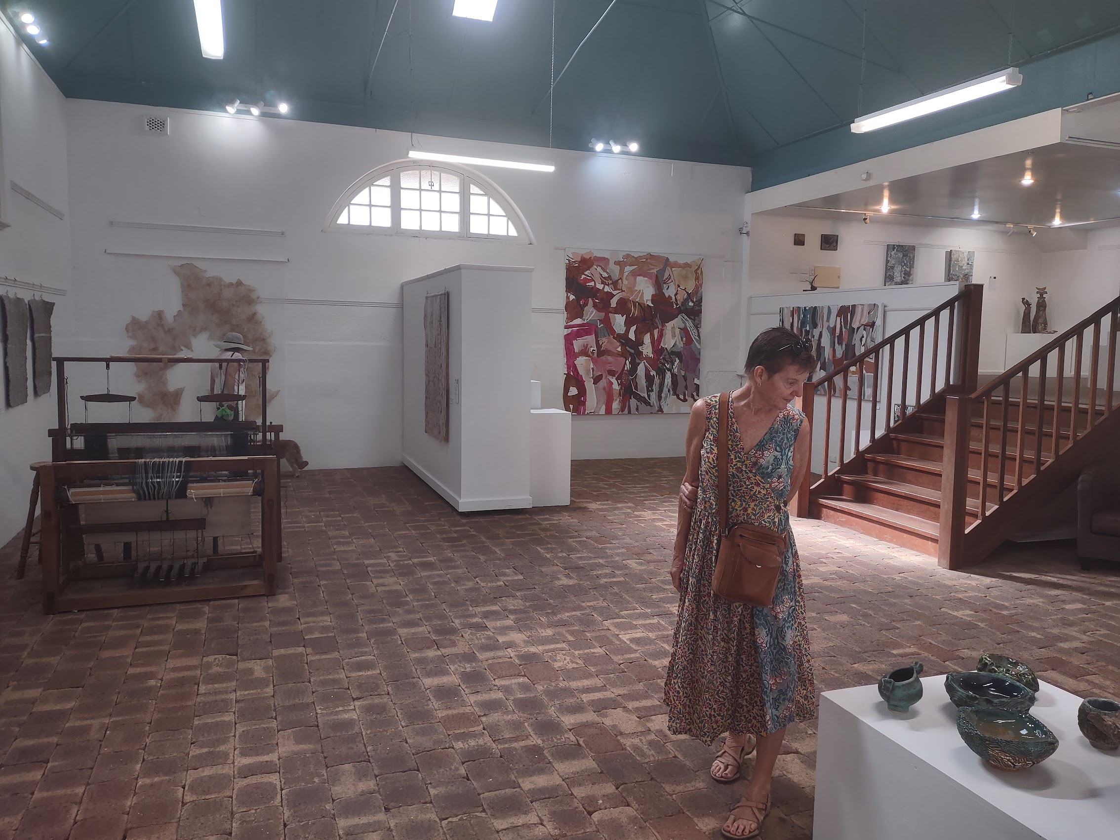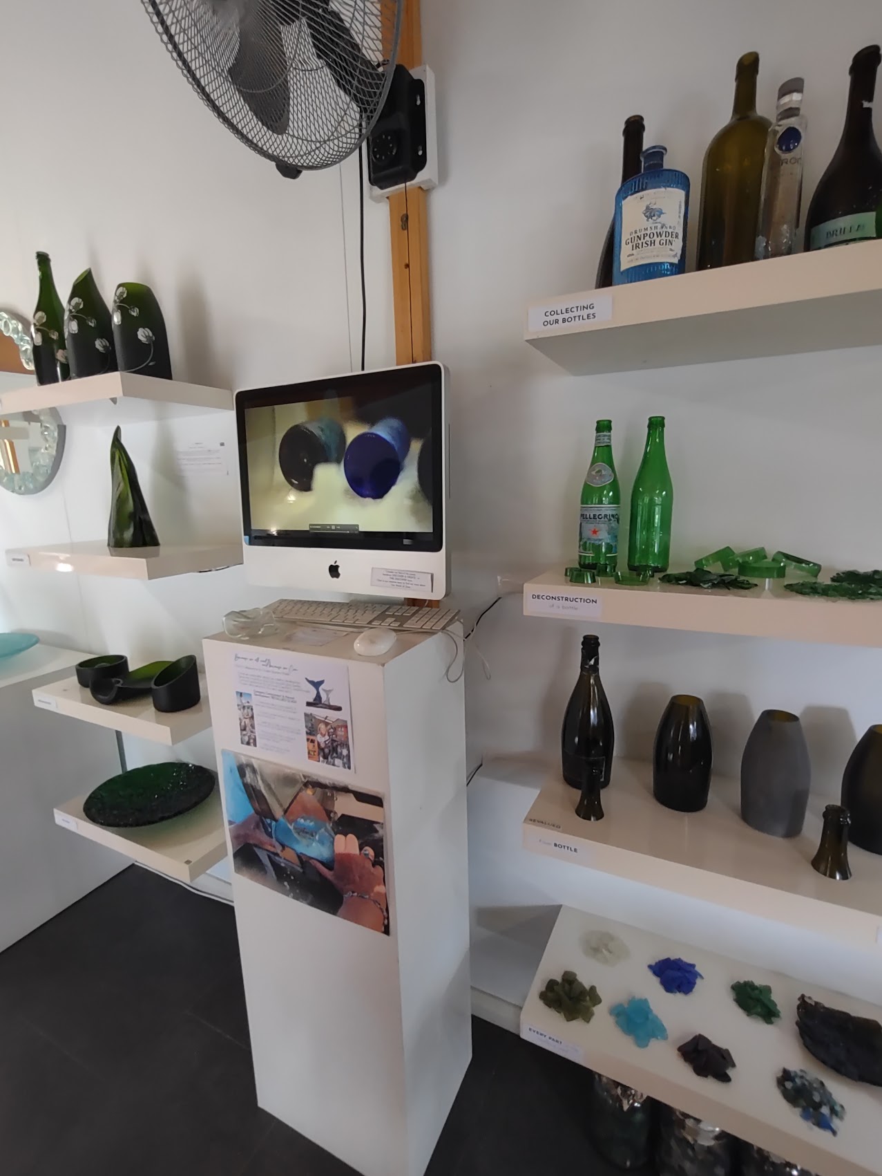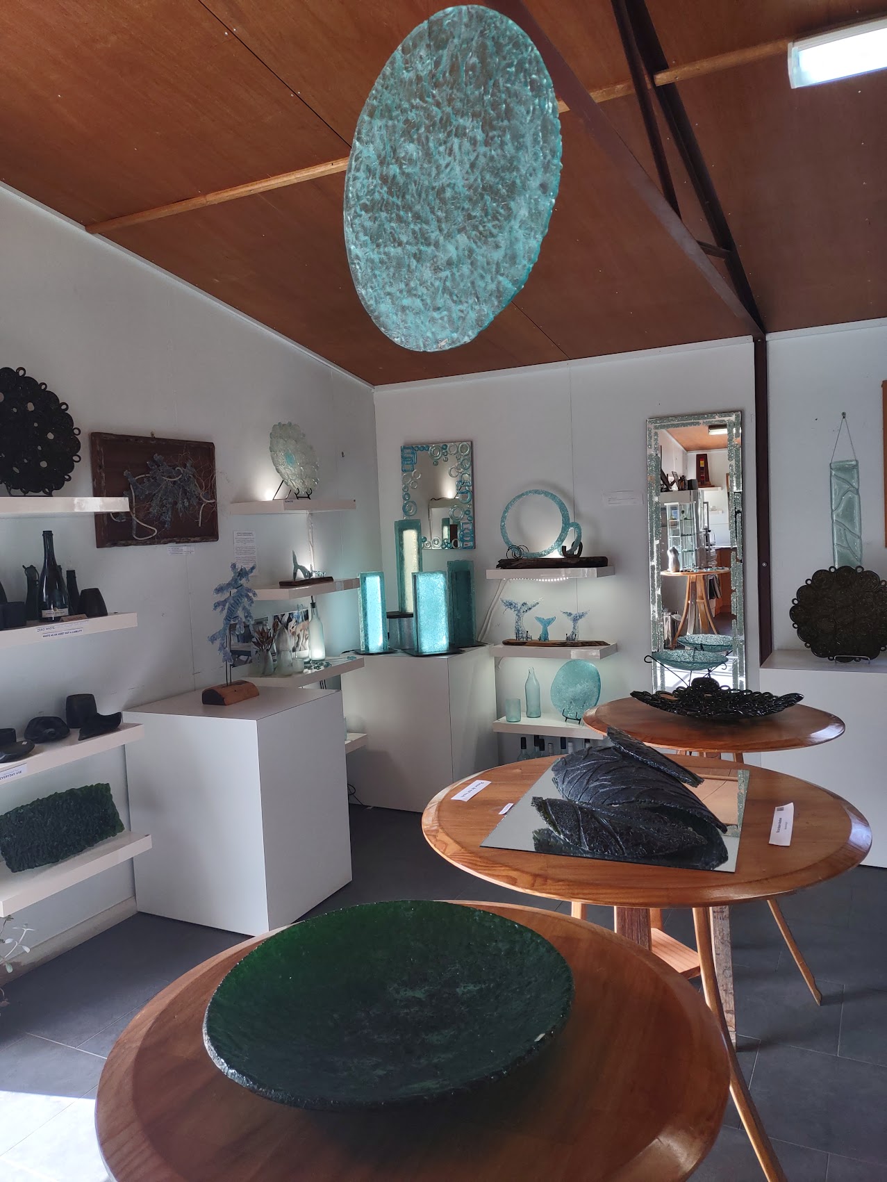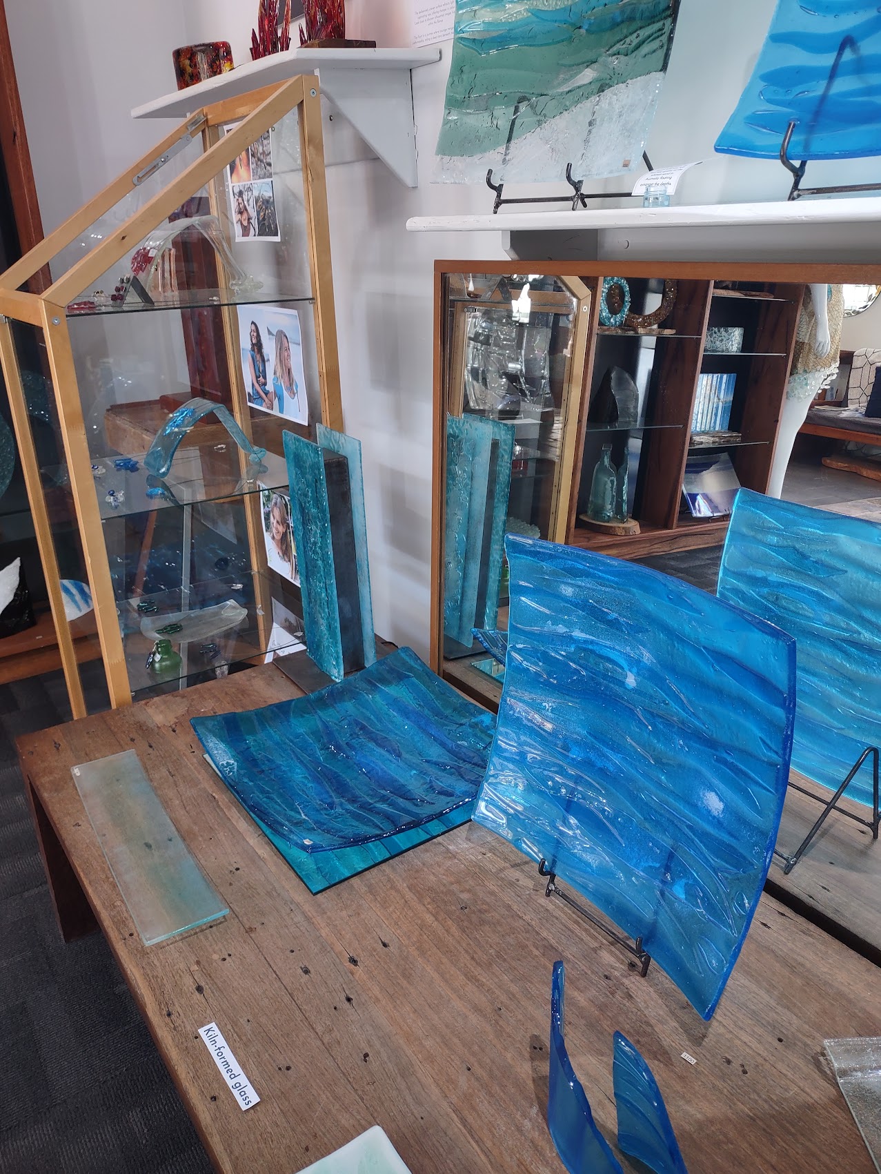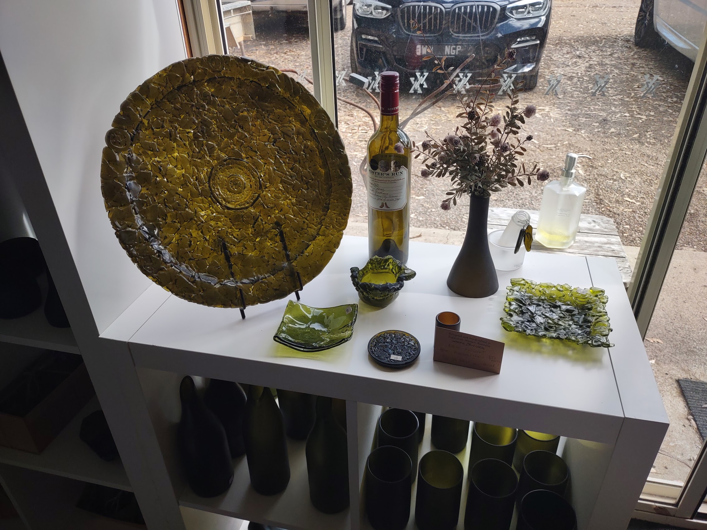 Just beyond the Pink Lake, we took a detour into the bush to check out an artist’s studio we had read about called Cindy Poole Glass. We were warmly greeted and advised that, for a small fee ($25) we could have a personal tour of the gallery with the artist Cindy Poole (who is apparently quite famous in the area). We declined the private tour but were nonetheless amazed at the collection of beautiful jewelry, sculptures, and other objects all made from recycled glass bottles (Cindy calls it ReValuing) which are artistically transformed in a kiln. (We also learned that Cindy Poole was one of the artists who collaborated on the “Whale Tail” sculpture in the center of the esplanade.) There were many beautiful pieces, but most looked to be pretty challenging in regard to ongoing transport but I did purchase a set of shot glasses as a memento.