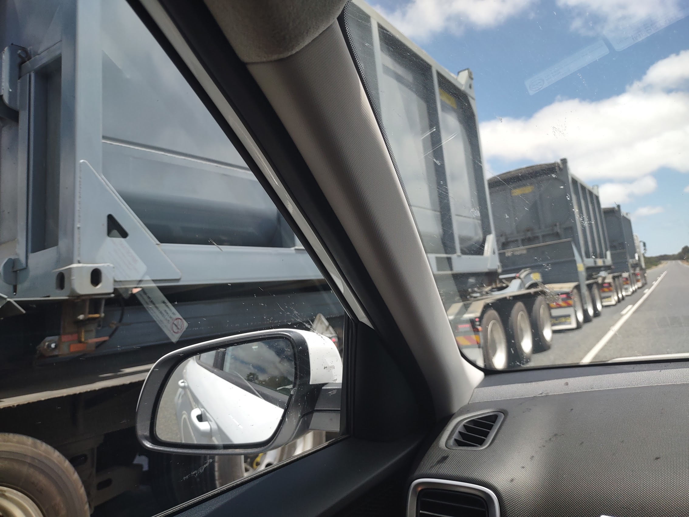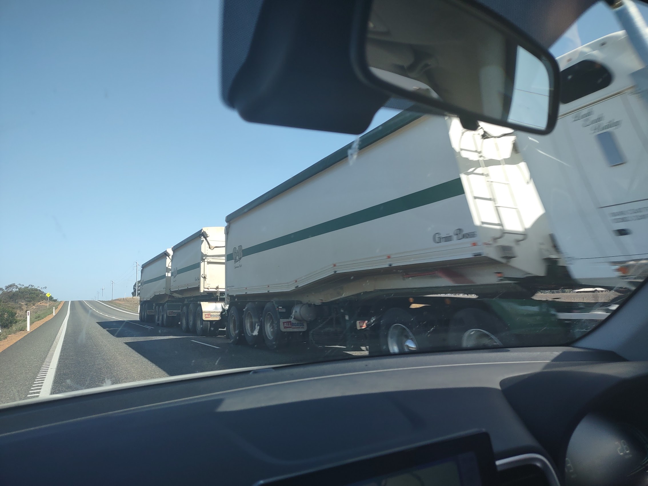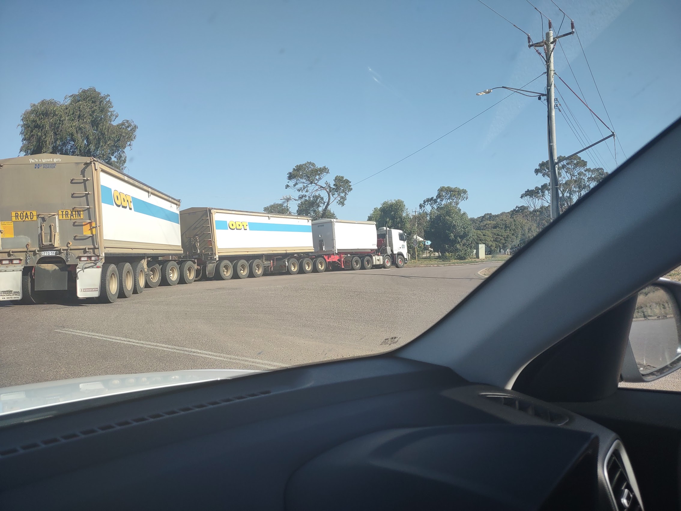 If you’ve not heard of road trains, they are tractor rigs with two and sometimes even three trailers in tow which send a pretty serious shock wave as they pass you by. Although the first couple of them caught us a bit by surprise, thanks to the open countryside and long straight stretches of roadway, you could usually see them coming from a distance and had time to brace yourself and, while we tended to hold our breath each time we were passed by one, Colleen managed them quite well.