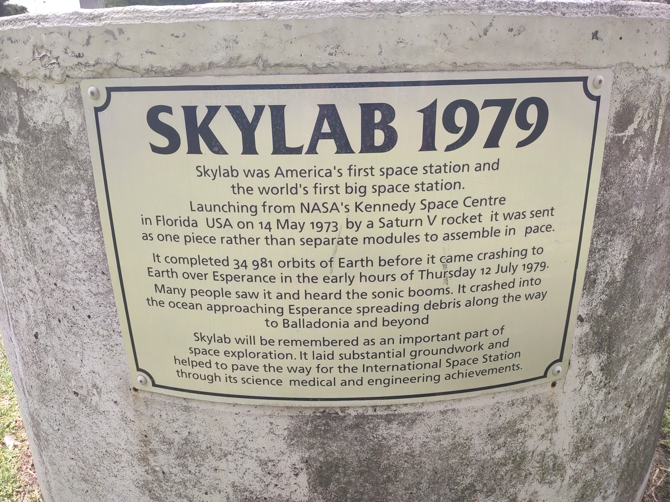 As might be expected, there were also a number of tourist attractions scattered around town including a park with a historic village and museum just north of the Whale Tail. The museum included a Skylab exhibit which confirmed an interesting story we had heard somewhere along the way (Bill Bryson’s book I think). As the story goes, in 1979, pieces of the space station Skylab crashed onto Esperance after the craft broke up over the Indian Ocean. The municipality fined the United States $400 for littering, which was the story we had heard, but, as we learned, it apparently didn’t end there.