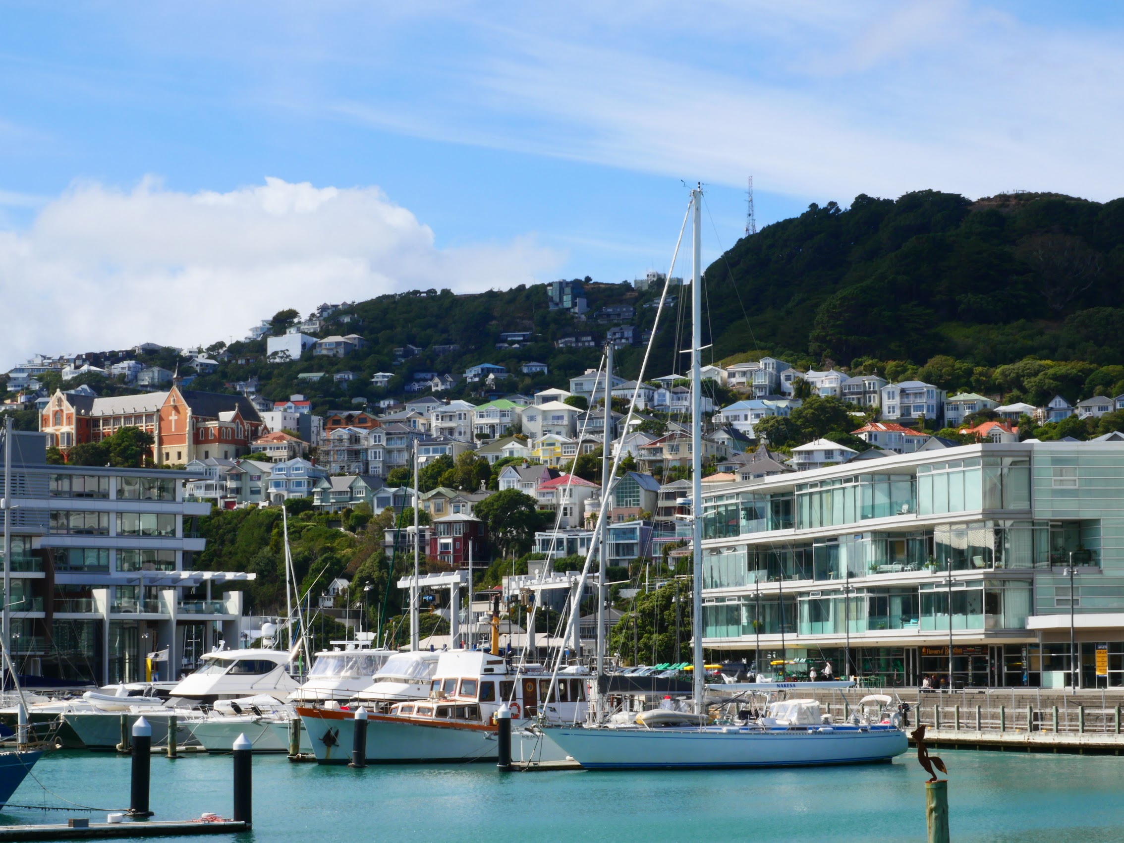 From the waterfront, there were fantastic views of the city fringing Wellington Harbor including views of Wellington Central, the city’s business center with its newer office towers to the north, the ferry terminal and port facilities beyond, and the Clyde Quay wharf and marina to the east with Mount Victoria looming behind.