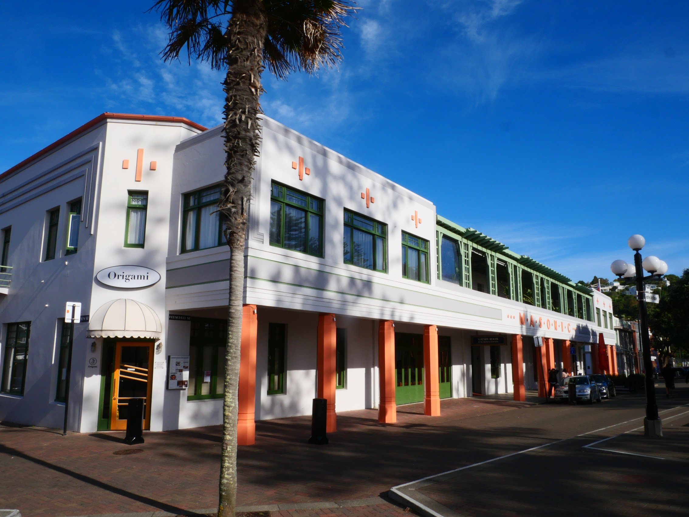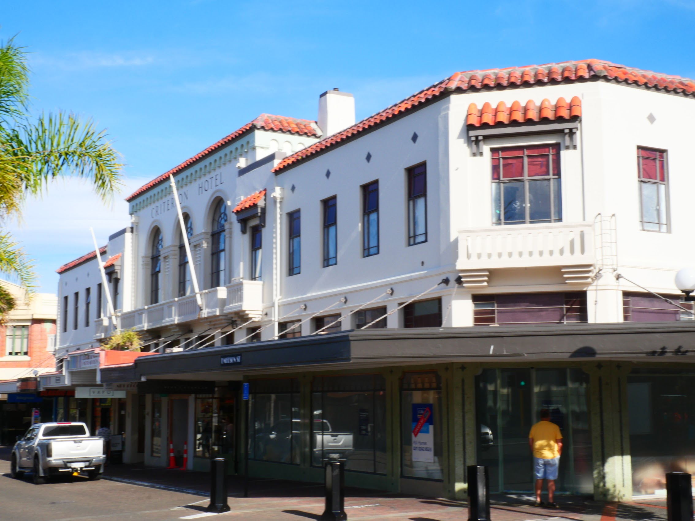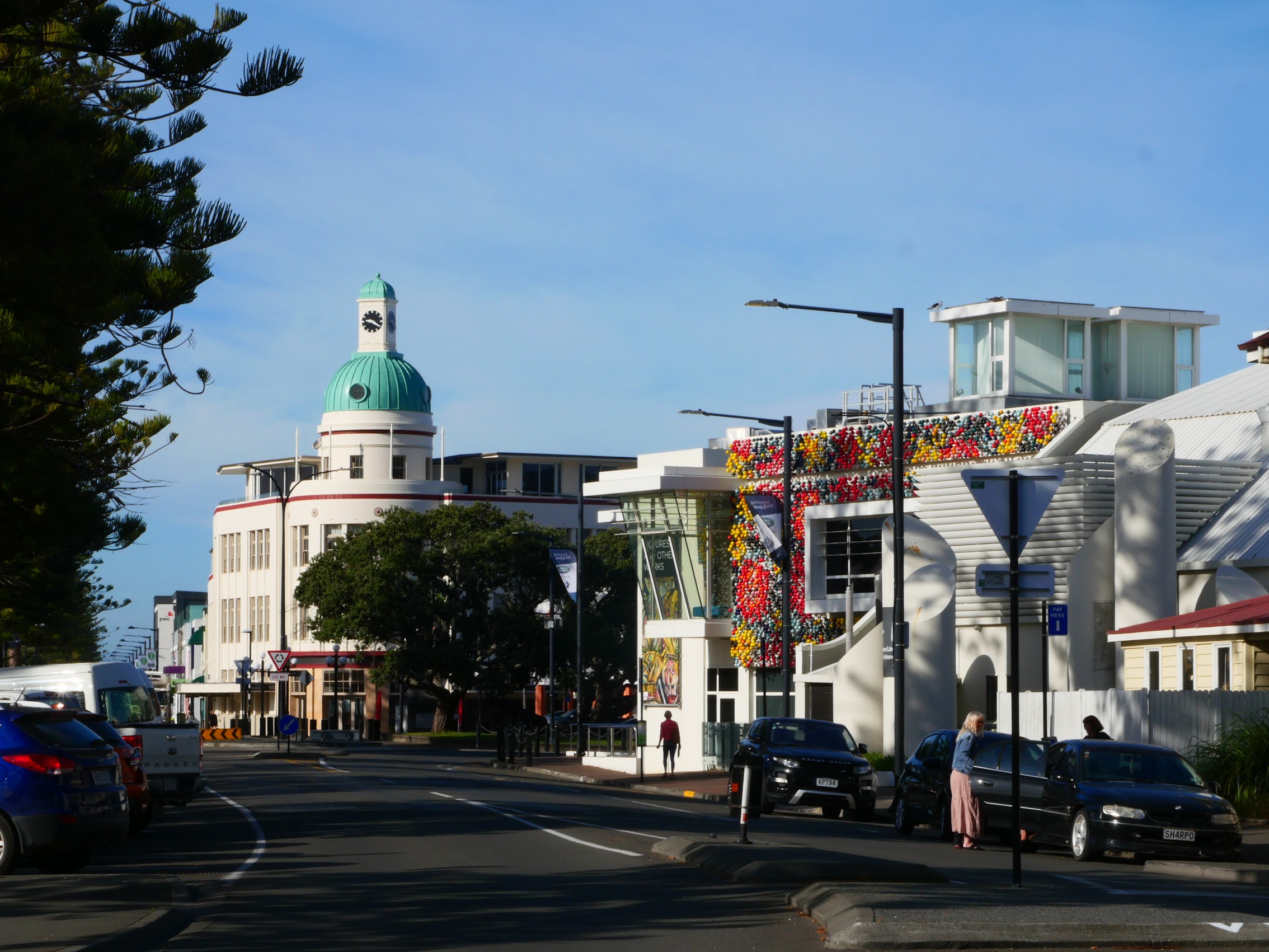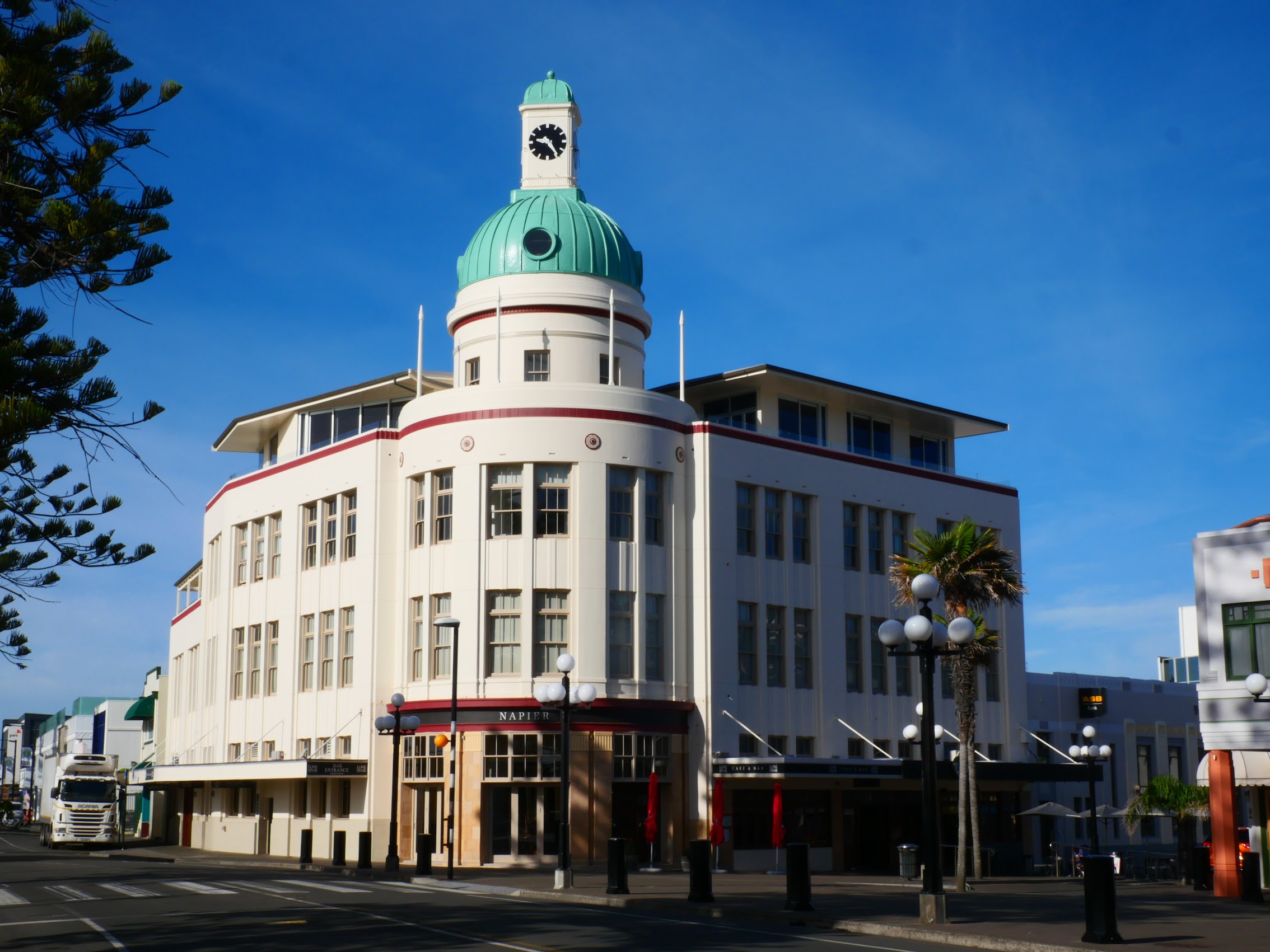Some of the most interesting and noteworthy buildings in Napier, both old and new, are located on the Town side of Marine Parade, a 3-kilometer-long stretch of seafront connecting the city of Napier and the ocean. These include the iconic Dome (1935), which was originally the home of Temperance General Insurance, a company that emerged during the prohibition era in the early 1900s. The nearby Masonic Hotel (1932), a beautifully maintained Art Deco design, is where Queen Elizabeth II and Prince Philip stayed while in Napier in January 1954 on Her Majesty’s Coronation Tour of New Zealand.