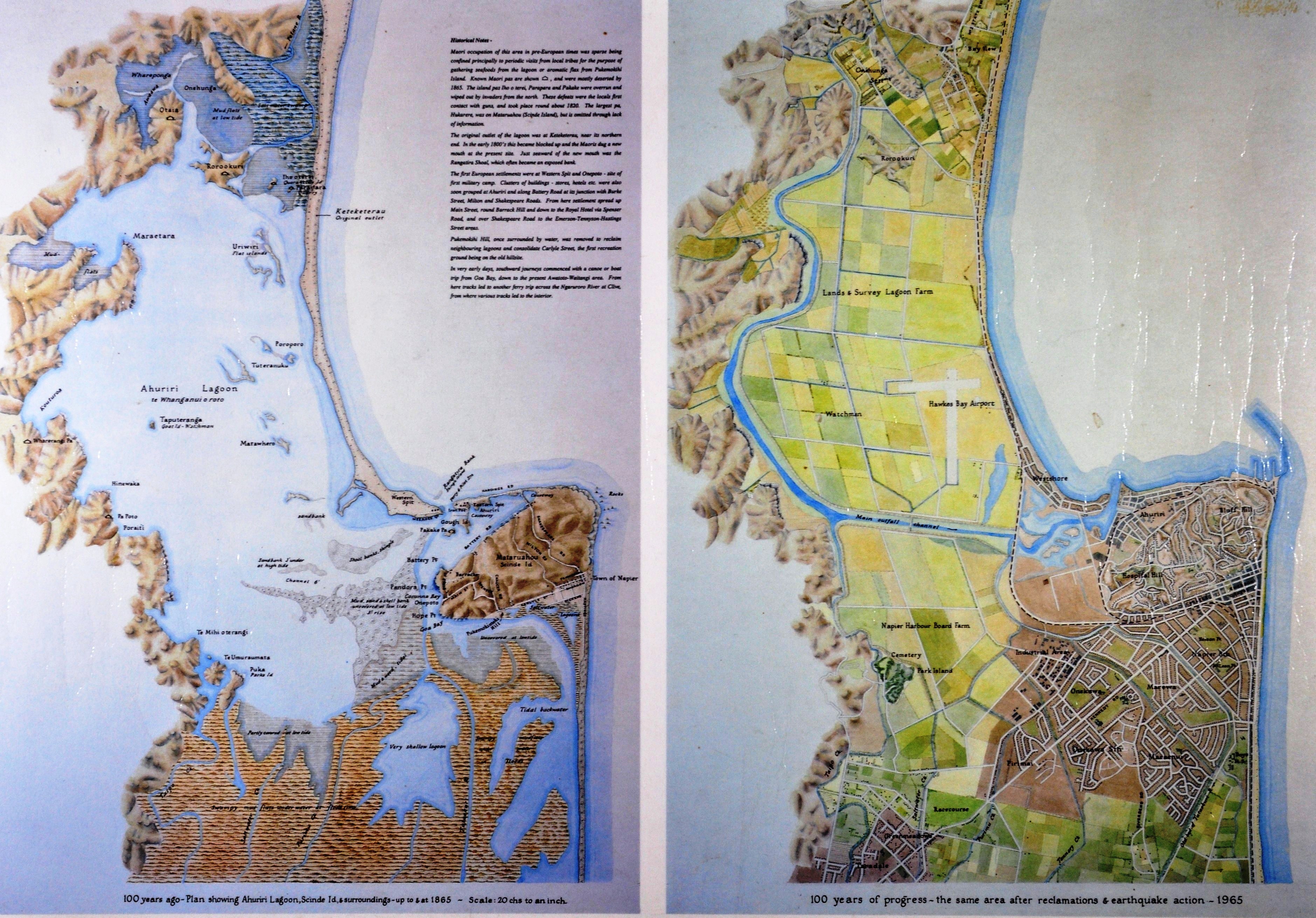 The earthquake was caused by movement along a buried fault line between the Australian and Pacific tectonic plates almost directly under Napier which not only devasted Napier and the nearby town of Hastings but also raised the elevation of Napier and its surrounding area by 6 feet or more. As a result, over 5,000 acres of “new” land were raised above sea level including the large Ahuriri Lagoon which had existed northwest of Napier prior to the earthquake. (The former lagoon is now the site of Hawks Bay Airport.) Debris from landslides and demolished buildings was placed on the newly upraised foreshore, and covered with soil to create a broad garden esplanade along Napier’s Marine Parade.