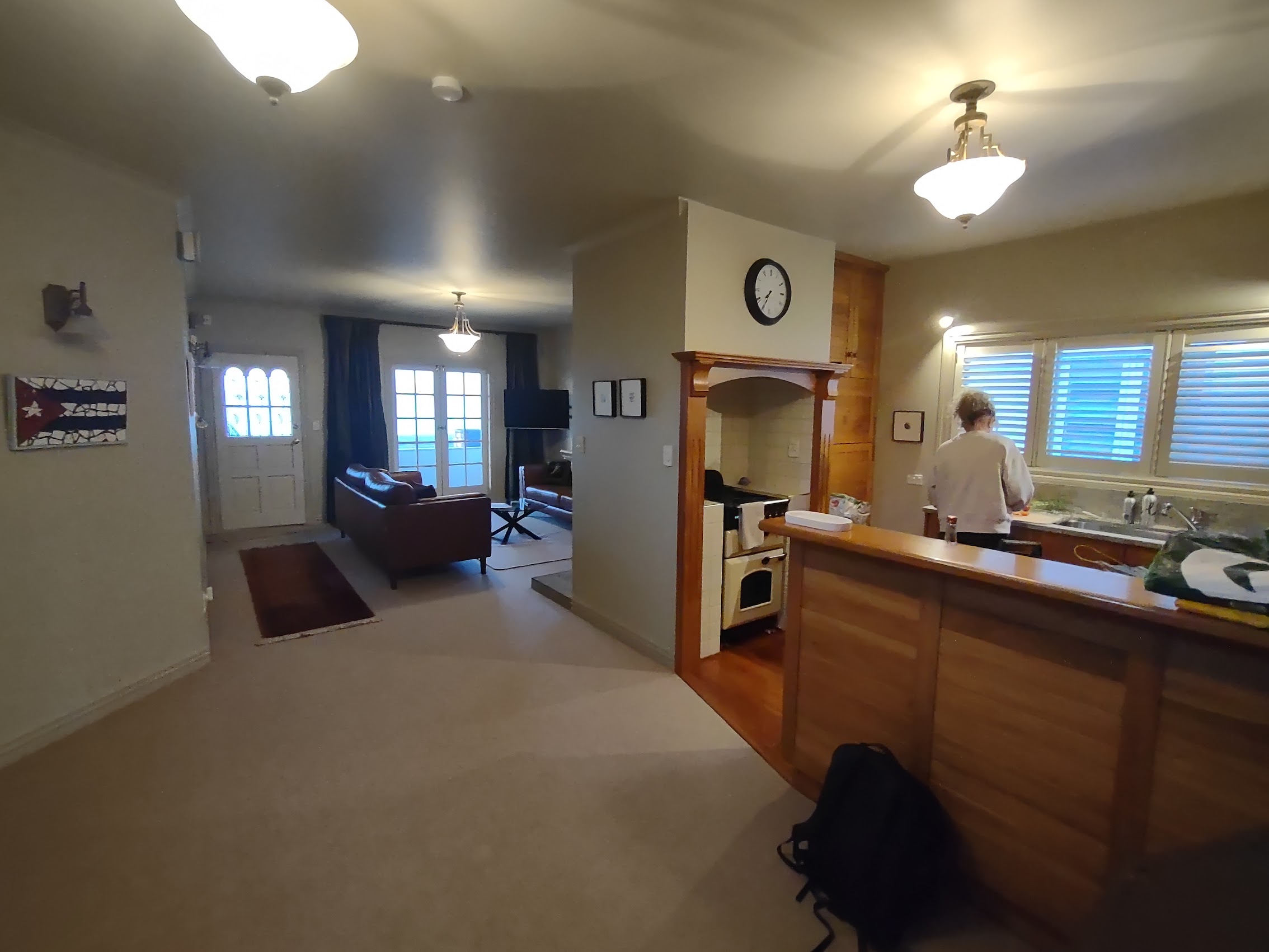 Our stay, the Beachfront Villa was small 2-story 2-bedroom 2-bath cottage with a small backyard with wonderful views of Hawkes Bay from a small front porch and the second floor bedrooms. The place had been recently (and very well) renovated with nice furnishings and was quite cozy. At $183 per couple per night, it was one of our most expensive stays in New Zealand but, given the quality, comfort, and location, well worth it! (I had a chat with a neighbor (Pete) who advised that Hardinge Road was voted the most desirable street to live on in New Zealand!)