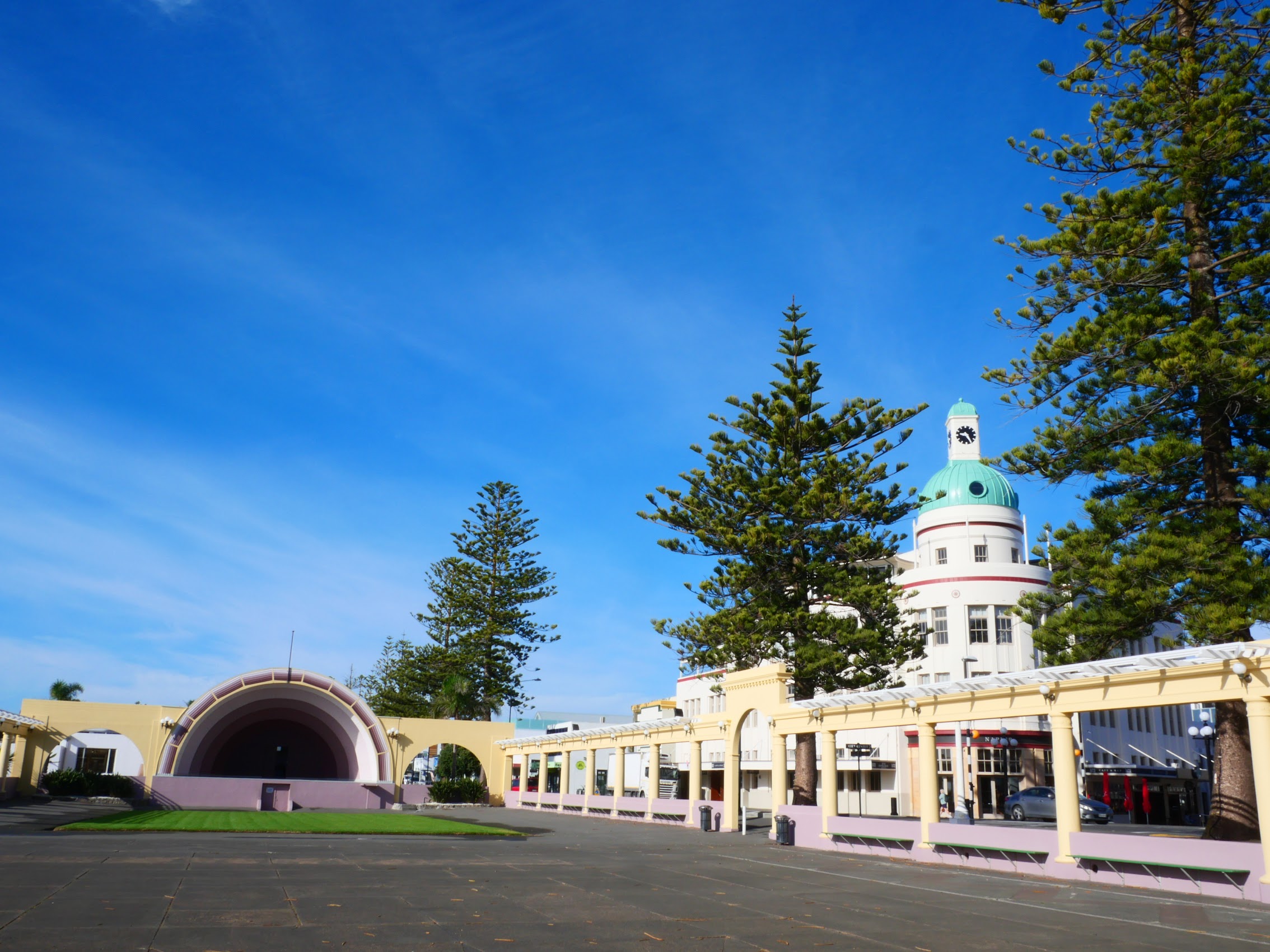 Napier threw itself into reconstruction with the goal of becoming the most modern town in the world. In order to forestall haphazard growth, a temporary shopping center (dubbed “Tin Town”) was built at Clive Square, a park near the city center, and was used for several years while the city center was being rebuilt. Napier’s new town center boasted many improvements, including wider streets and some of New Zealand’s earliest underground power and telephone lines.