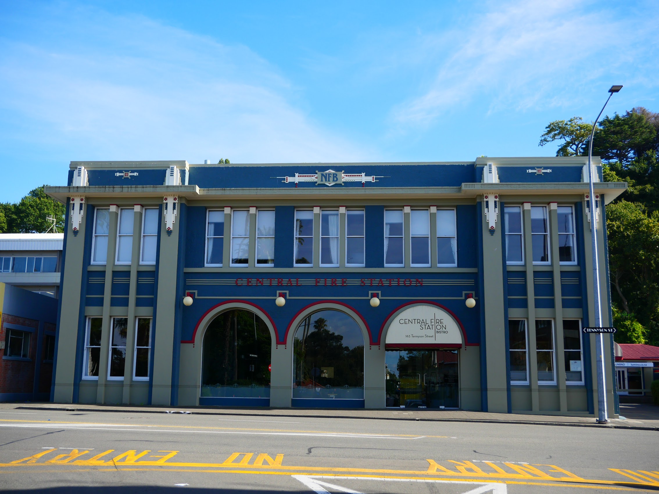 Interestingly, the Napier Central Fire Station (1923) designed by Napier architect Louis Hay survived the earthquake and fire but was partially demolished and reconstructed thereafter for other reasons: the front façade was rebuilt back from the road to allow for street widening. The new façade mimicked the design of the original brick façade but was elaborated upon in the Art Deco style. It served the city until 1969, when it was converted to offices and later became a bistro, the Central Fire Station Bistro, in 2019.
