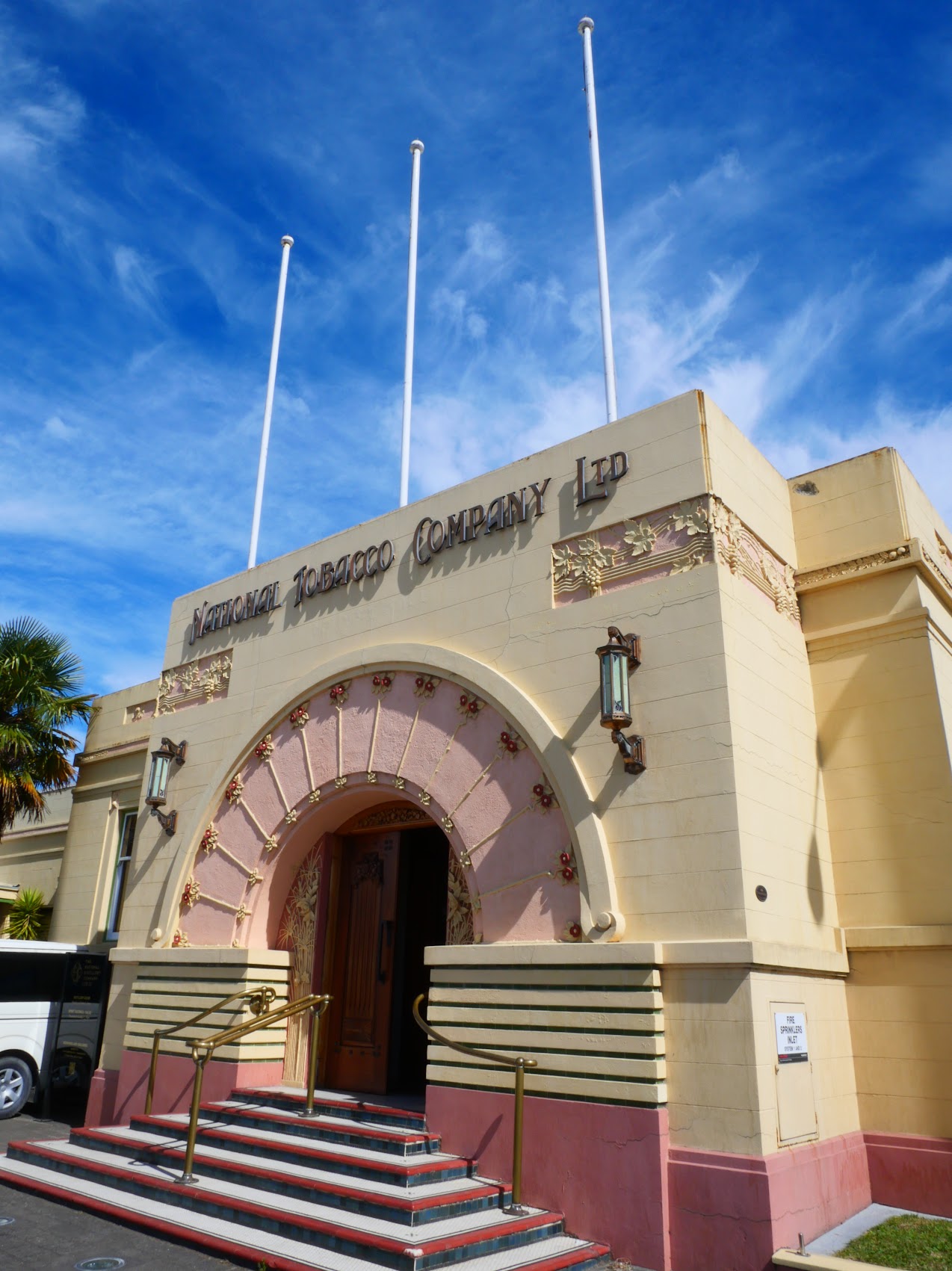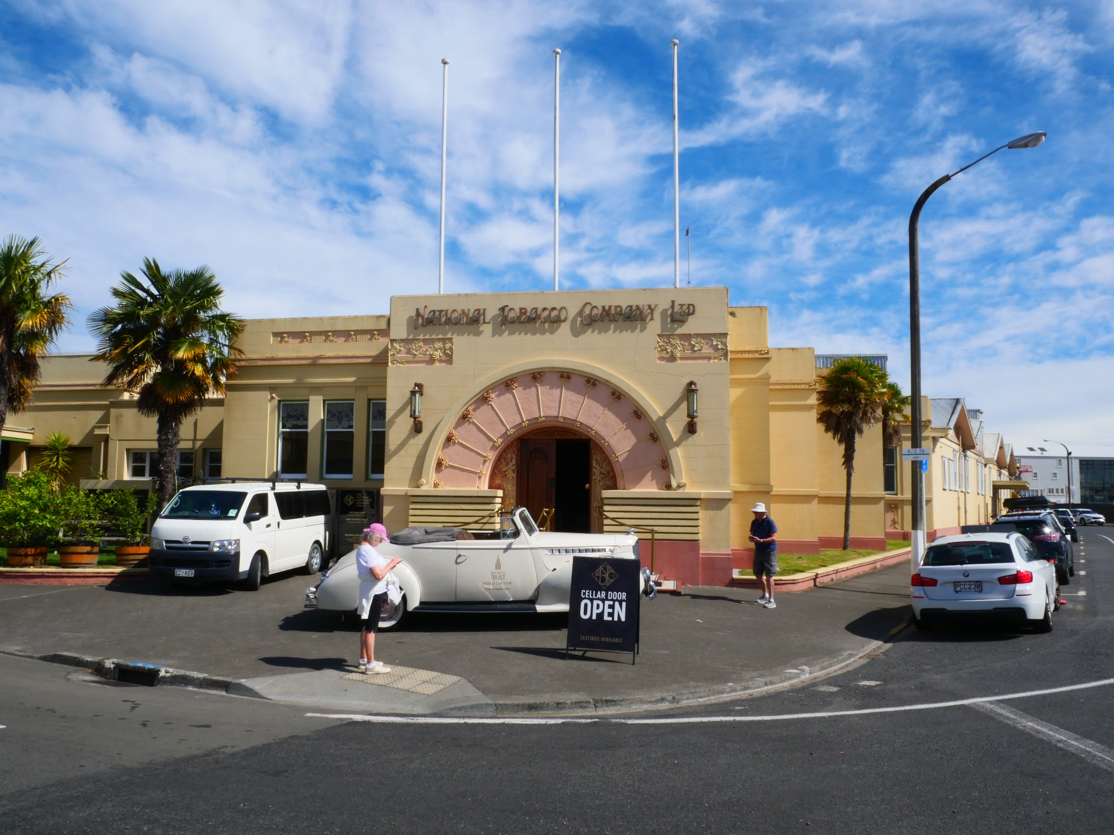 Probably the most beautiful and iconic Art Deco building we saw in Napier was the National Tobacco Company building (1931) – which isn’t in downtown Napier but rather in the old port area near the neighborhood where we were staying. The building now houses a restaurant and the National Distillery Company where we did a gin tasting as part of our wine tour later that day (see more below).