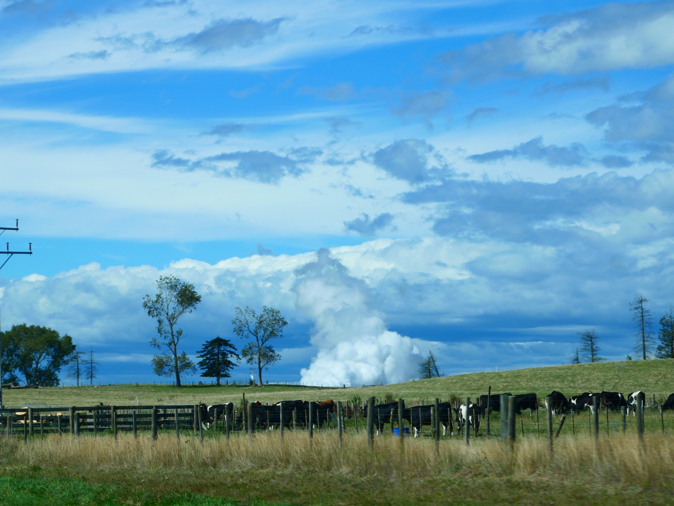 From Taupo, most of the remaining drive to Rotorua was across a large highland plateau with farms and pastureland stretching out towards the surrounding mountains. At one point we saw large clouds of steam rising from what appeared to be a cow pasture and realized that this was a geothermal steam vent which are apparently pretty common in areas like the Taupo and Rotorua Volcanic Zone, known for their geothermal activity.