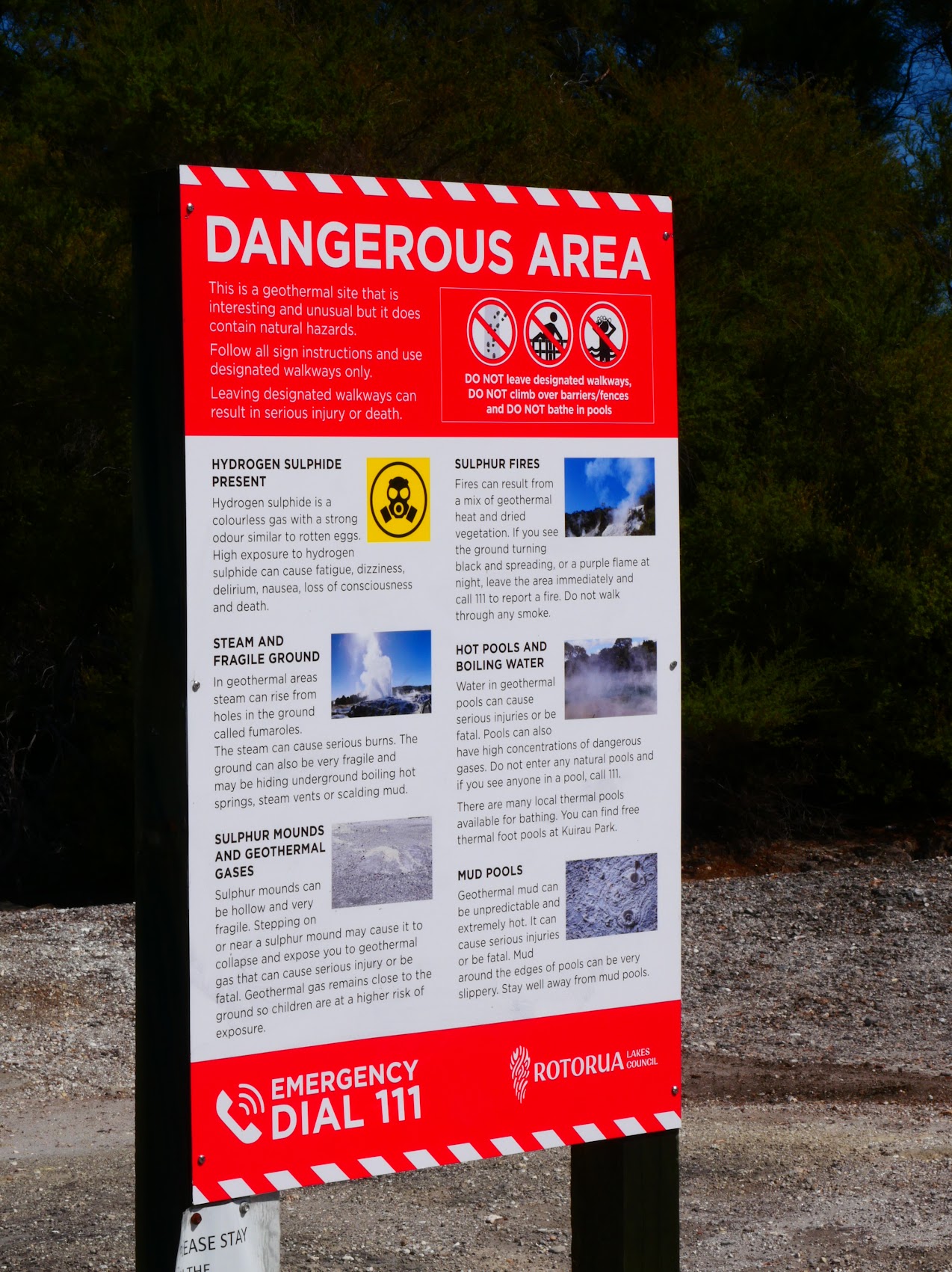 We passed through an area known as Government Gardens (which we would take a closer look at on our way out) and found a parking space near the entrance to the Rotorua Lakefront Boardwalk. We were greeted there by a sign warning us of a number of dangerous conditions we might encounter on our walk including steam, geothermal gases, sulfur fires, hot pools, and boiling water and mud.