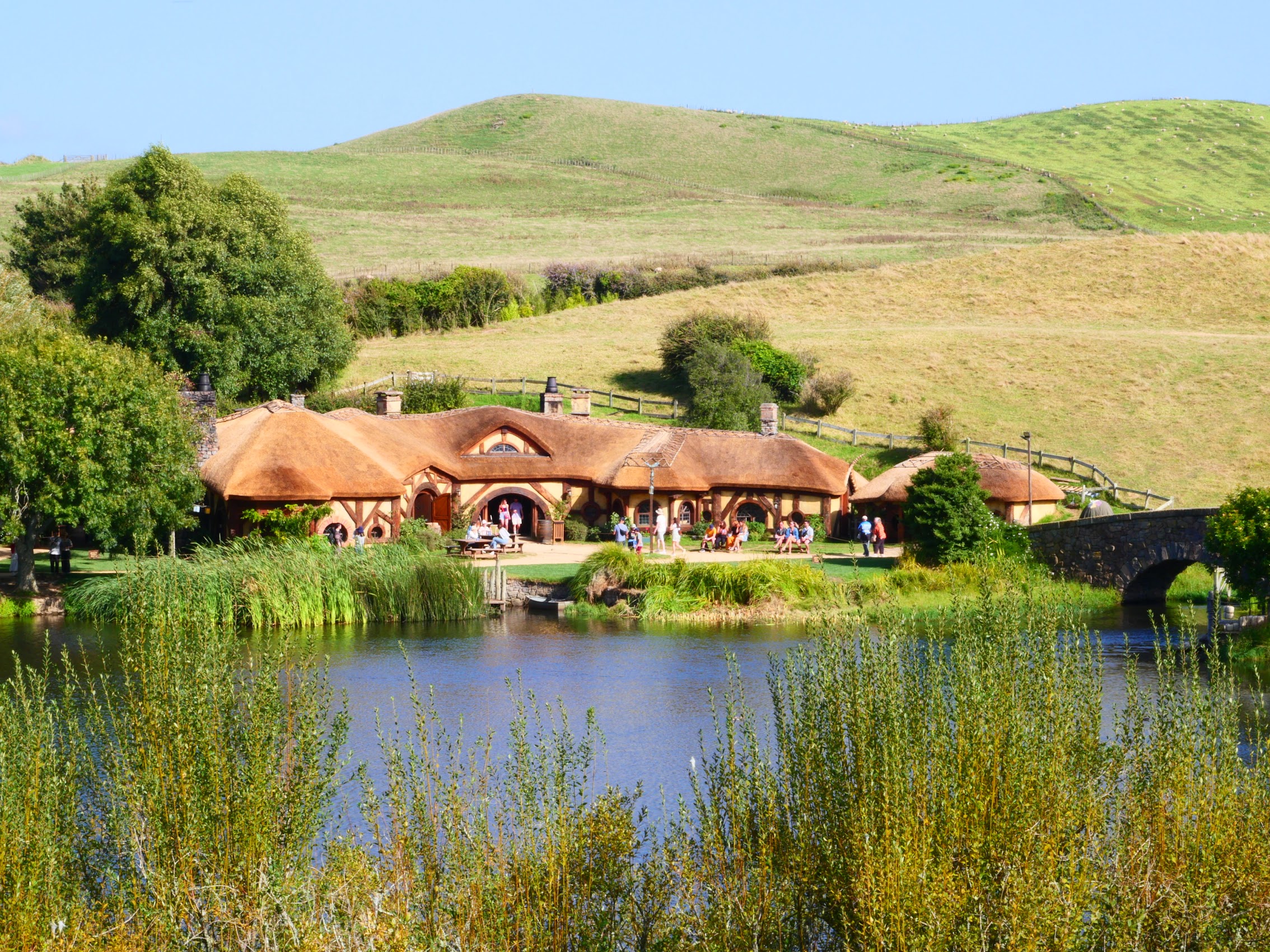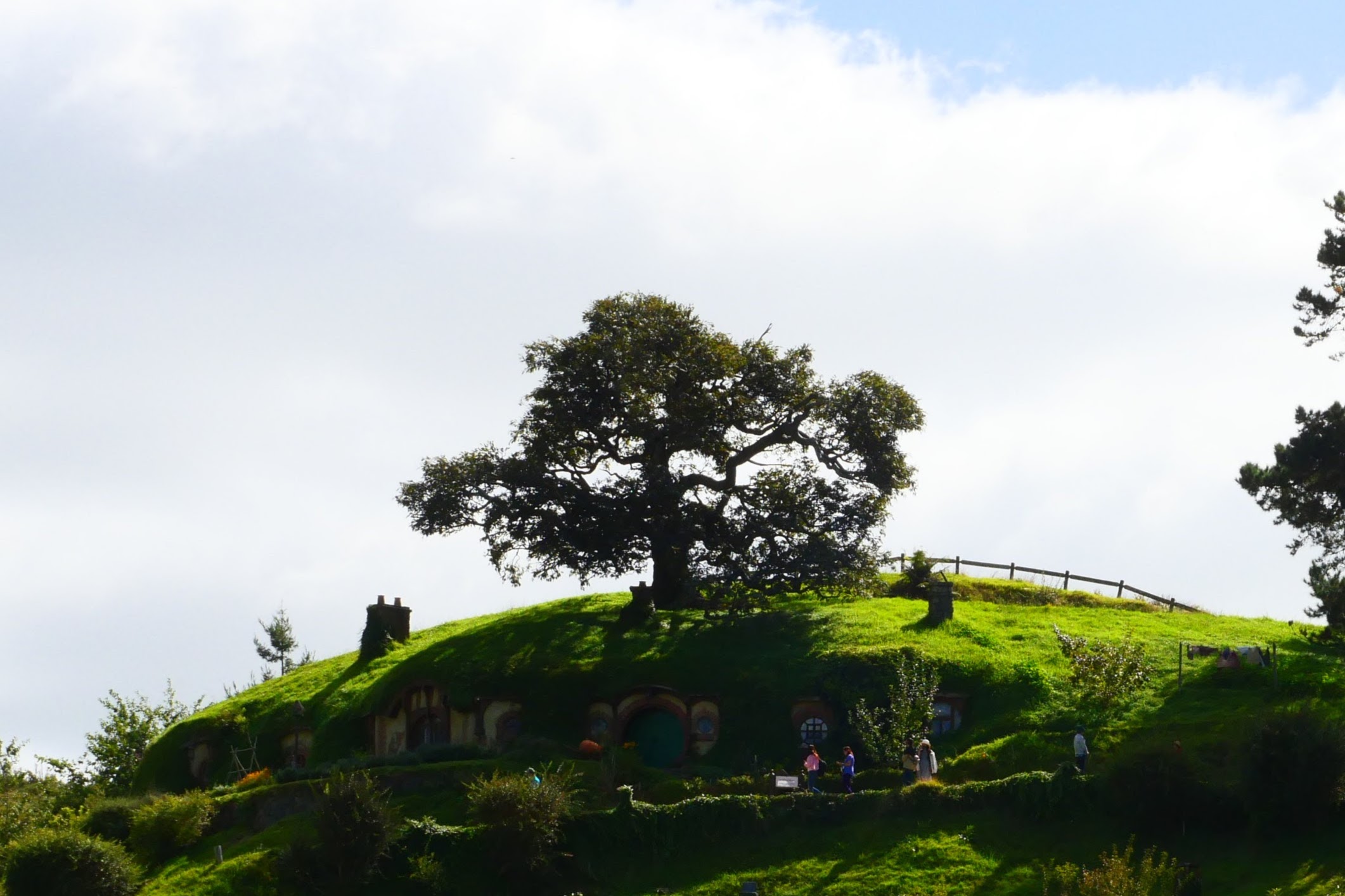 The set, which was used for filming portions of both The Lord of the Rings and Hobbit movie trilogies, was originally constructed in 1999 for the filming of The Lord of the Rings then reconstructed in 2010 in a more permanent fashion for filming of the Hobbit trilogy. It was constructed on a working sheep ranch owned by the Alexander family after being scouted by Sir Peter Jackson (the films’s director) and his crew who thought that its rolling hills and key features – a pond, a hill for Bag End, and a large mature tree in a large field (the Party Tree in the books) made it an ideal location for Hobbiton.