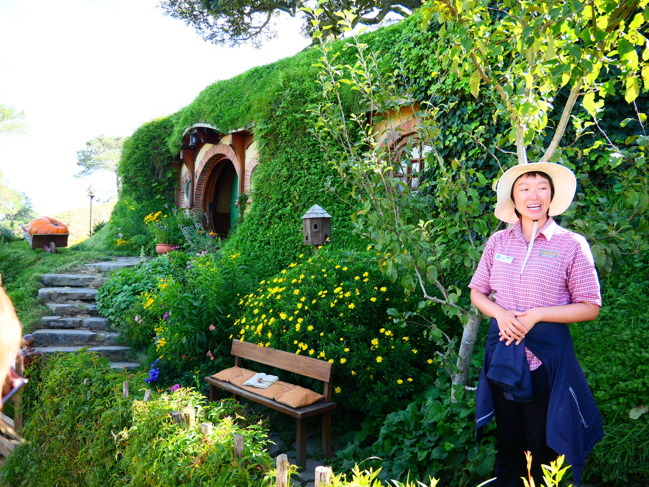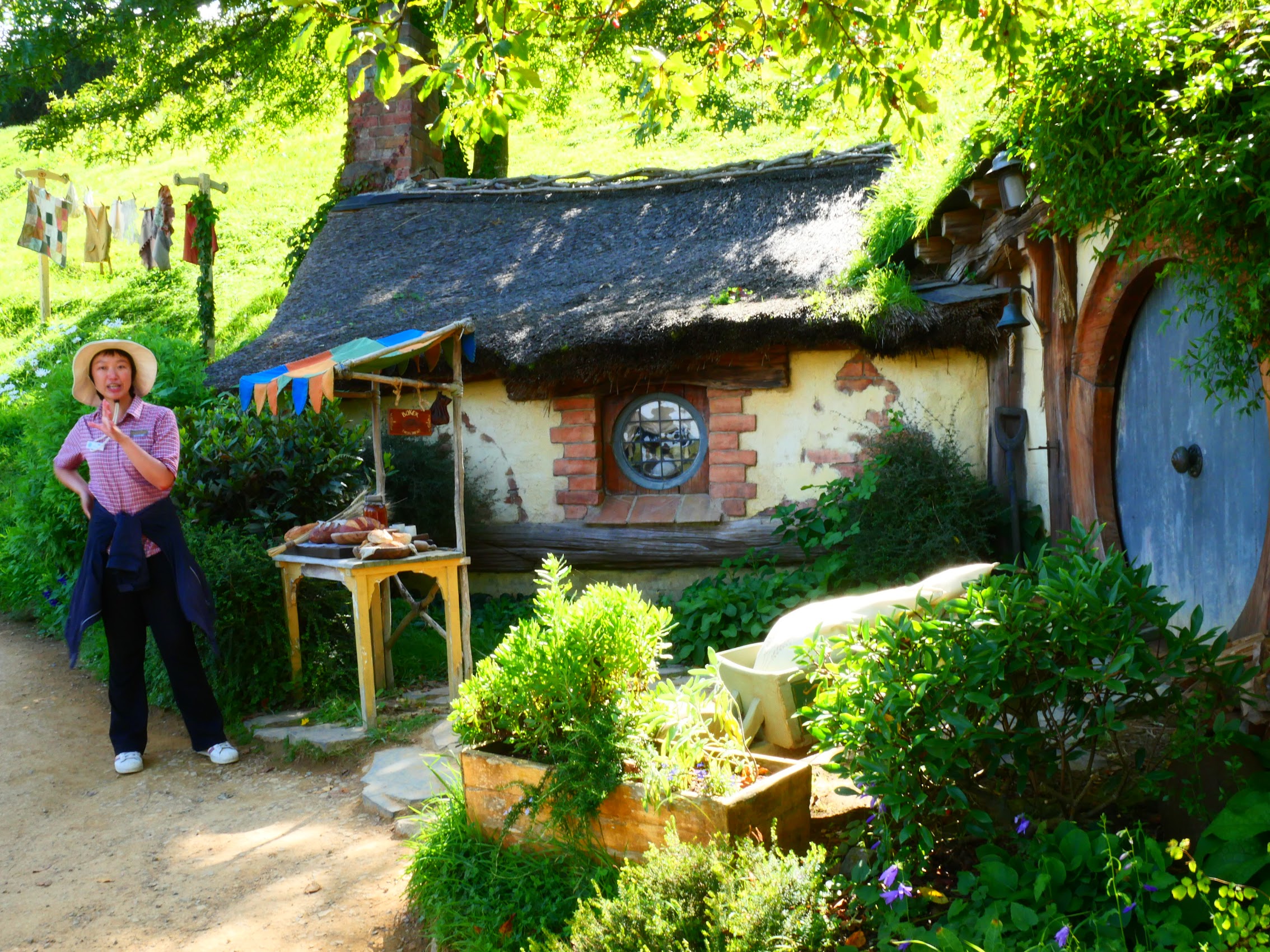Our shuttle dropped us at the end of a trail which we followed down into a shallow valley and then, suddenly, Hobbiton lay before us with Hobbit holes lining the valley (a total of 44 of them, most of which are just facades), and Bagshot Row with Bag End (the hole where Hobbits Bilbo Baggins and later Frodo Baggins resided) at the top of the hill. We made our way through, stopping at select locations so that Athina could tell us about both the place and how it was created.