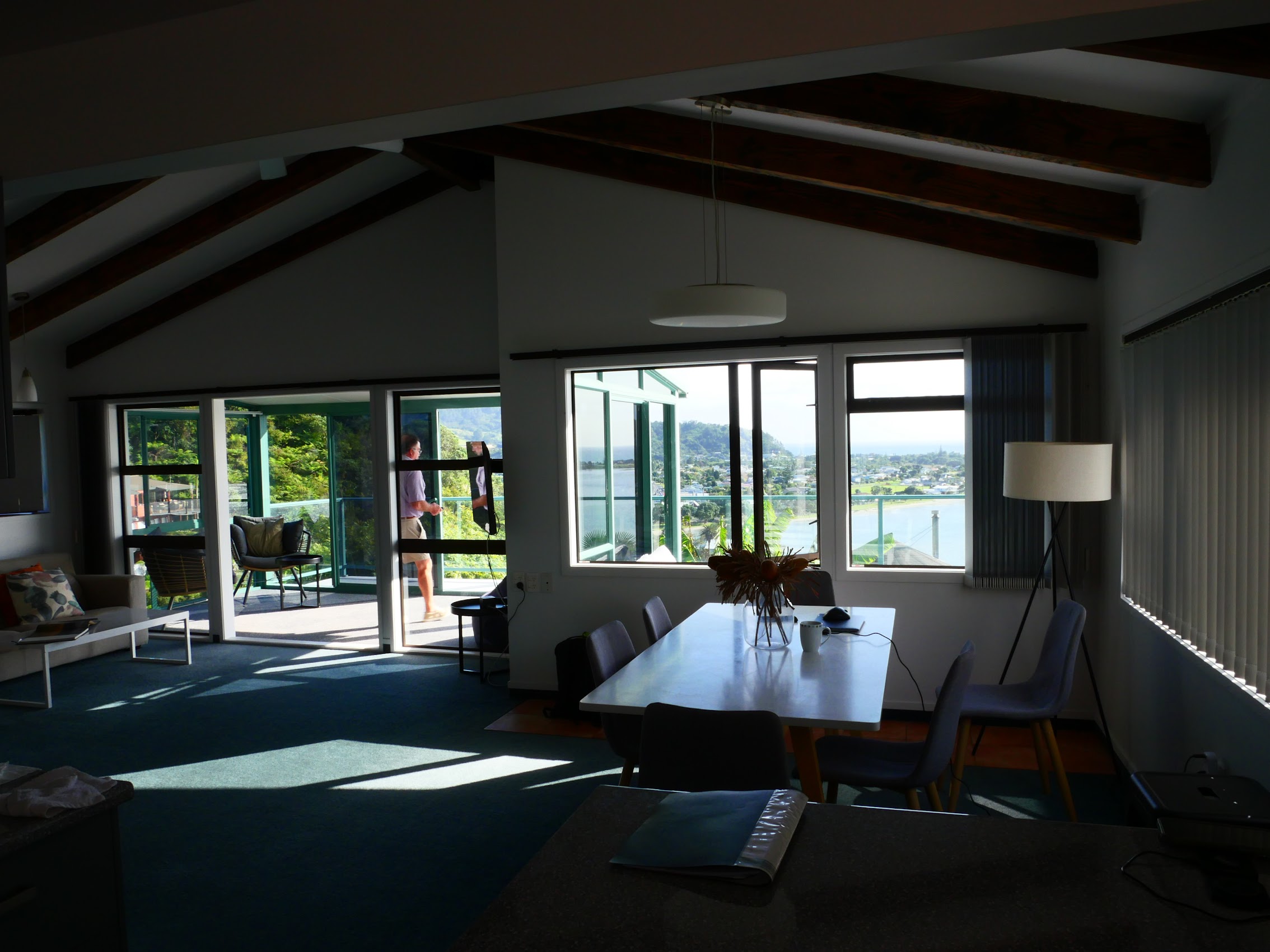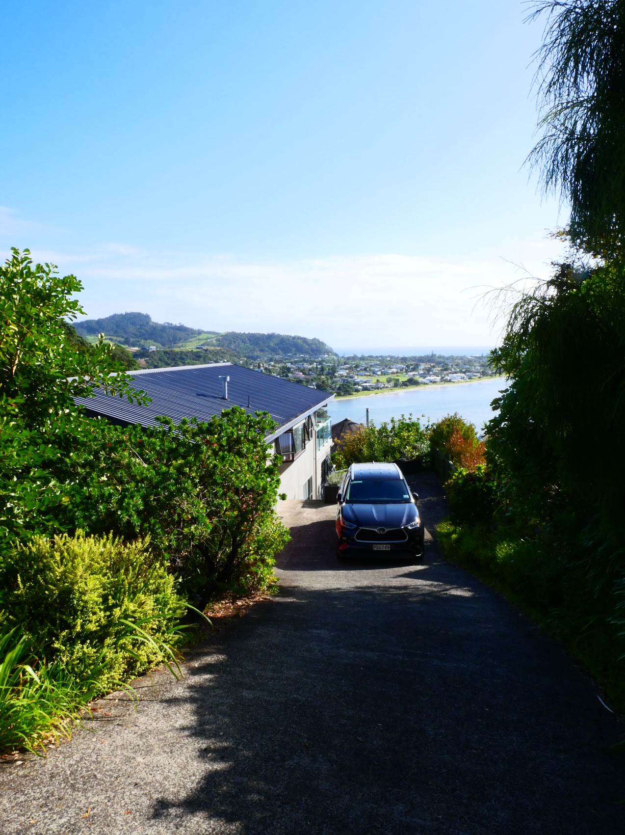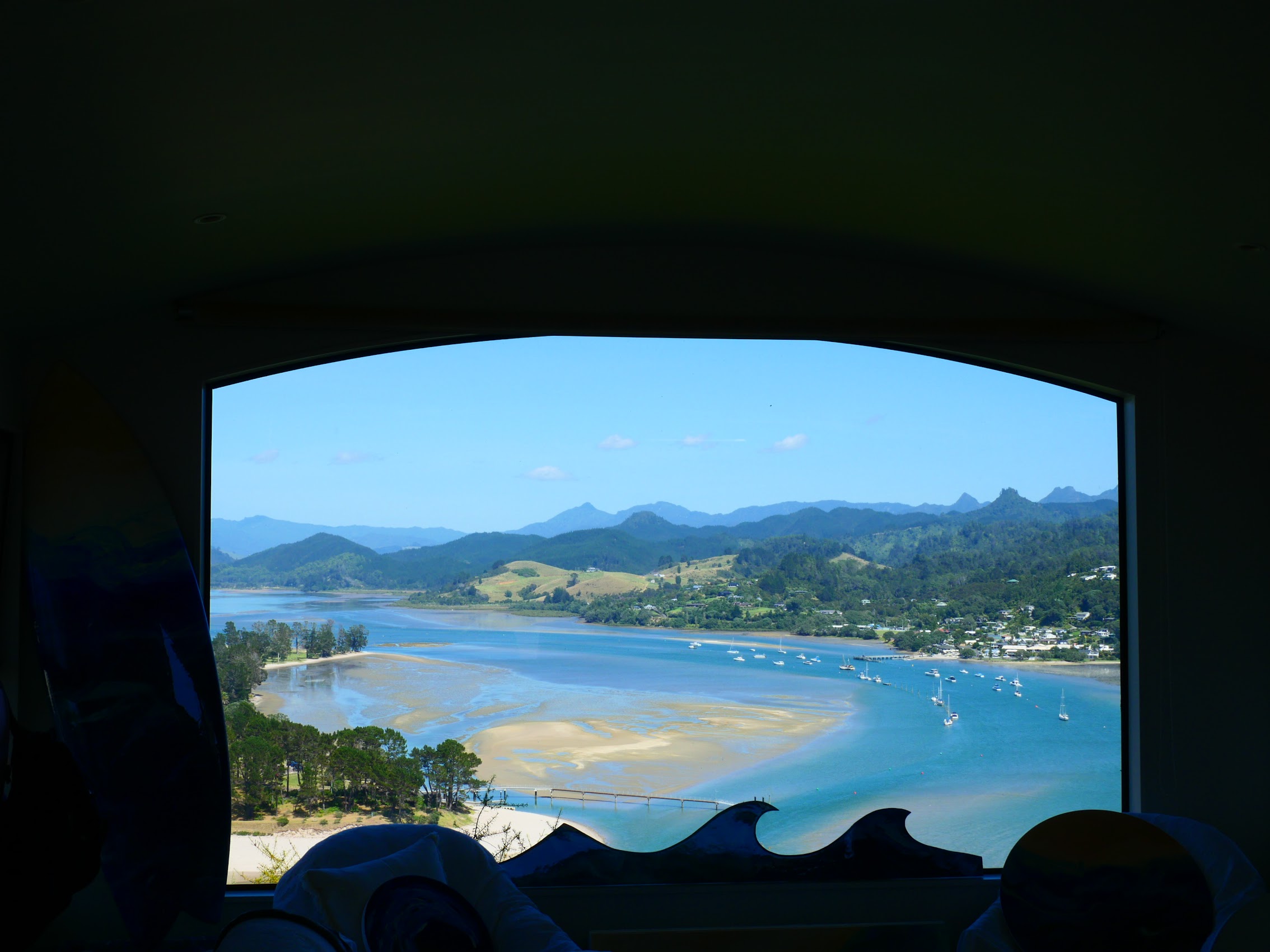 Our drive from Hobbiton to Tairua was again a beautiful one, back across the farmlands of the central North Island with the peaks of the peninsula looming in the distance. The final leg through the Tairu River valley into the bay was particularly spectacular. We arrived at our stay just before sunset after driving up one very steep road then backing down a very steep driveway (which Colleen handled quite well) where we were immediately struck by the views.