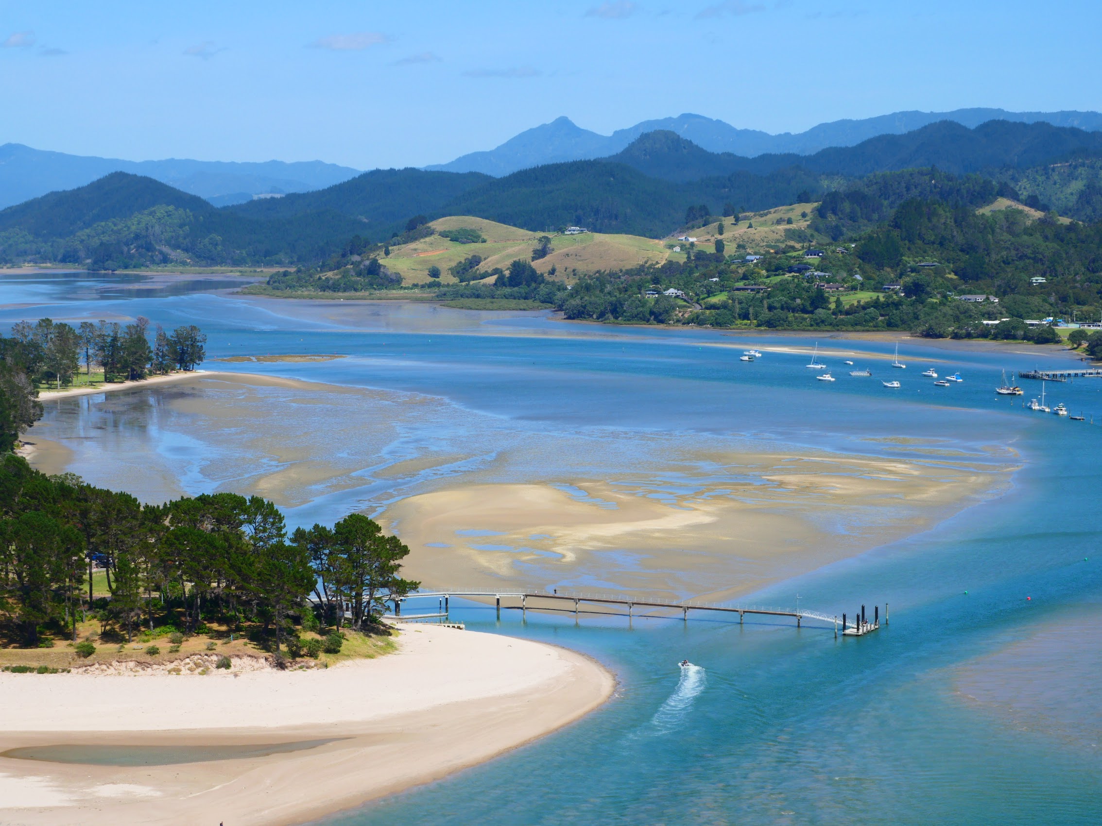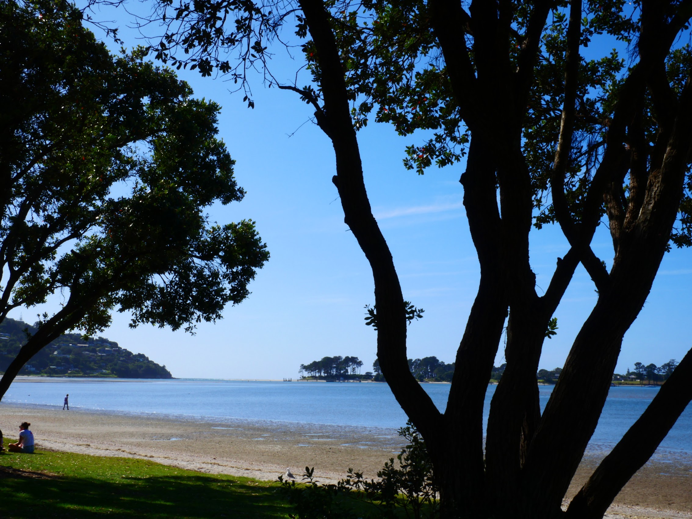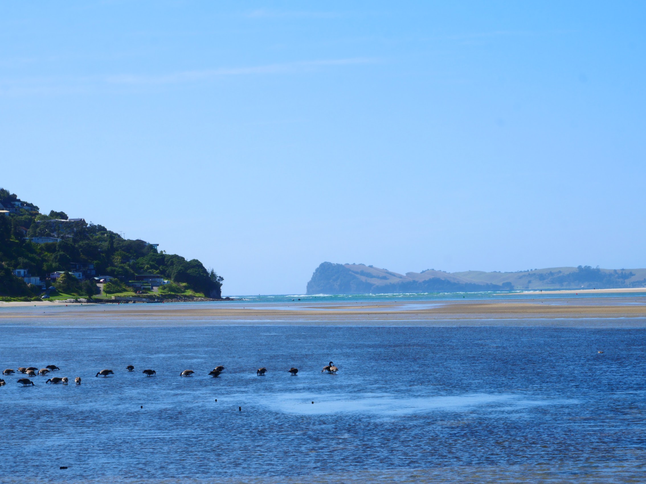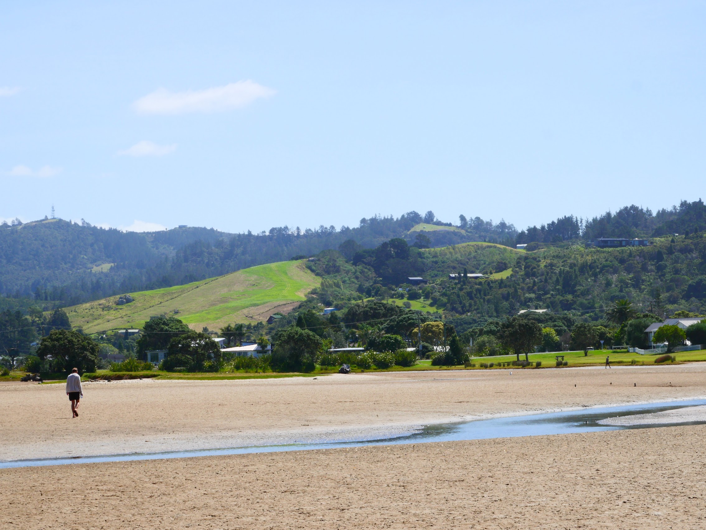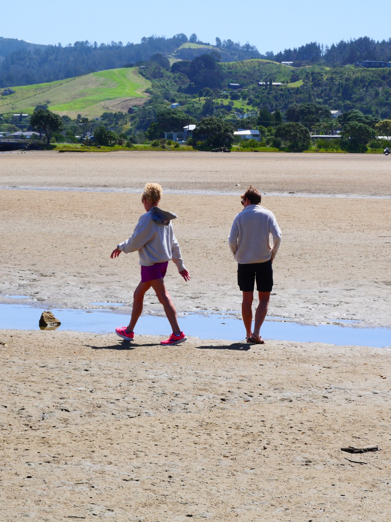 We made our way back down and stopped at a place we had spotted at the bottom of Mount Paku, a place called the Old Mill Waterfront Café, where we had some drinks and lunch. From the viewpoint, we had noticed that what looked to be sand bars were appearing in the bay as the tide went out, and by the time we made our way back there, almost the entire bay was sand. Because of this, we were able to walk back across the bay rather than around it, thought we did have to cross a couple of streams.