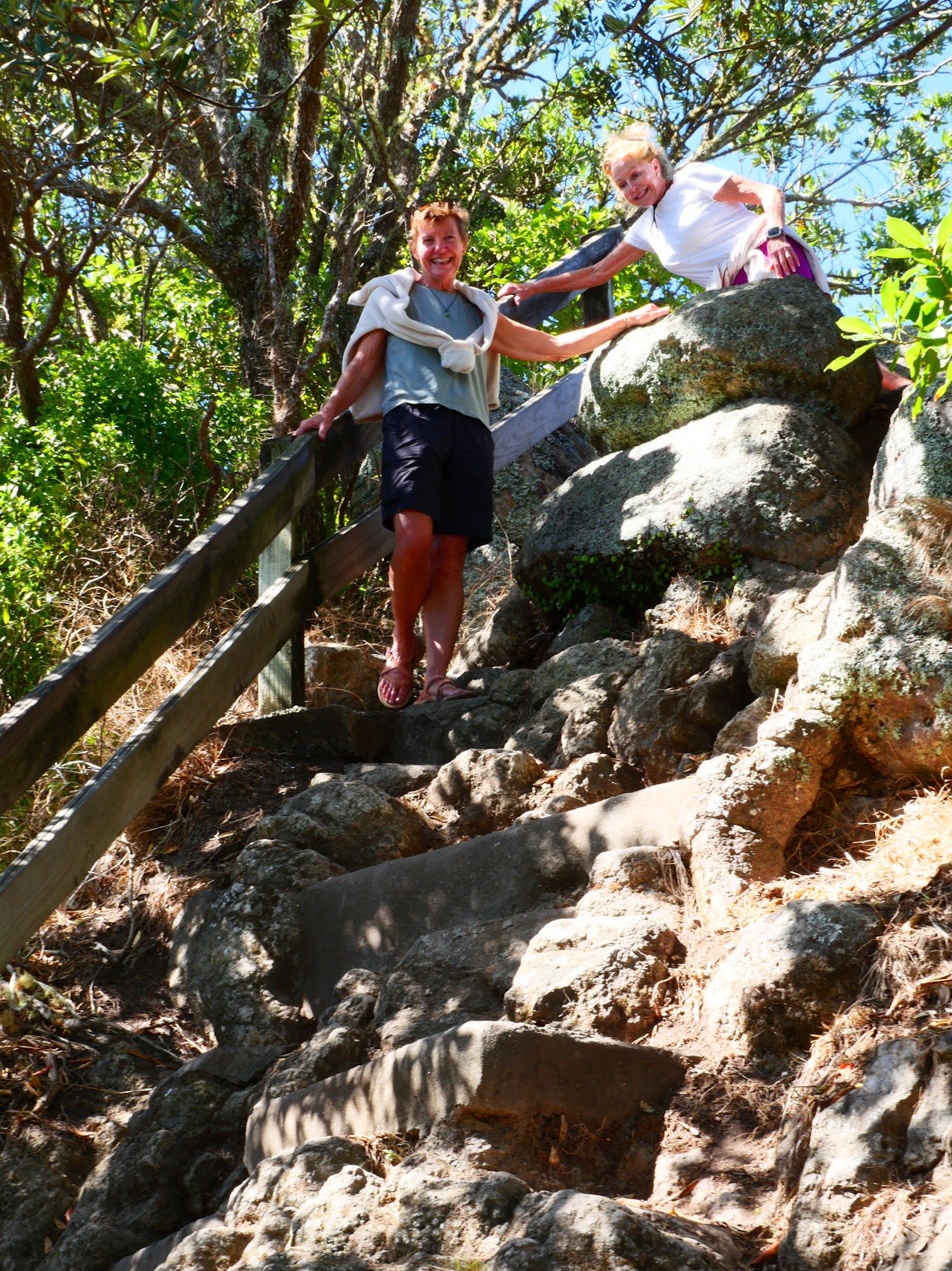 Although we hadn’t really planned on going there, the draw of the viewpoint we believed to exist at the top of Mount Paku was irresistible and we inevitably made our way around the bay and up the roadway which winds its way back and forth across Mount Paku with the views of the bay below getting better and better at each turn. The roadway ended at a step path which became a trail and eventually a scramble up a rocky slope which leads to the summit. The views of the surrounding area from the summit of Mount Paku were spectacular and we lingered there for a bit before making our way back down.