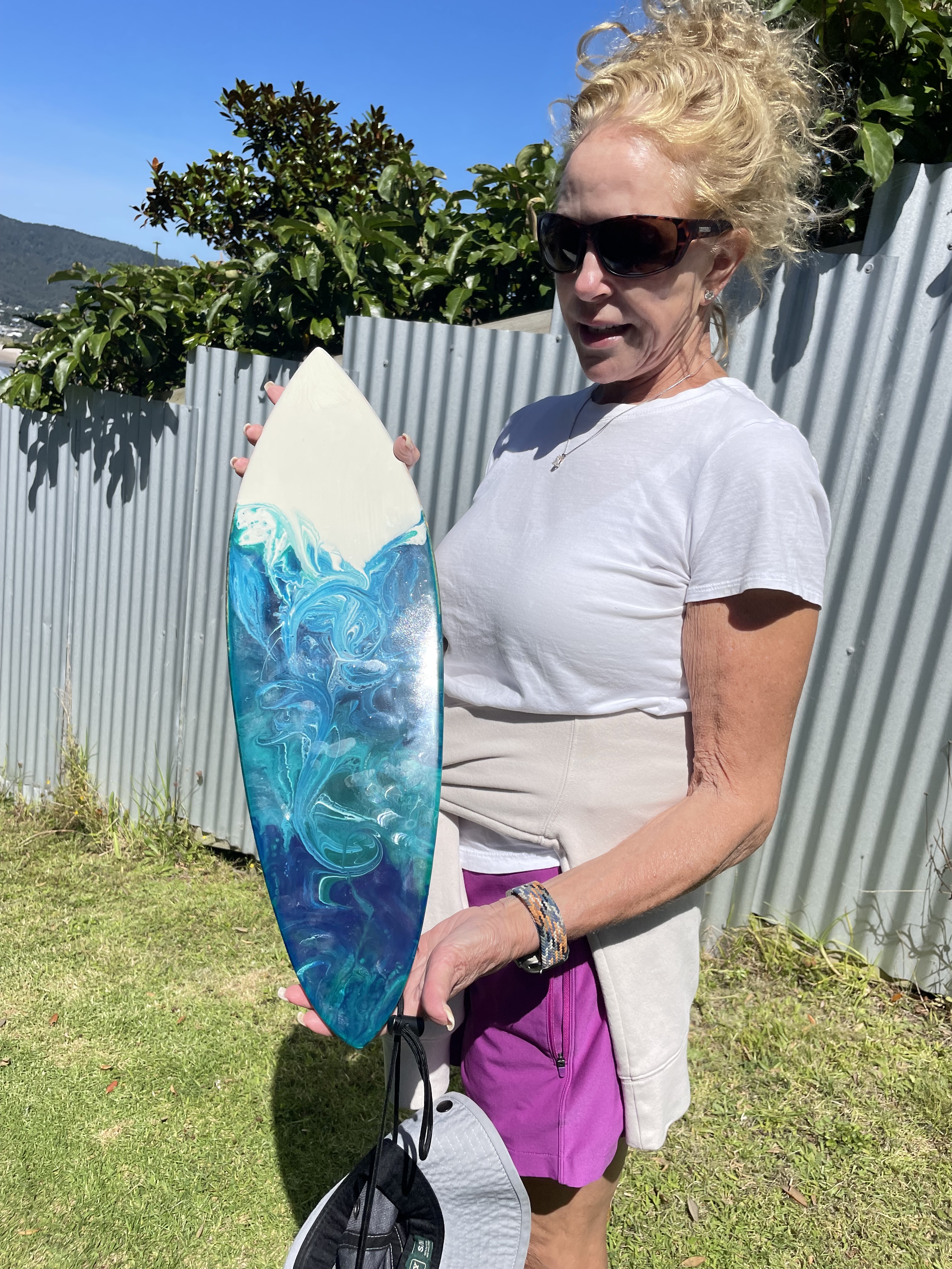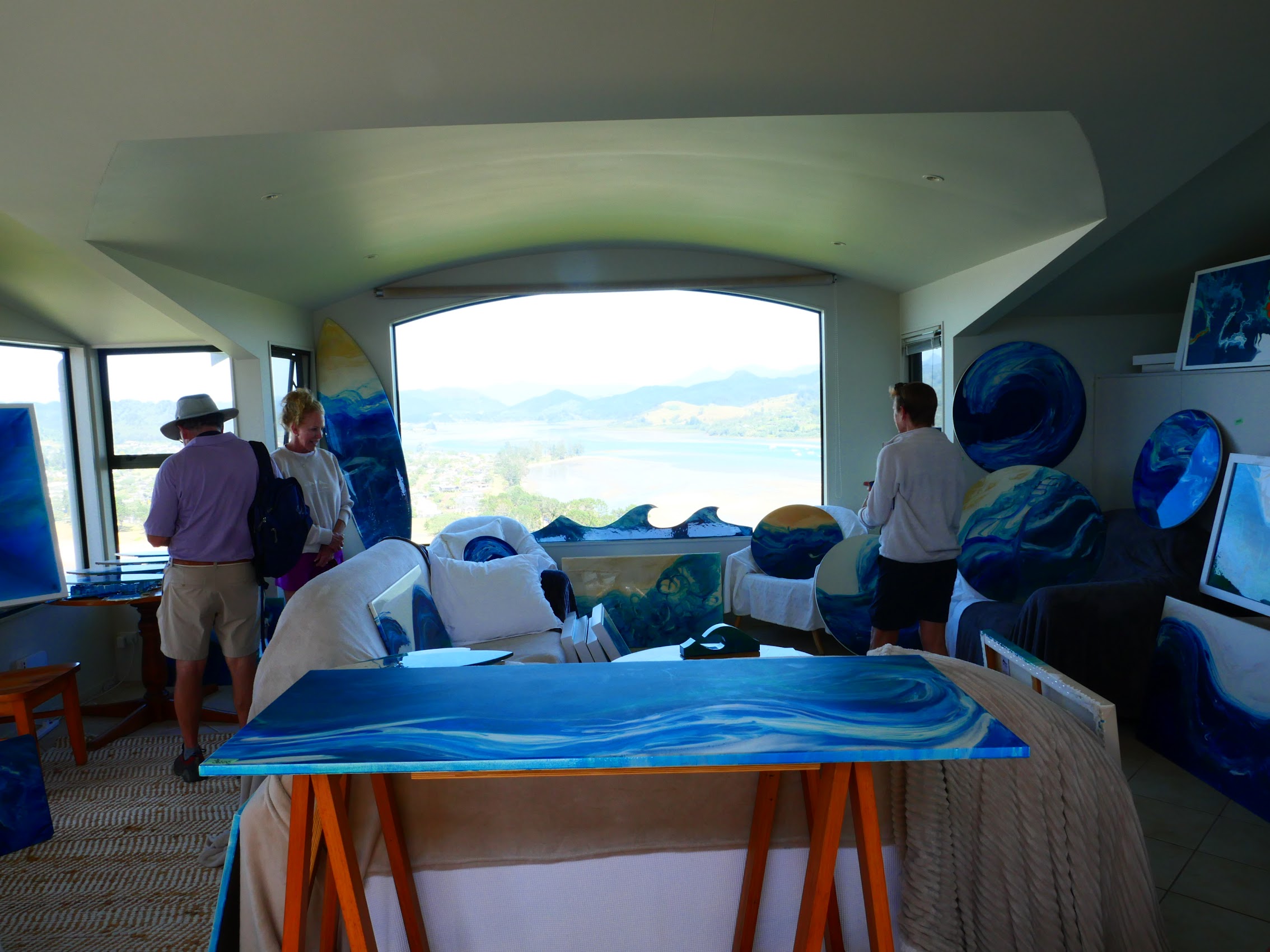 Back at the roadway, we stopped at an artist’s studio we had passed on the way up (mostly to check out the view). The studio, called Swell, is owned and operated by Christina McGrath, an American from Southern California who settled in Tairua (at least for now) after travelling the world a bit. Christina’s paintings and other art work are inspired by the ocean and (no doubt) the amazing view of Tairua Bay from her studio. After admiring some larger pieces, the Maddens purchased a beautiful mini-surfboard painting which seemed small enough to fit in their luggage.