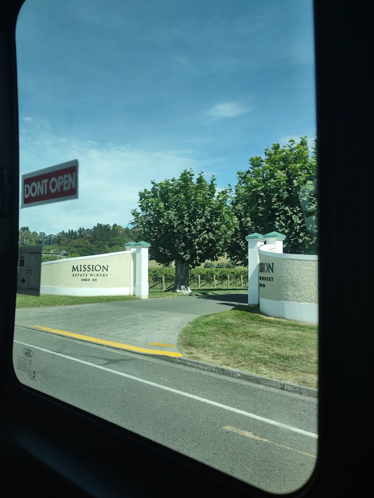 One of the excursions we had booked in advance of our trip (by consensus) was a wine (and gin) tasting tour. The Hawke’s Bay wine region is New Zealand’s oldest and second-largest wine-production region, so we were pretty excited at the prospect of tasting some good New Zealand wine and gin. The tour we booked included pick-up and drop-off from our place and, after picking up some other participants, we proceeded to our first stop, the Mission Estate Winery, located only 15 minutes away on the west side of Napier.