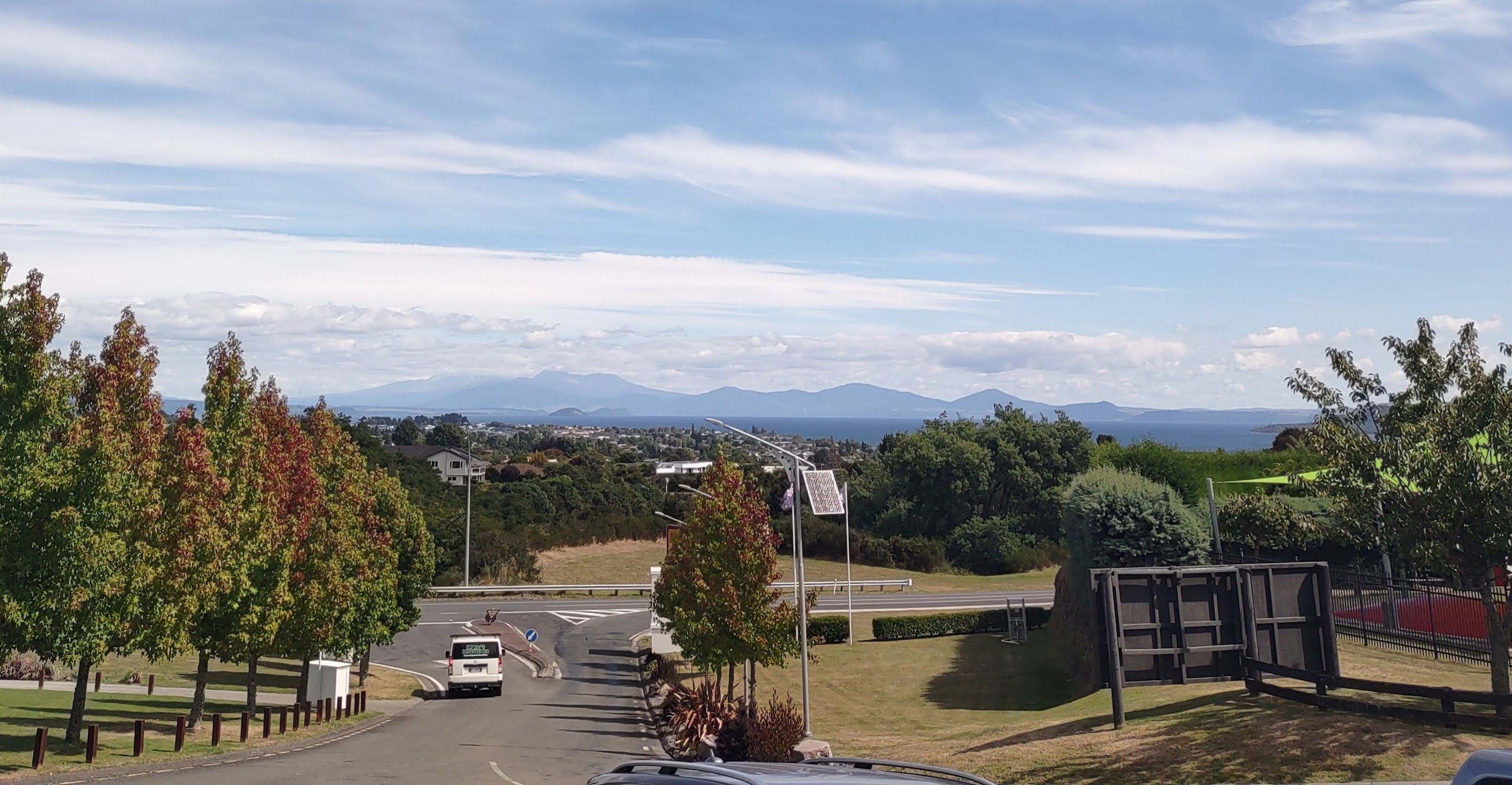 We stopped for lunch in the town of Taupo which sits on the shores of its namesake Lake Taupo, a crater lake located in the caldera of Taupo Volcano, and the largest lake by area in New Zealand. From our lunch spot at the Hilton Lake Taupo (Denny’s choice) we enjoyed views across the lake to the volcanic plateau on its southern shores.
