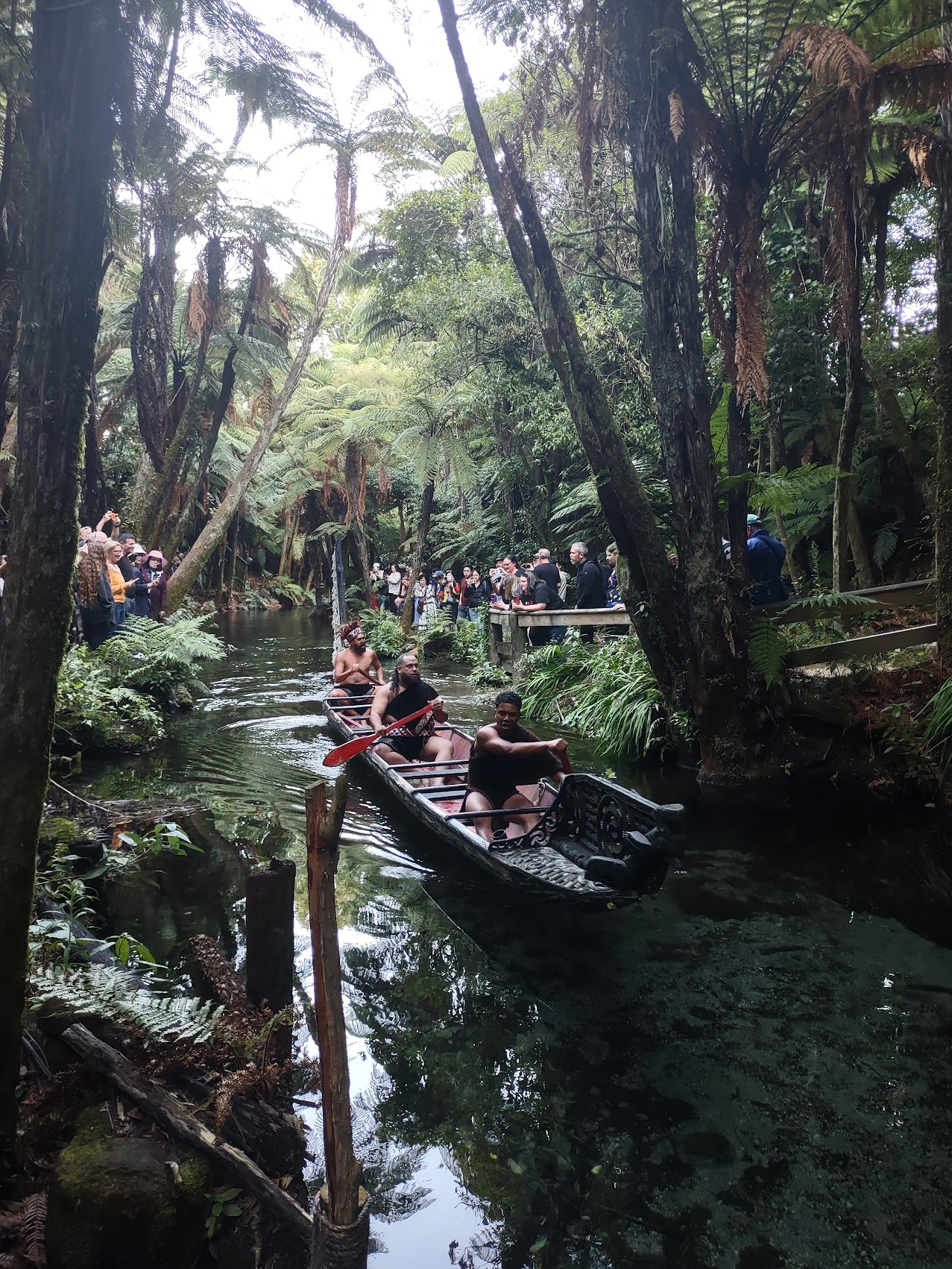 While final dinner preparations were being made, we were led down jungle paths to a sacred freshwater spring, Te Puna Tapu a Tuhoe, where we awaited the arrival of warriors paddling down the Wai-o-Whiro stream in a traditional war canoe (waka).