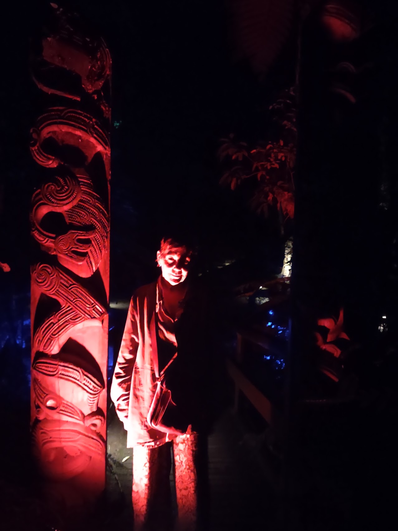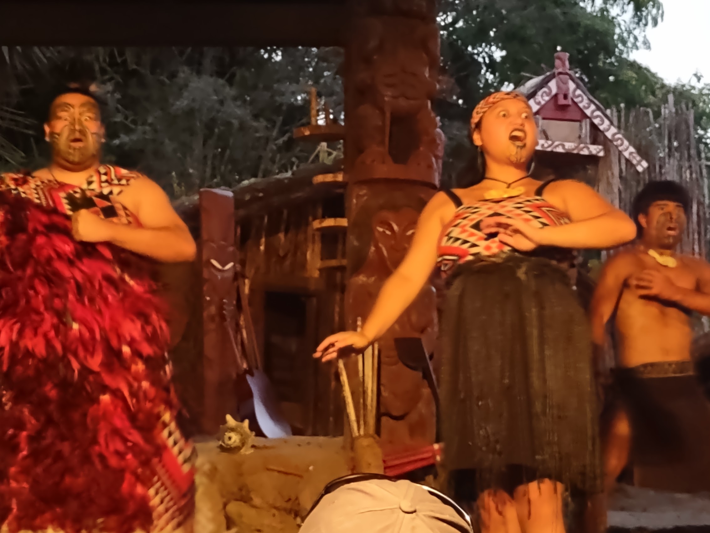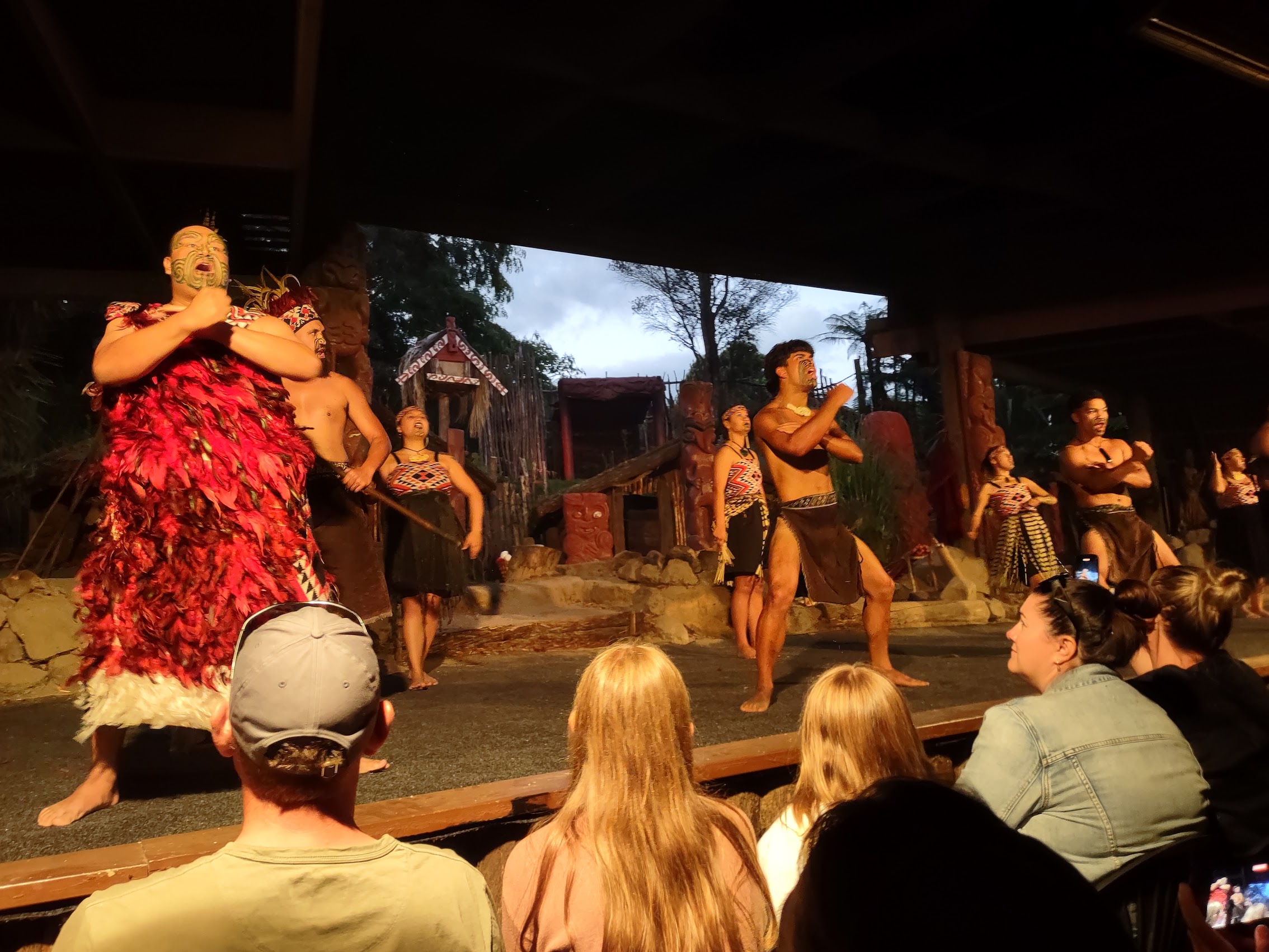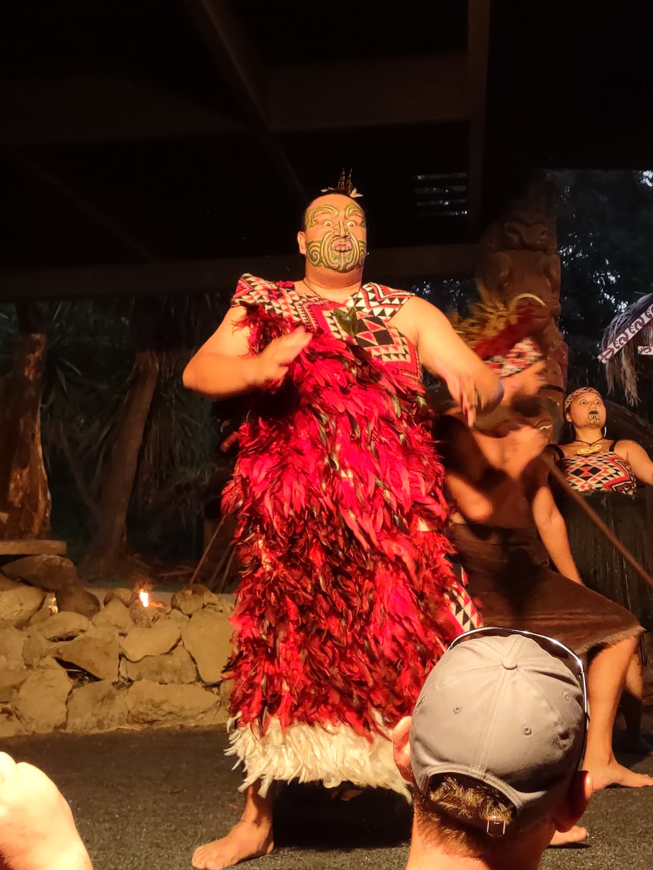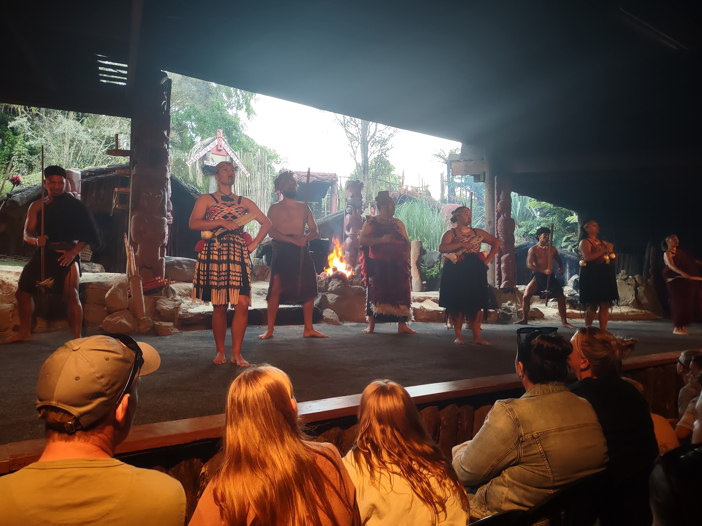Following a delicious dinner, we were led to a theater-like structure where we were treated to a series of performances (all accompanied with explanations of their historic and cultural significance), which included music (both instrumental and vocal), juggling of sorts (mostly weapons), and various forms of haka. The word “haka” itself means “dance” in Māori. While commonly known as a “war dance,” haka encompasses a wide range of forms and meanings, from displays of strength and unity to rituals of peace and respect. Historically, haka were performed to welcome visitors, celebrate important events, and challenge or intimidate opponents.