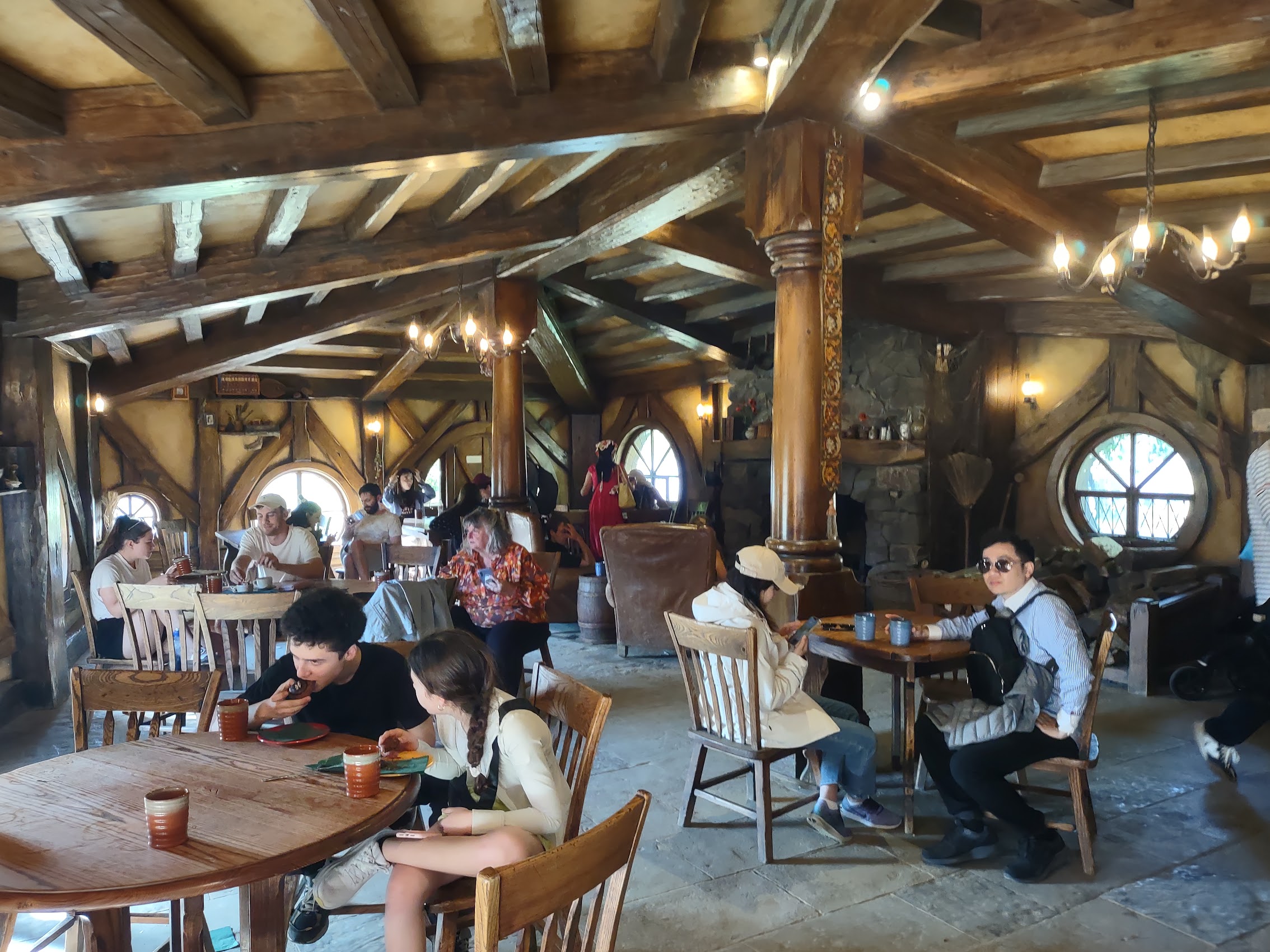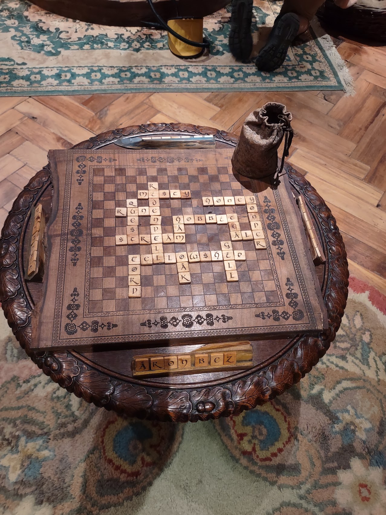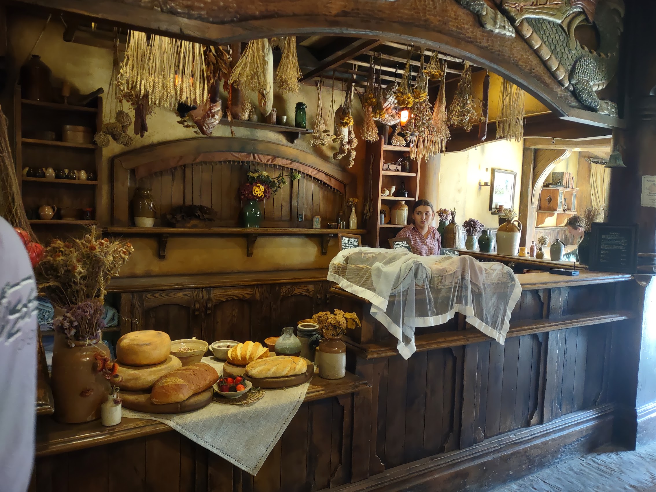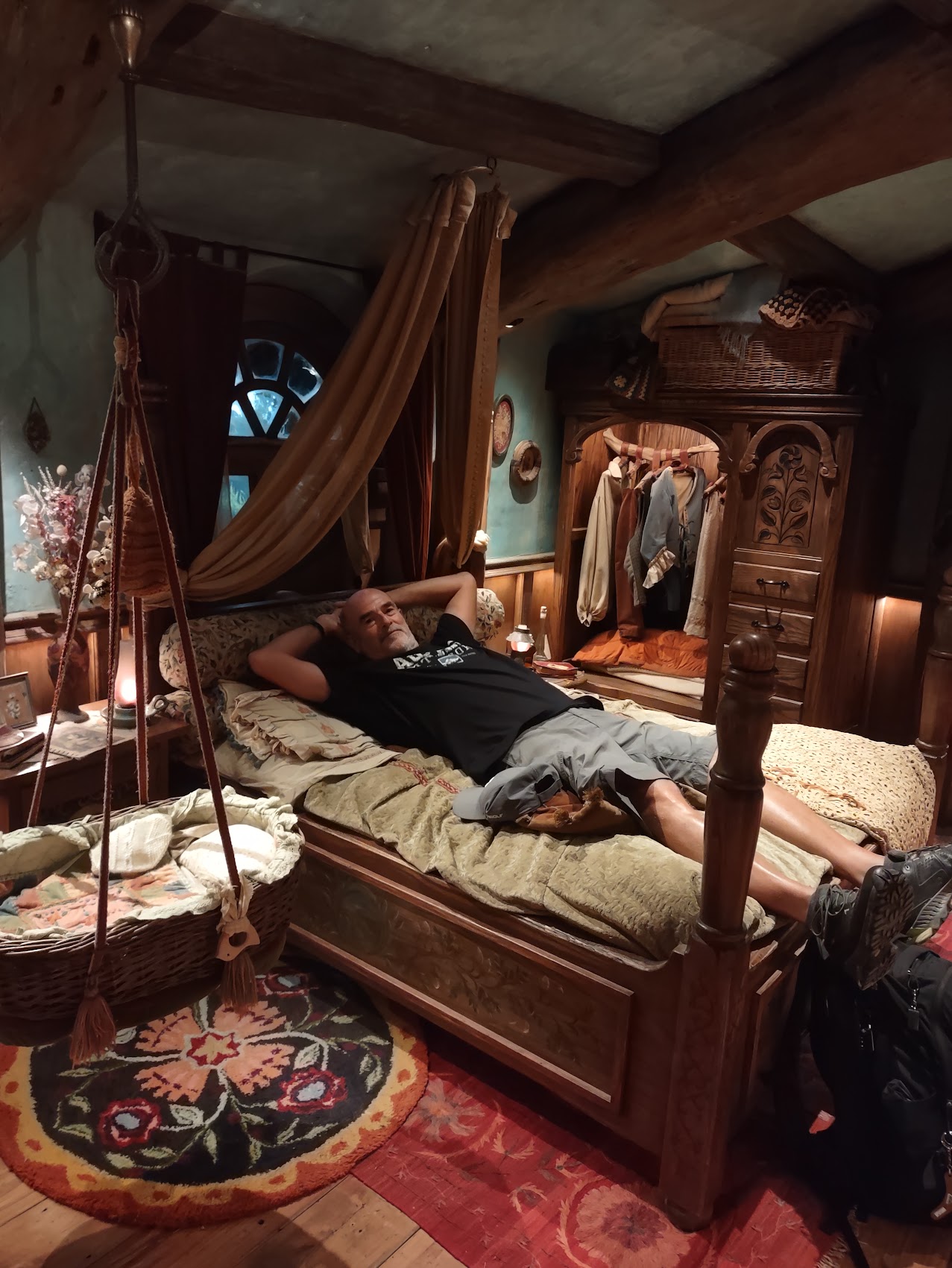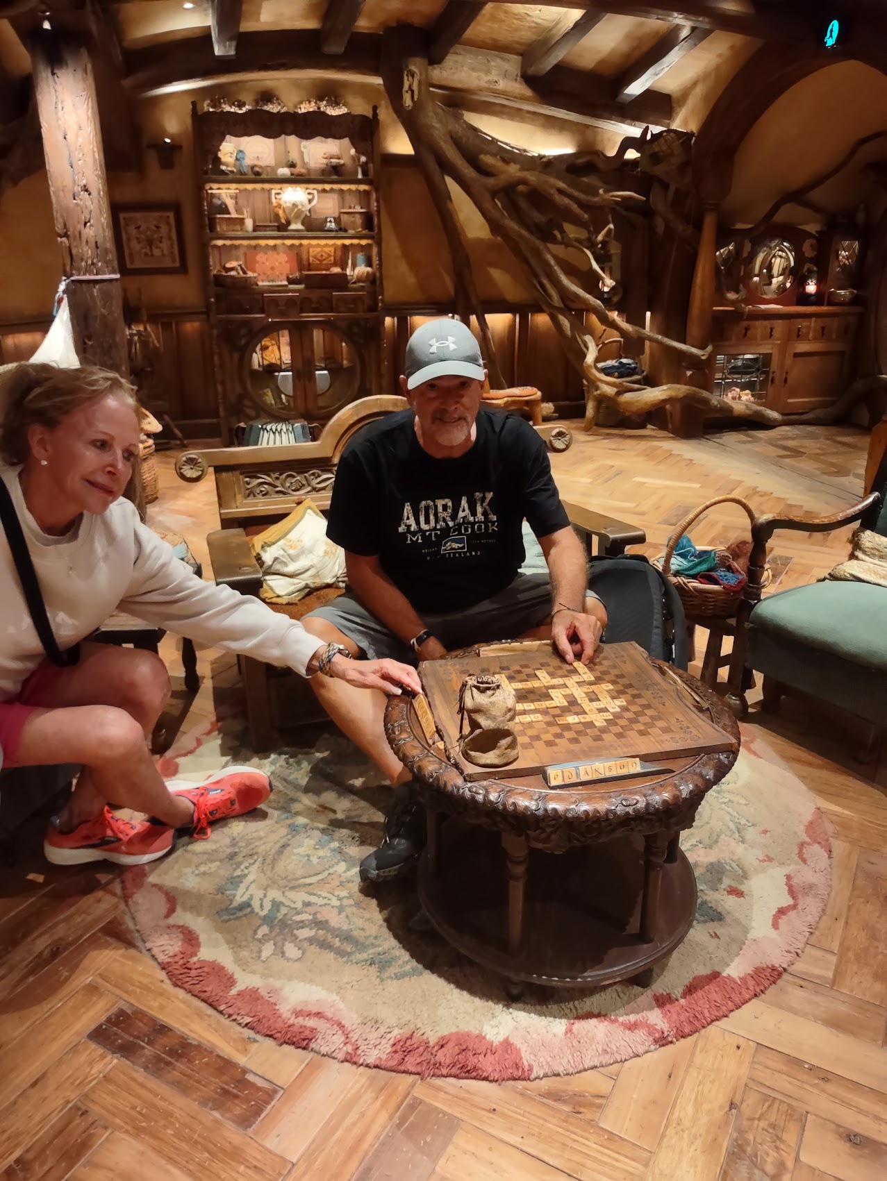 The set’s newest and most interesting attractions are two Hobbit hole interiors, which were opened in December 2023. (Not used for filming the movies – all of the interior hobbit hole scenes in the movies were filmed on sound sets.) While the ceiling heights were high enough for humans, all of the furnishings (including the beds!) were Hobbit sized. It was great fun wandering around and looking at all of the little details and furnishings (most of which were fixed in place) and we even had the opportunity to play a bit of Scrabble in Elvish!