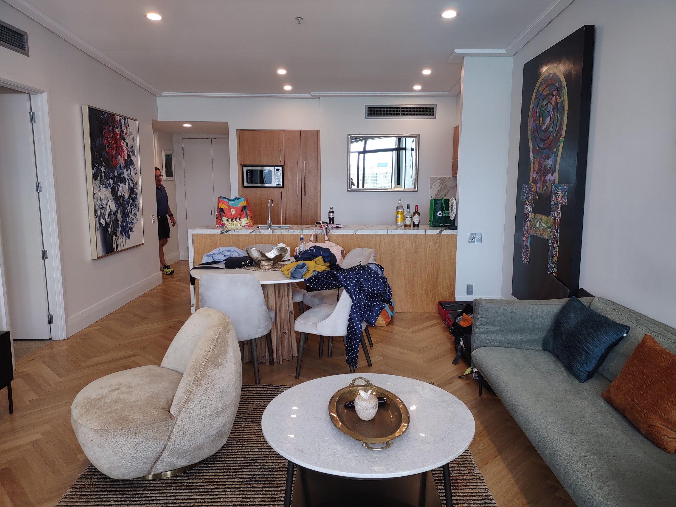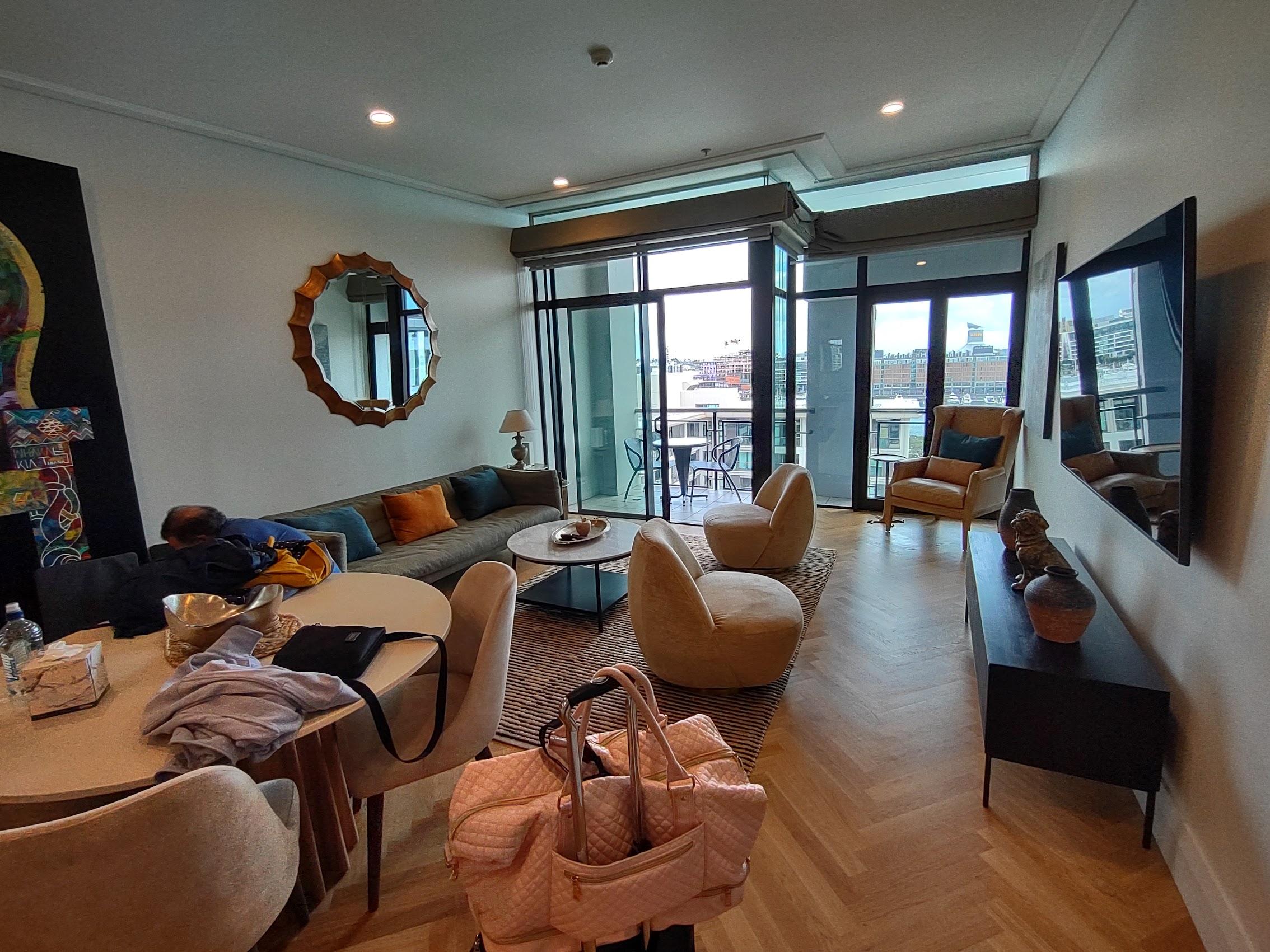 Due to some confusion over our respective itineraries, the Madden’s travel agent had booked a room for them at the nearby Park Hyatt Auckland, but we decided to all stay in the Penthouse as it meant having a common living space to hang out together on our last evening (also a bit less expensive than two rooms at the Park Hyatt). Ironically, the wonderful view of the waterfront from our penthouse included the Park Hyatt which was located directly across the harbor from us.