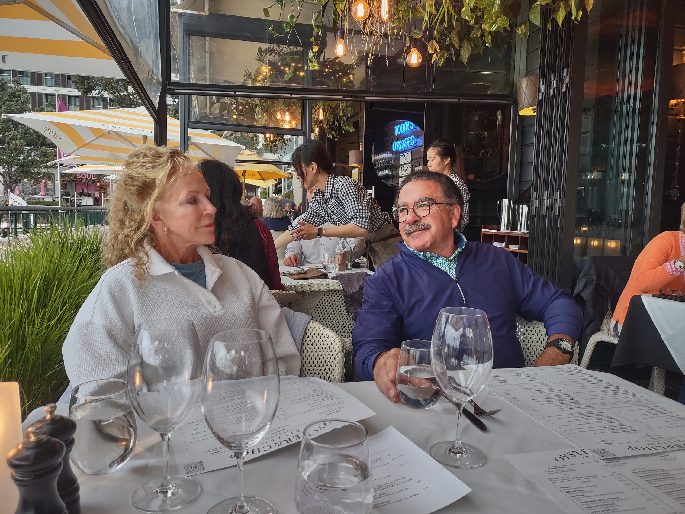 In 1982 a new ferry building was built next to it and a report released that year said that extensive renovations were needed to bring the Edwardian building up to earthquake and fire code standards. It was extensively restored and reopened in 1988. It now contains shops and cafes on the lower levels, including the Harbourside Restaurant where Denny and Wendy now took us. (They had been there for dinner during their layover in Auckland on the way to meet us in the Whitsundays.)