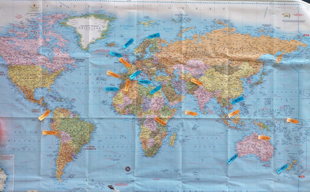 We started seriously considering this trip (along with what to do for the rest of our lives) in 2019. The first serious shot at an itinerary began during our first post-COVID trip to Little Gasparilla Island in October 2020. We unfolded a big Rand-McNally world map and played a game of alternately identifying places we would like to include in the itinerary. This was the result. (Colleen is orange and Ritchard is blue)